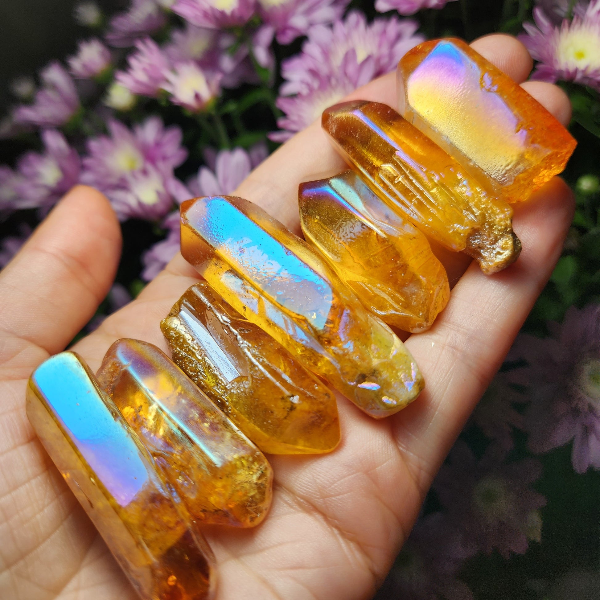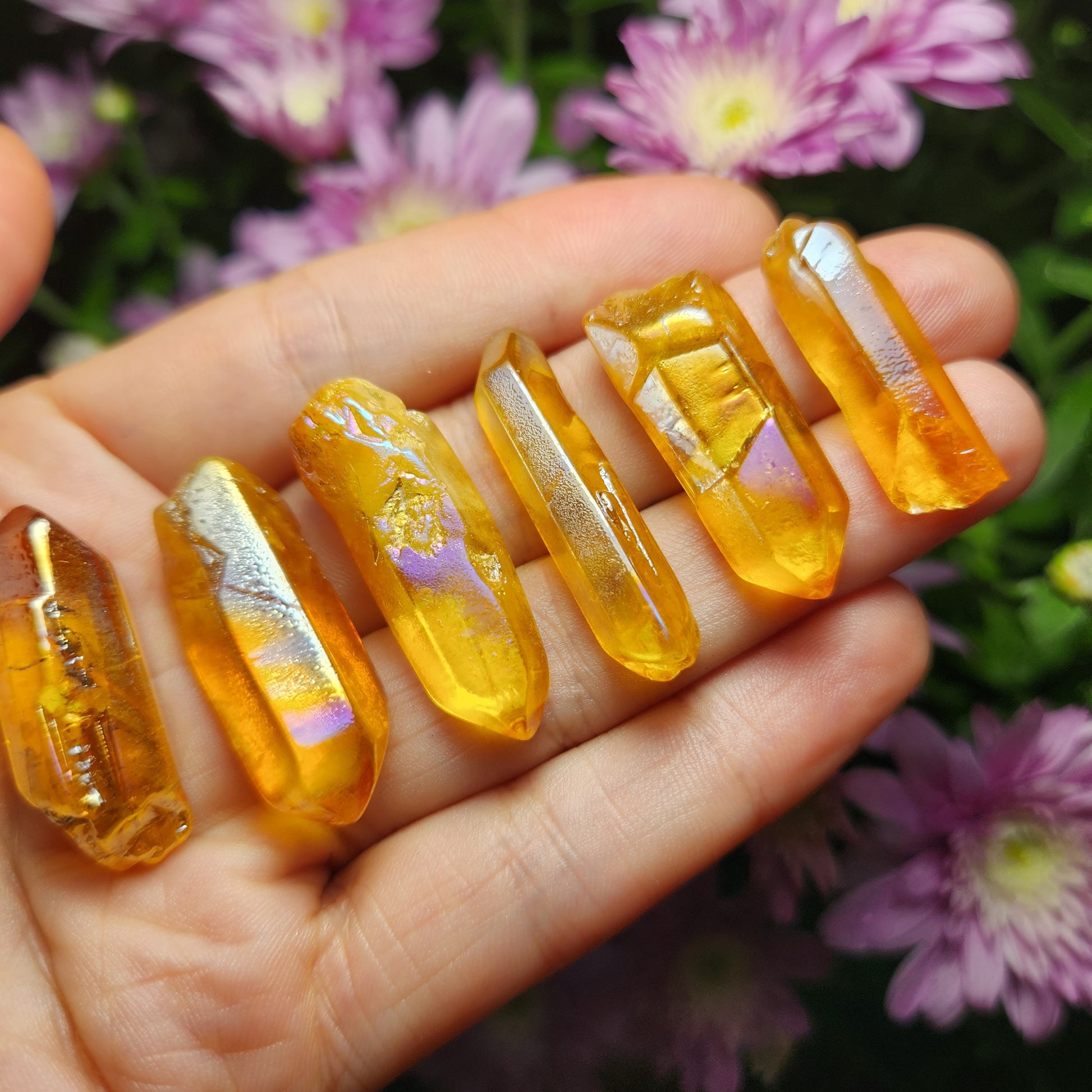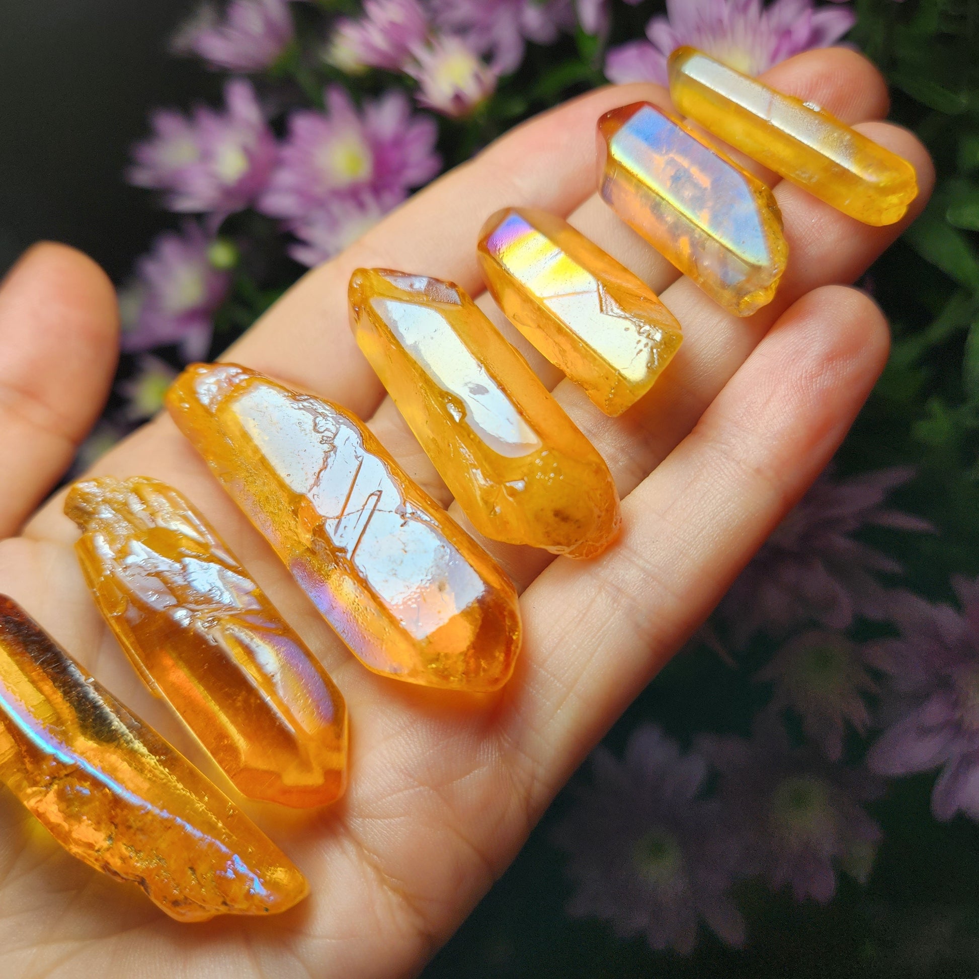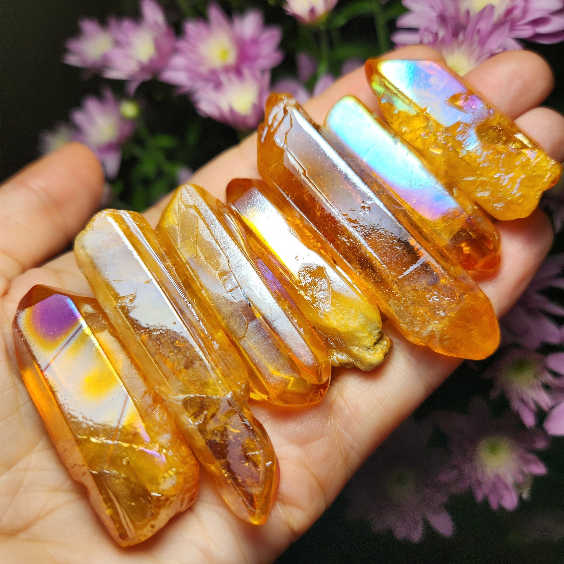 These Sunset Aura Quartz crystals have a light polish and exhibit a bright orange color with a pink sheen.