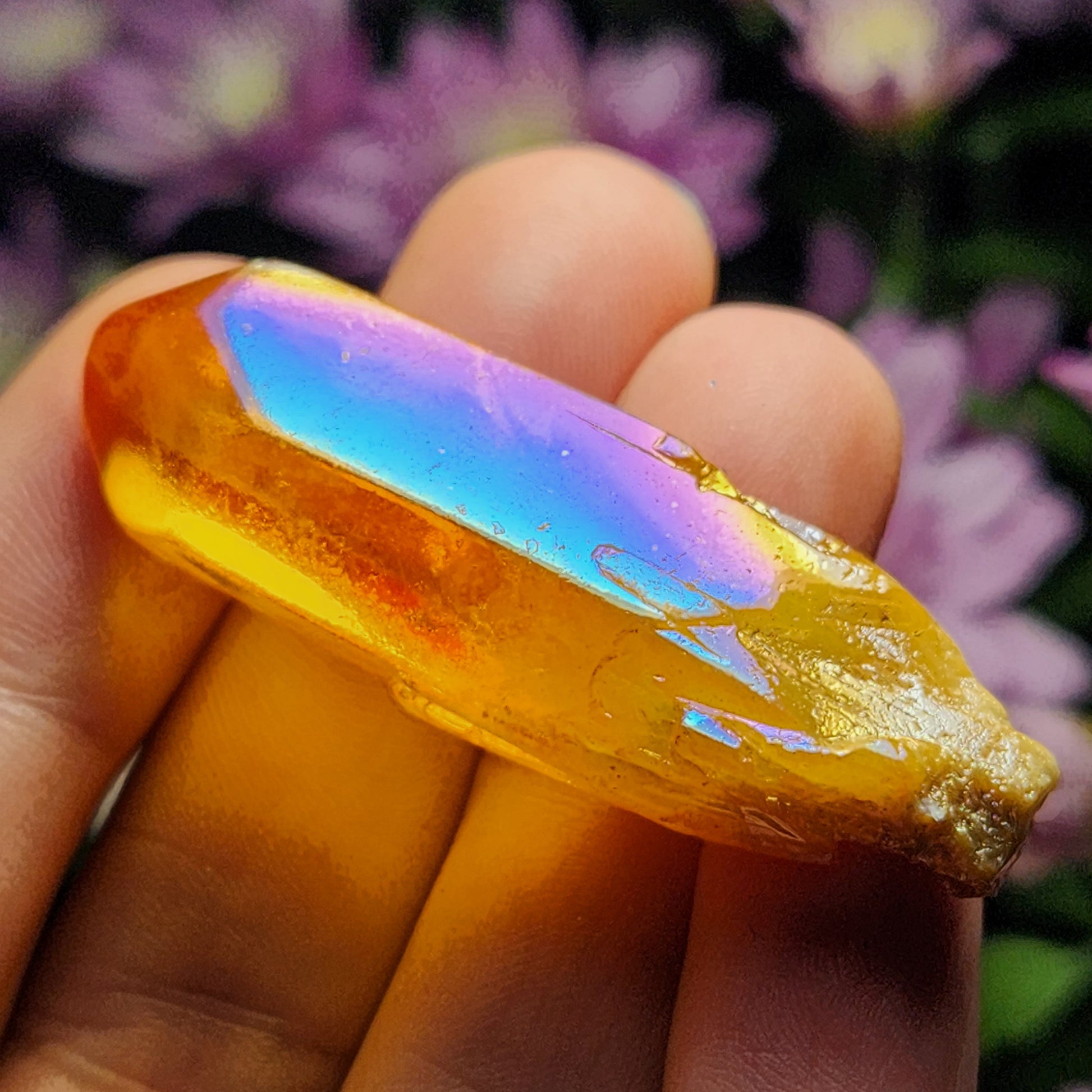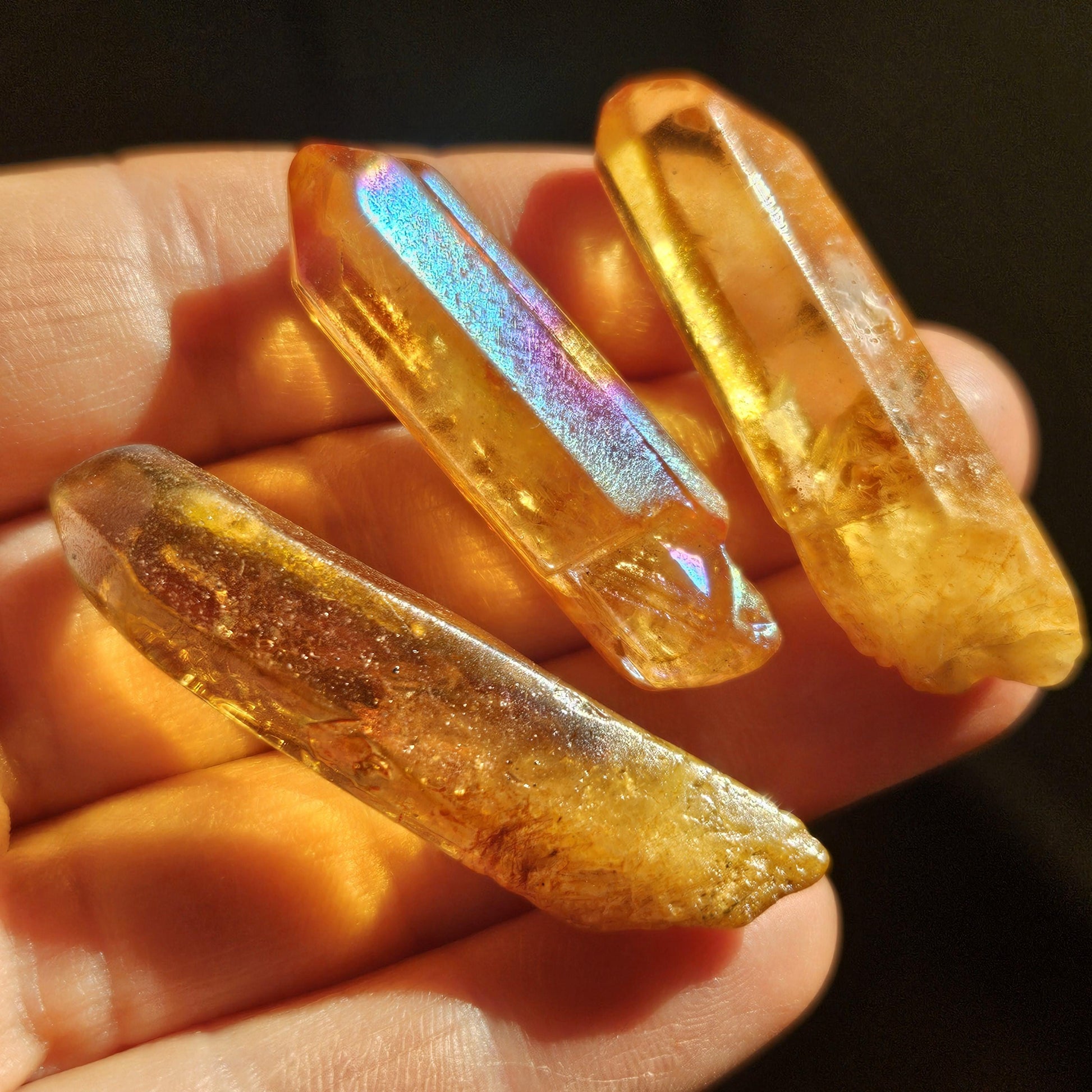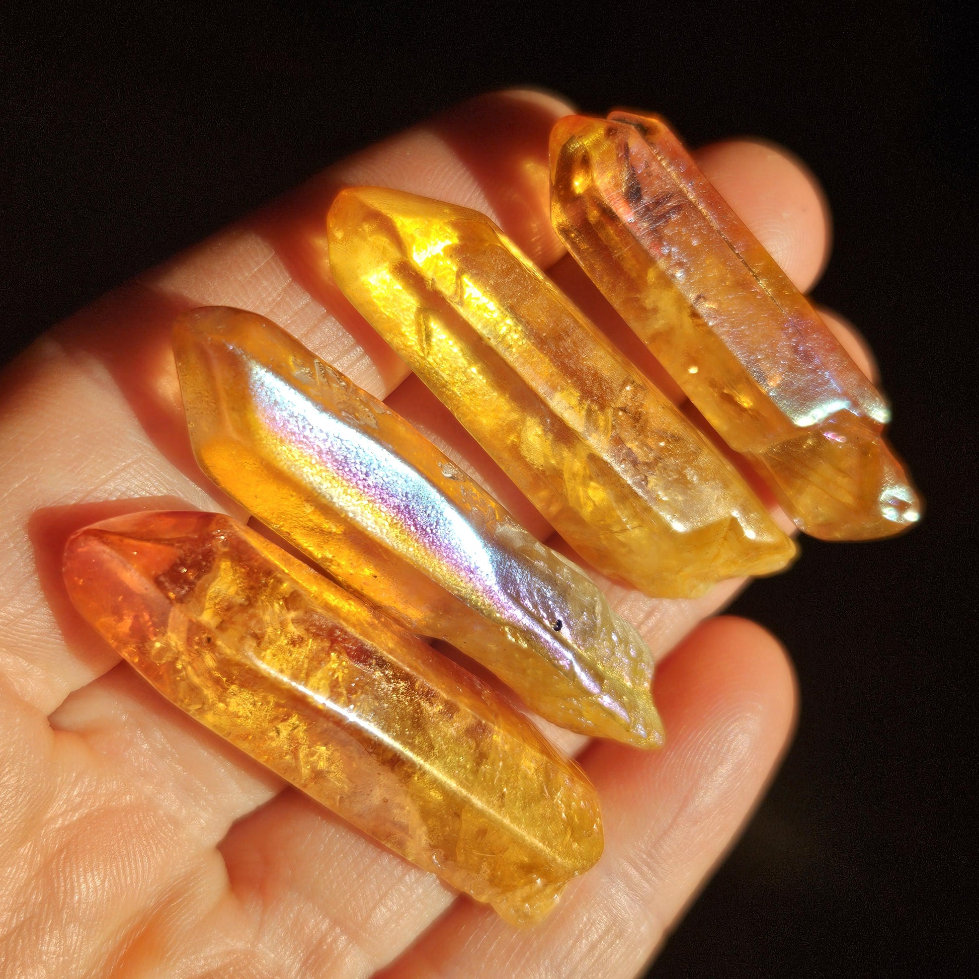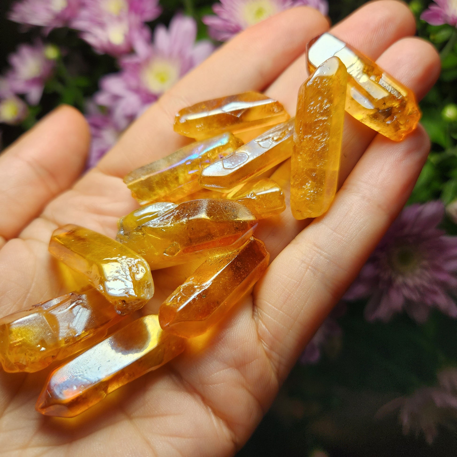 These Sunset Aura Quartz crystals have a light polish and exhibit a bright orange color with a pink sheen.