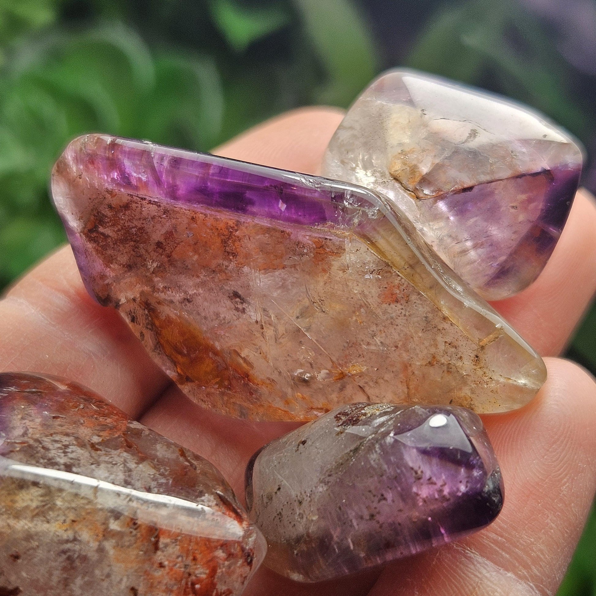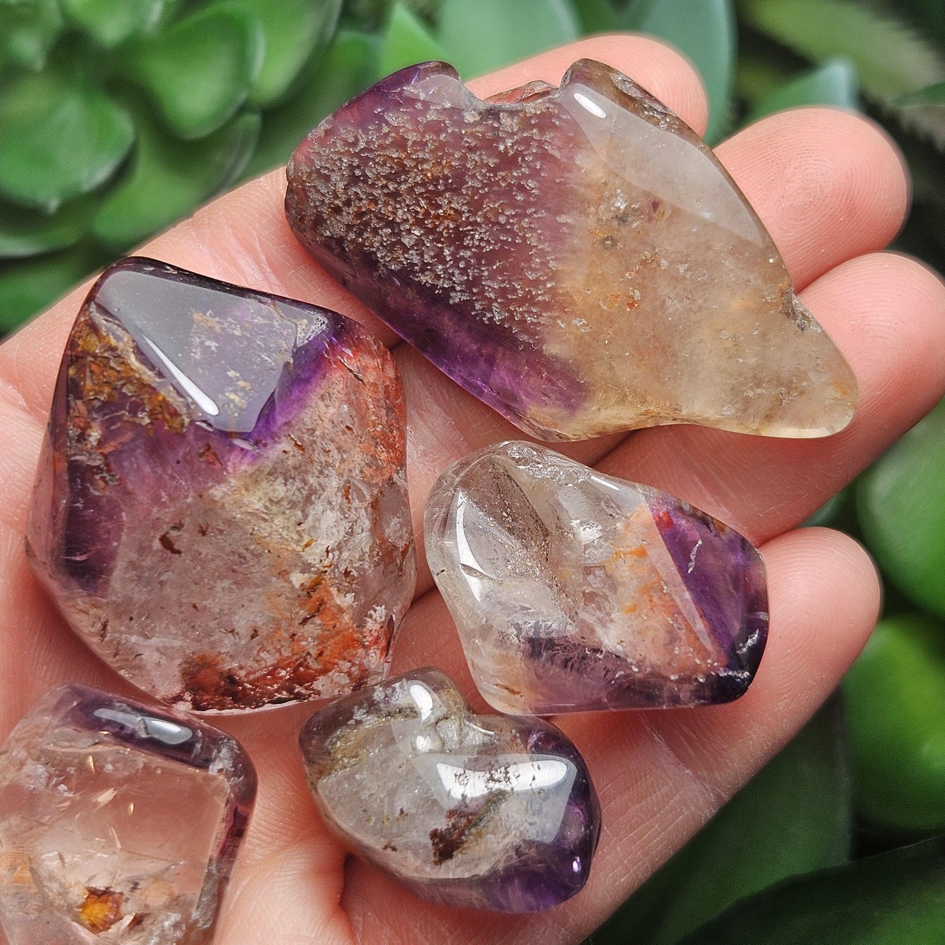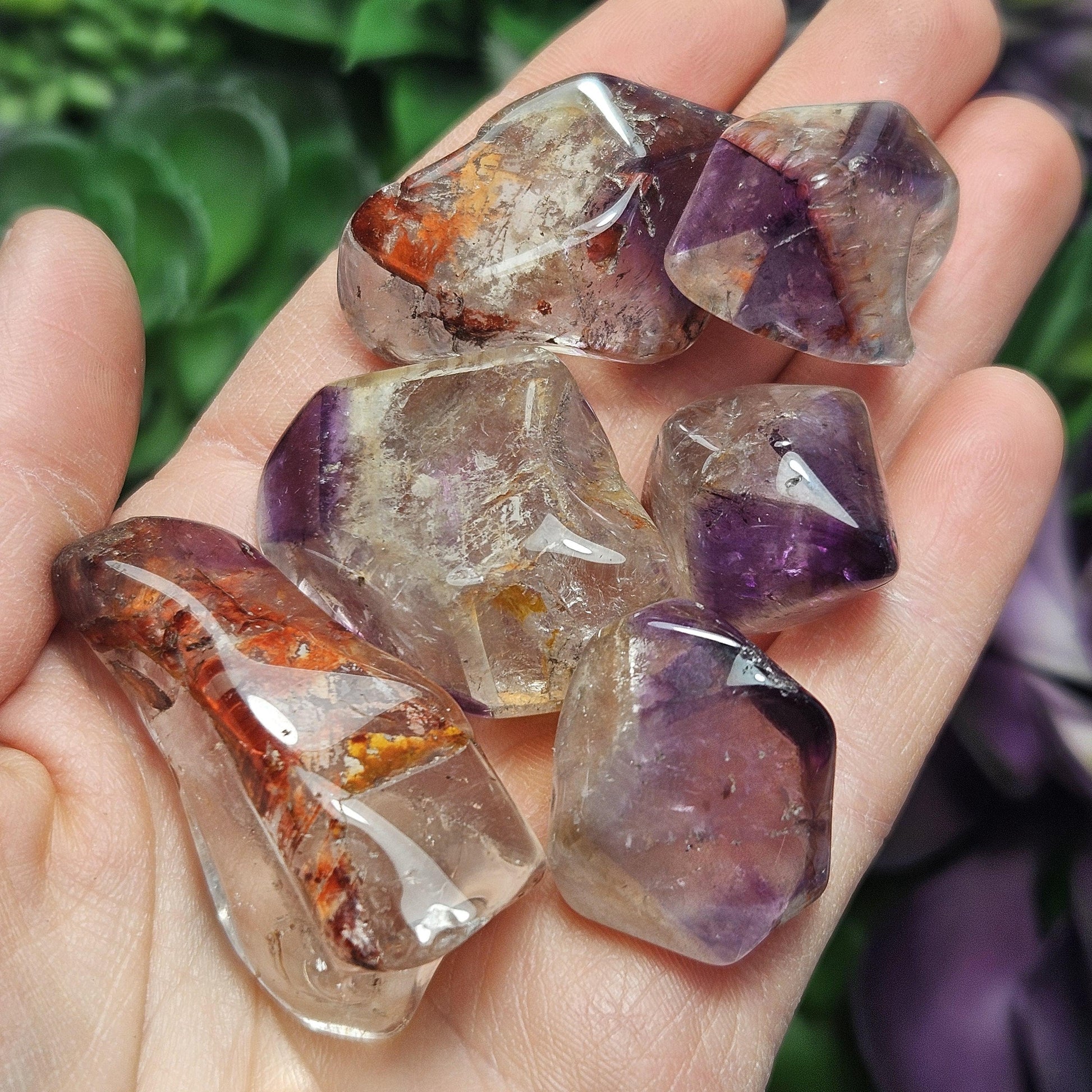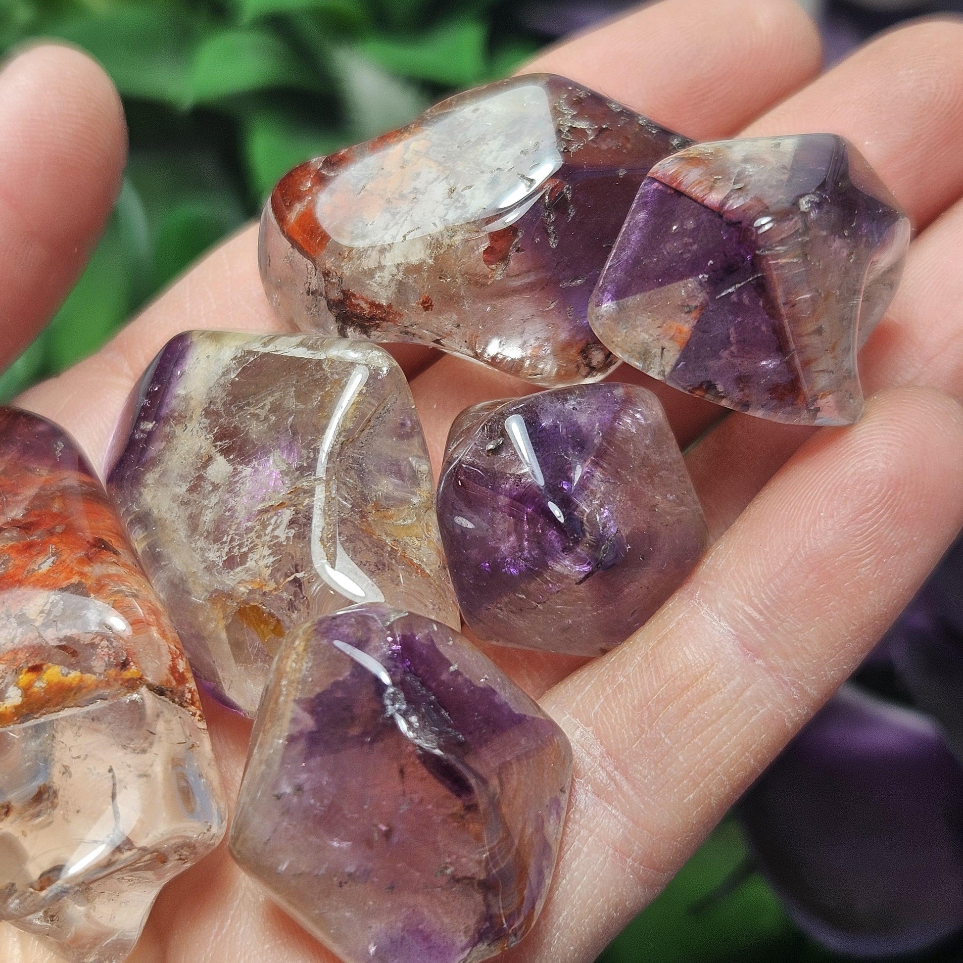We high graded the most vibrant and beautiful polished Super 7 crystals from a gorgeous lot mined mid 2024. These Super 7 exhibit deep translucence, with varying color tones and distinct layering. They may showcase chevron patterns, specks of Lepidocrocite and have each been polished to a high sheen. Some of these specimens do include small nicks and abrasions, but we felt they were truly worthy despite their slight imperfections.