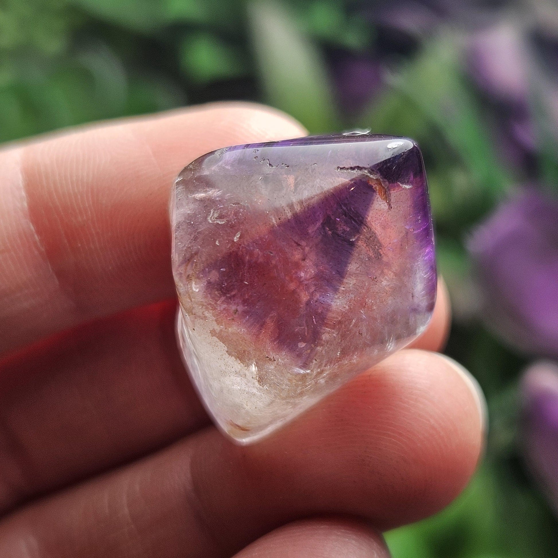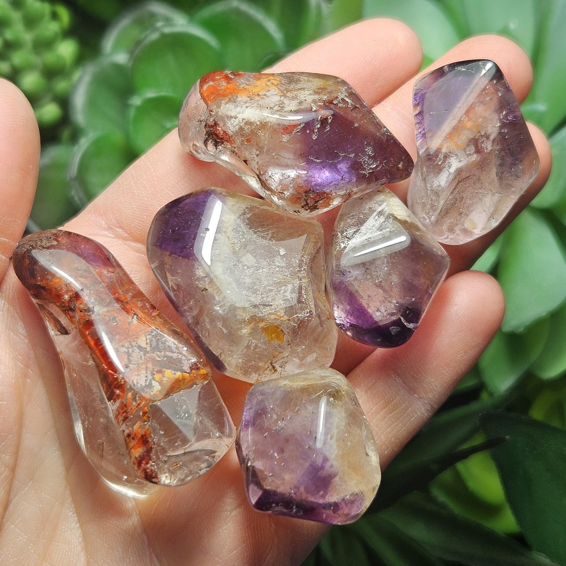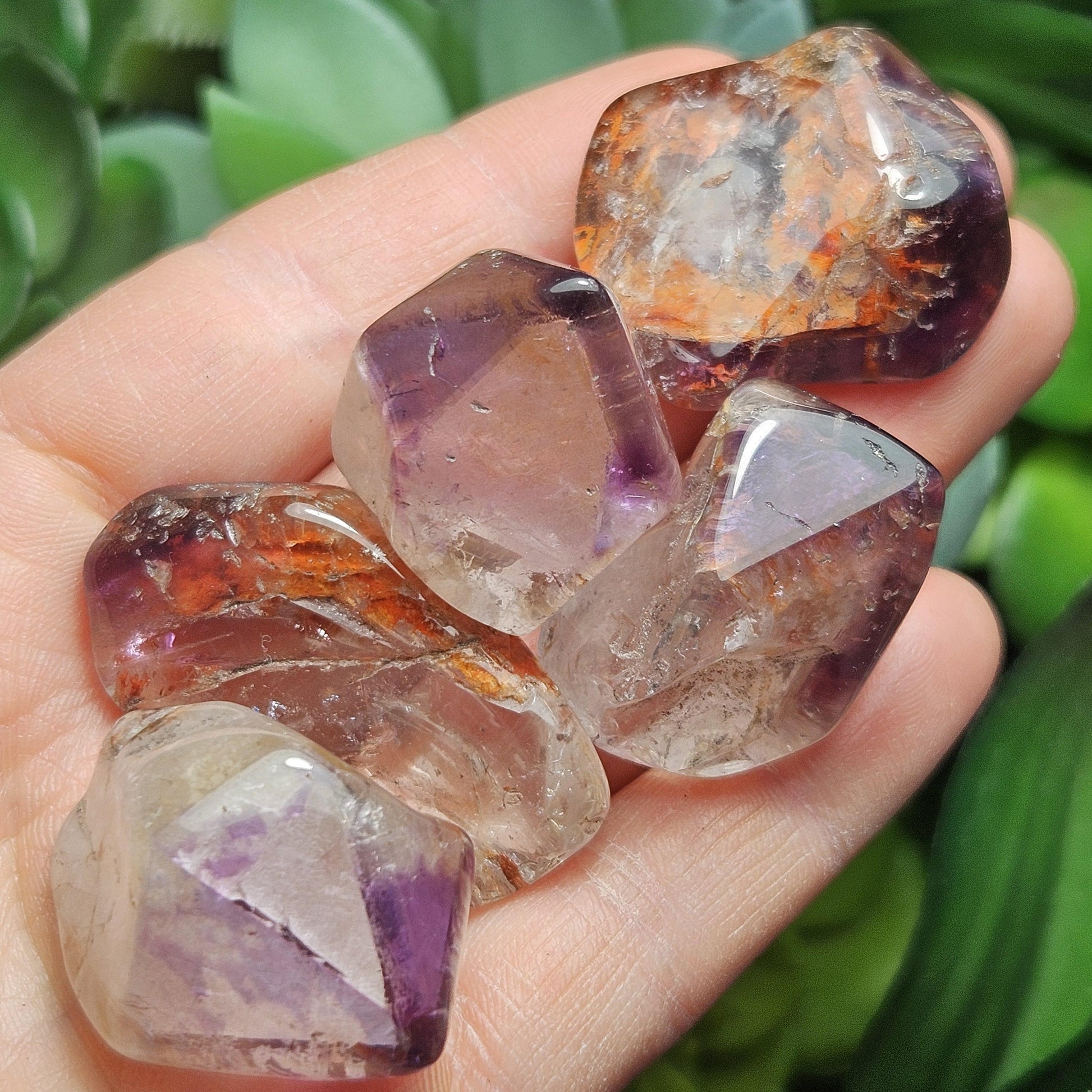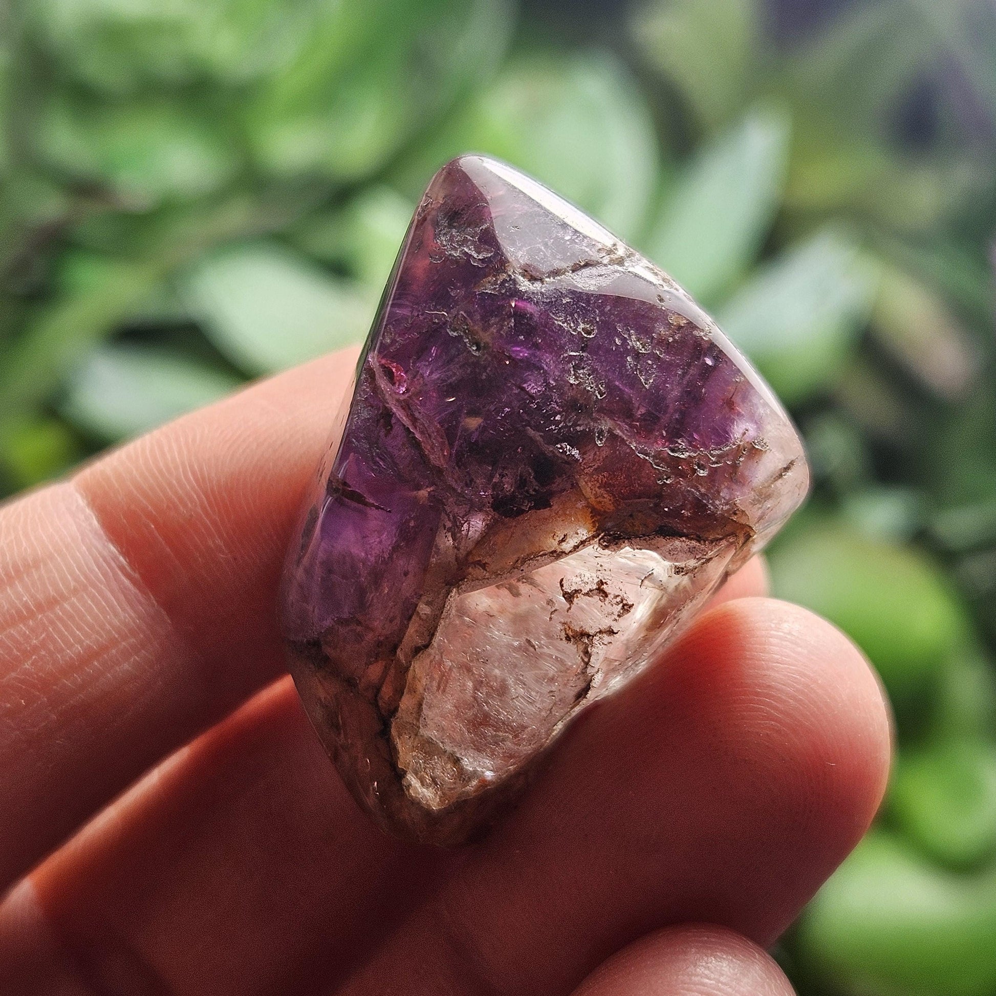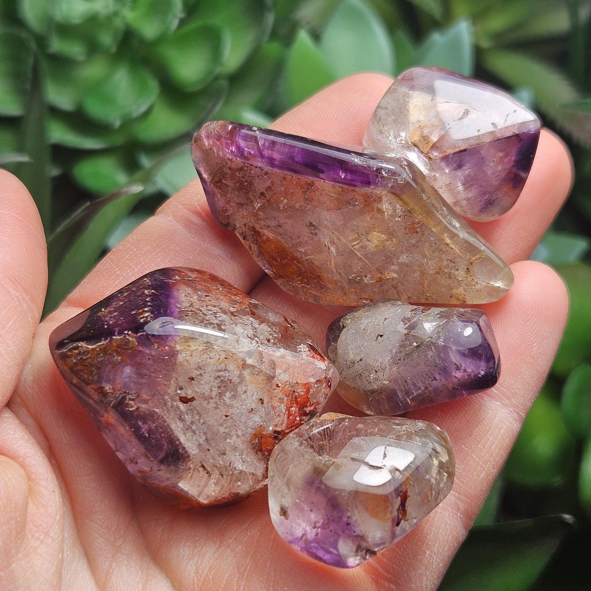 We high graded the most vibrant and beautiful polished Super 7 crystals from a gorgeous lot mined mid 2024. These Super 7 exhibit deep translucence, with varying color tones and distinct layering. They may showcase chevron patterns, specks of Lepidocrocite and have each been polished to a high sheen. Some of these specimens do include small nicks and abrasions, but we felt they were truly worthy despite their slight imperfections.