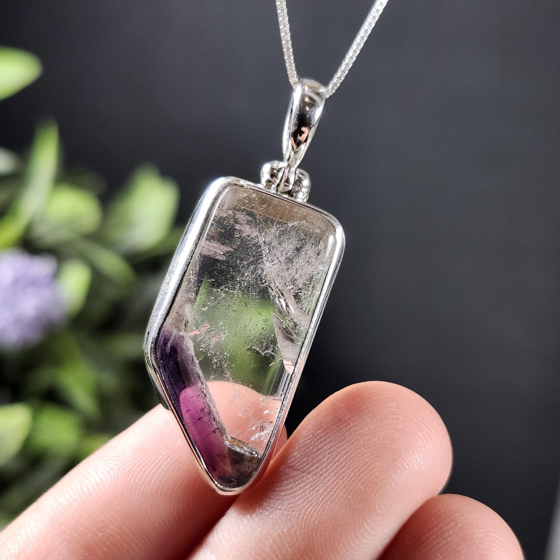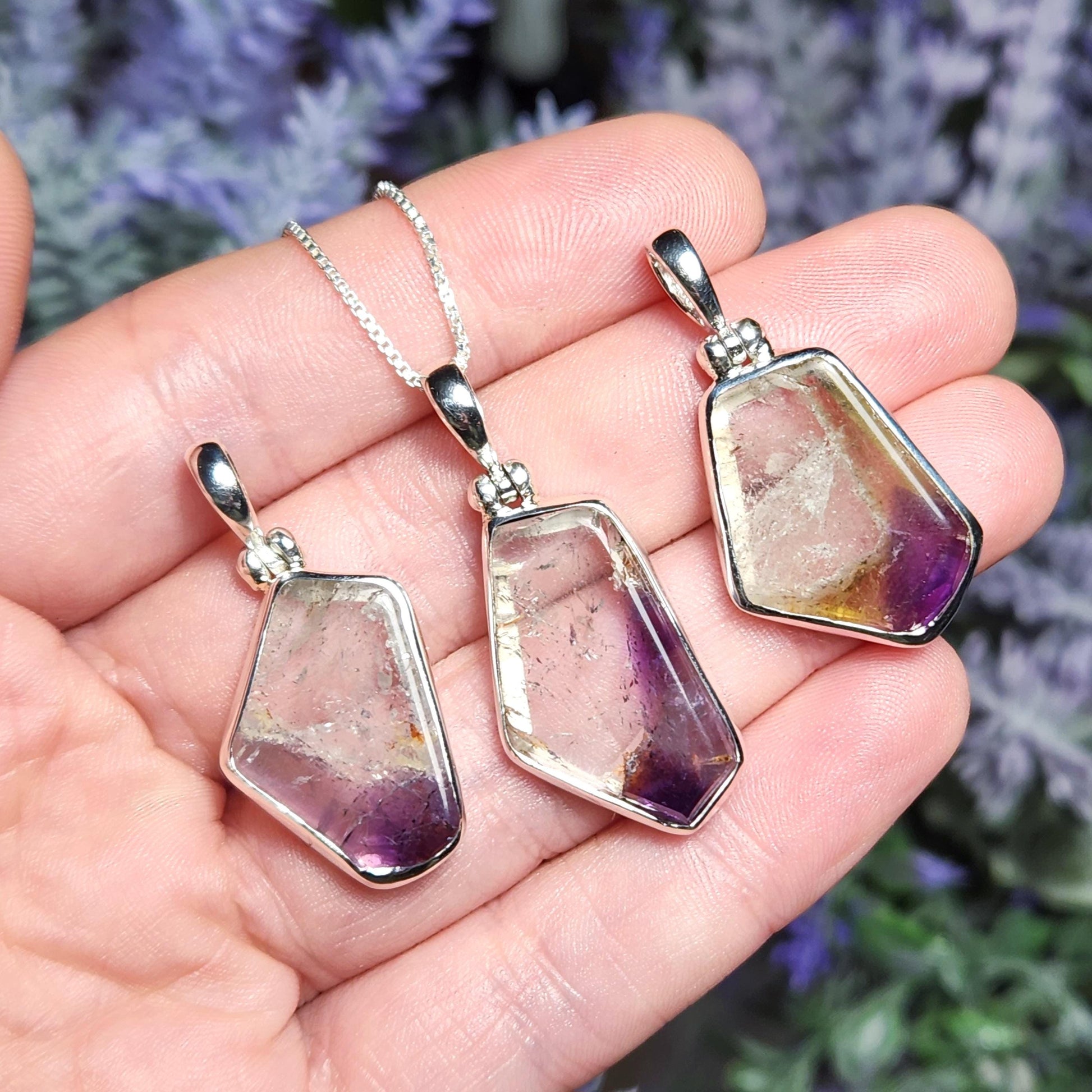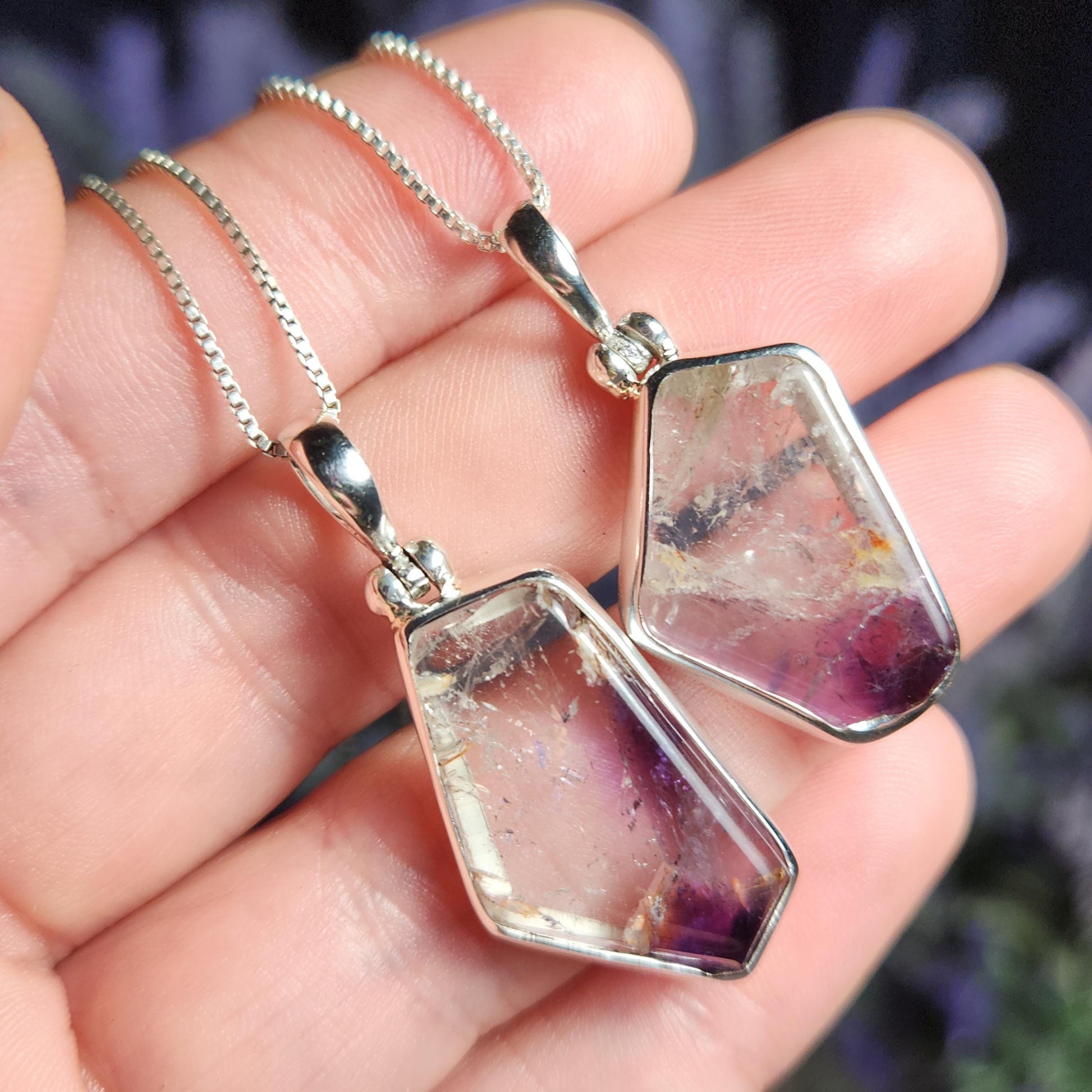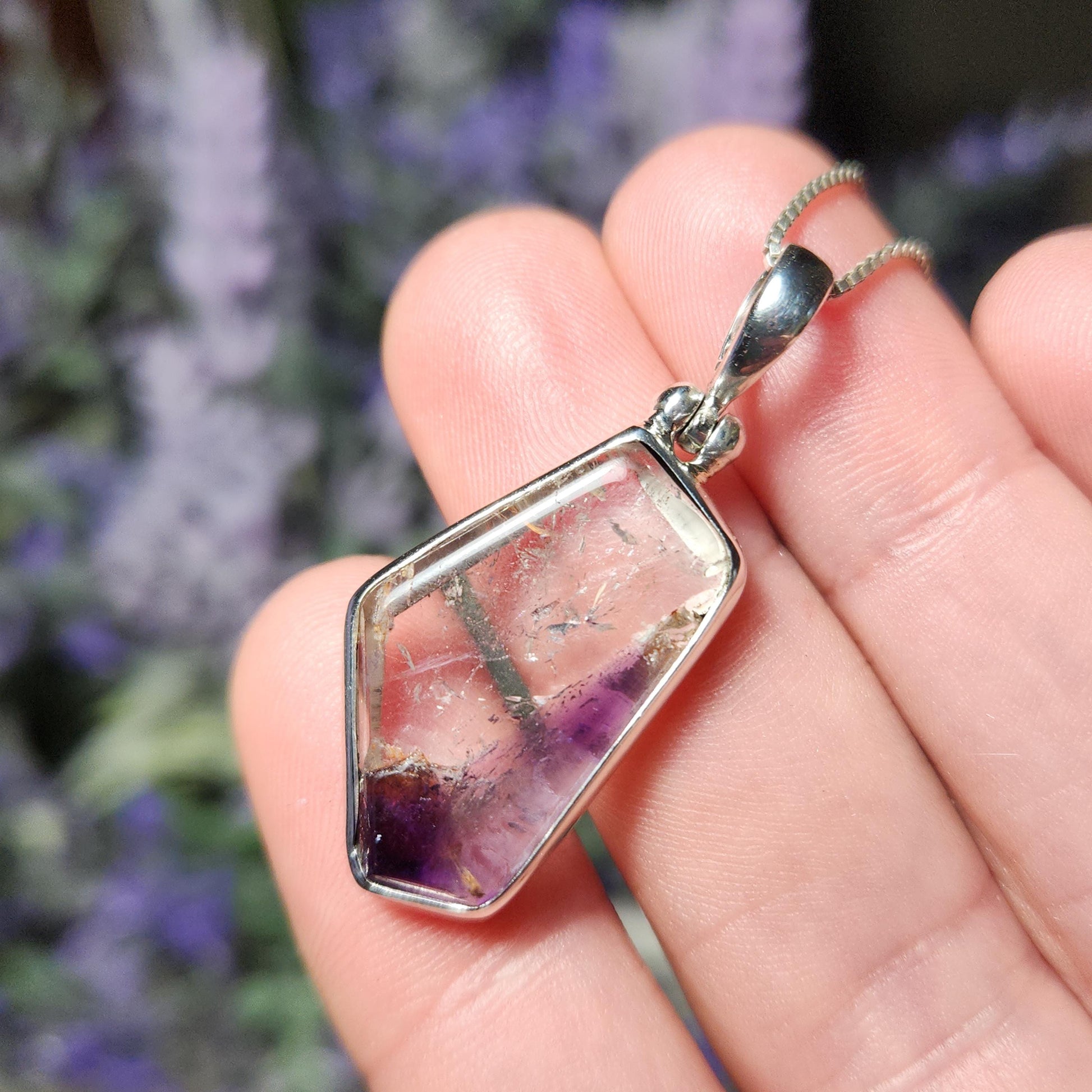 These Super 7 crystals exhibit translucence that shows off the unique color zoning and mineral inclusions within. These specimens may contain small abrasions on their polished surfaces. Each crystal has been custom created into a sturdy piece of jewelry using .925 Sterling Silver. Each pendant measures approximately 25mm by 15mm - these measurements are meant to give a general idea of size; the actual dimensions of the pendant you receive may vary slightly. The silver chain used in the photos is to help envision how this pendant will look while adorned but is not included in the listing.