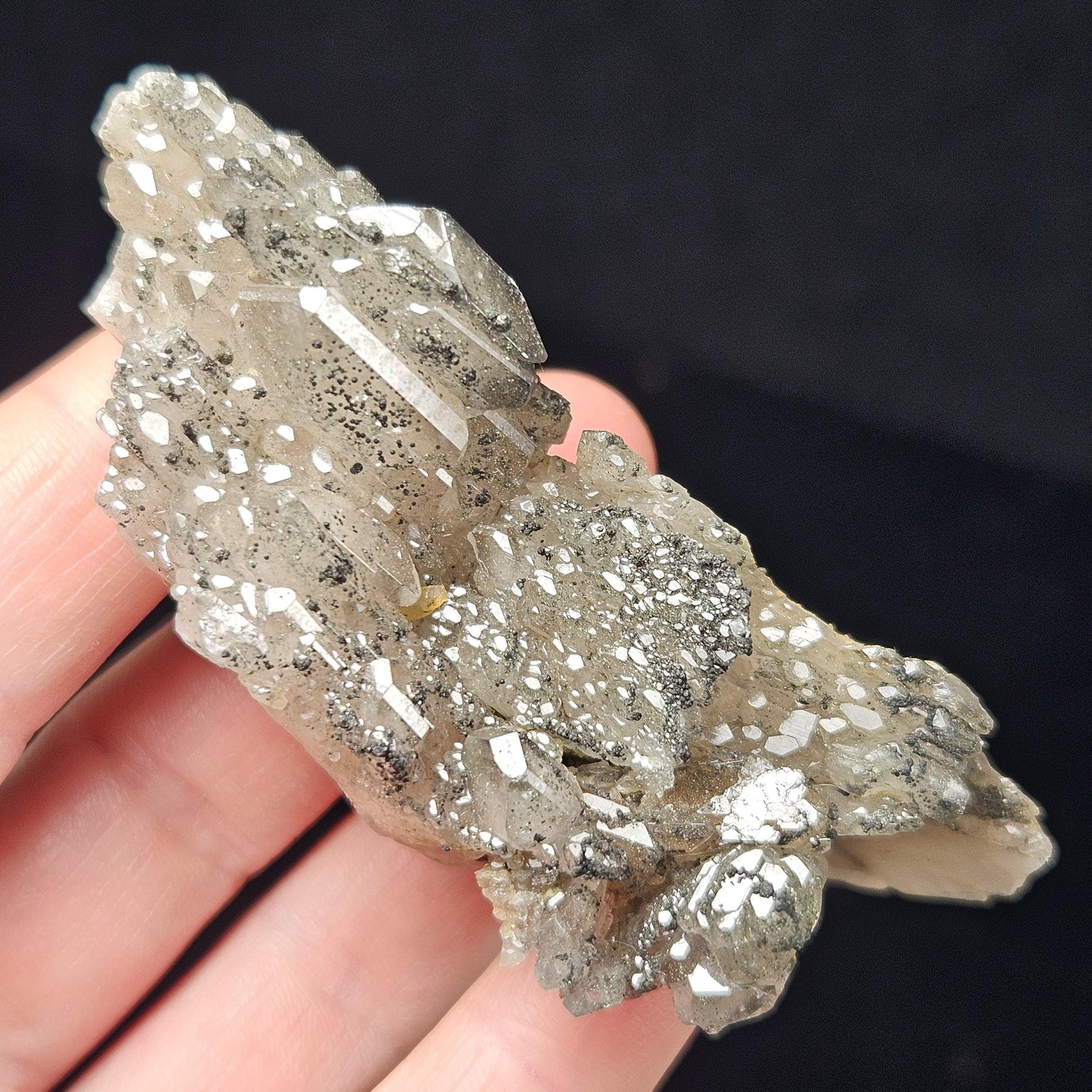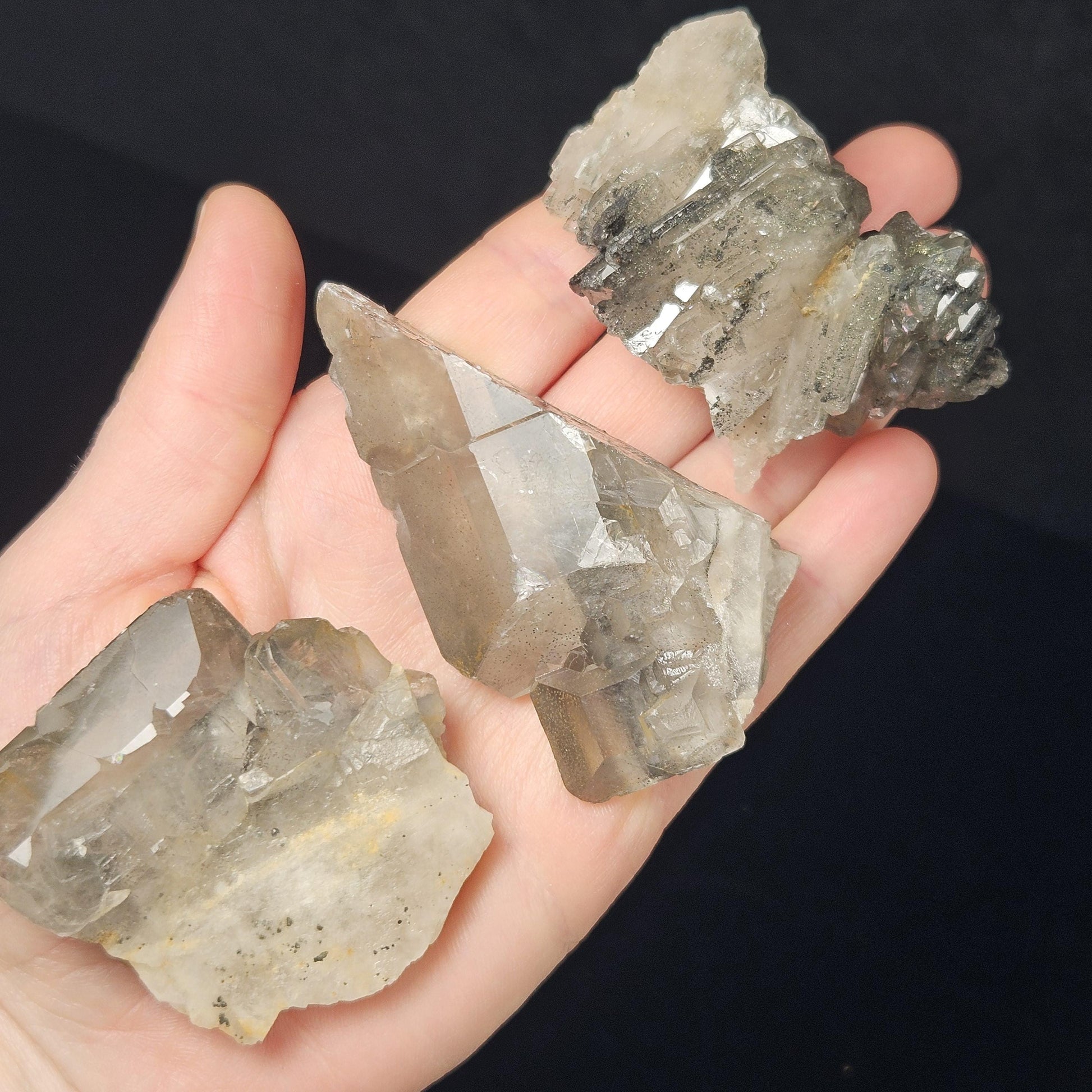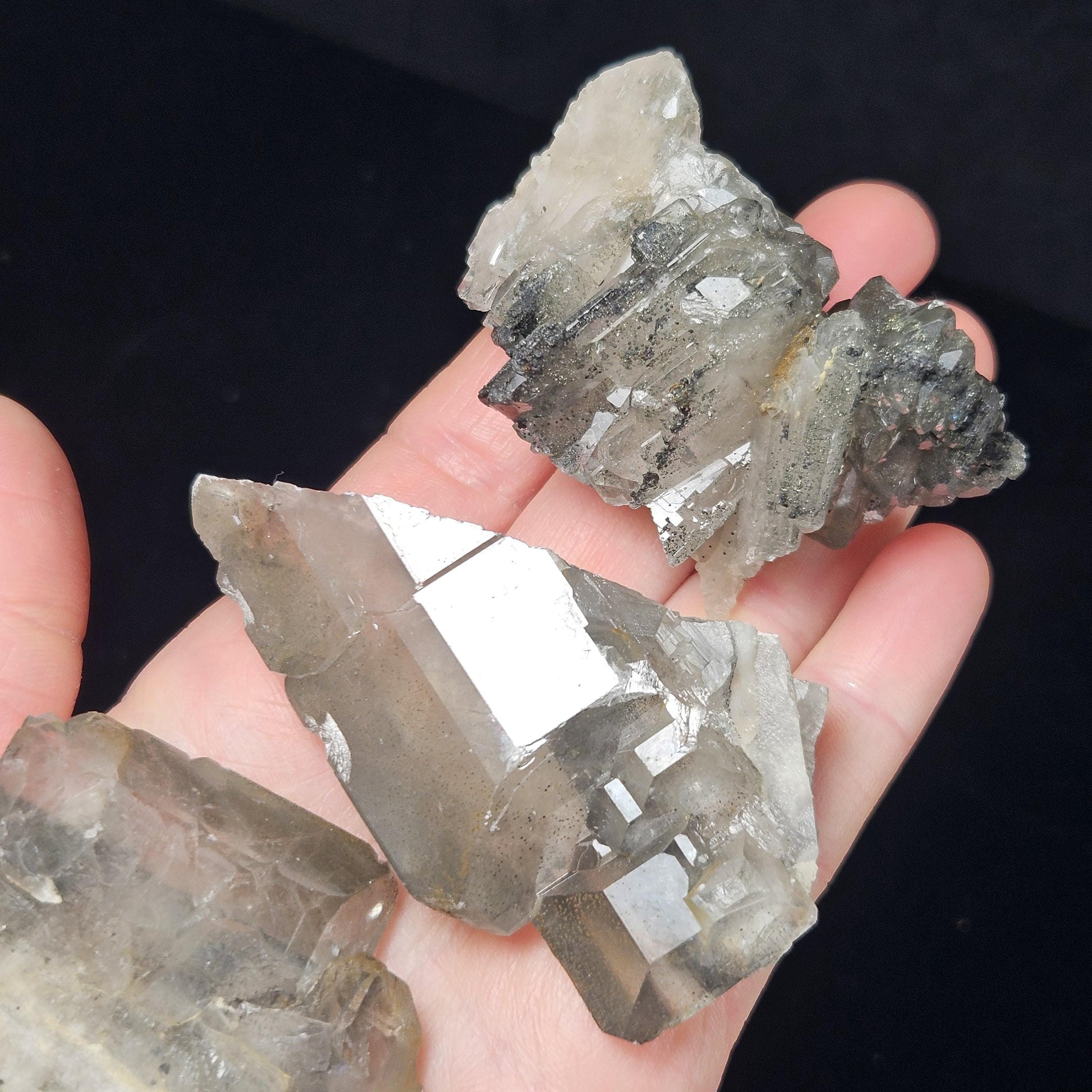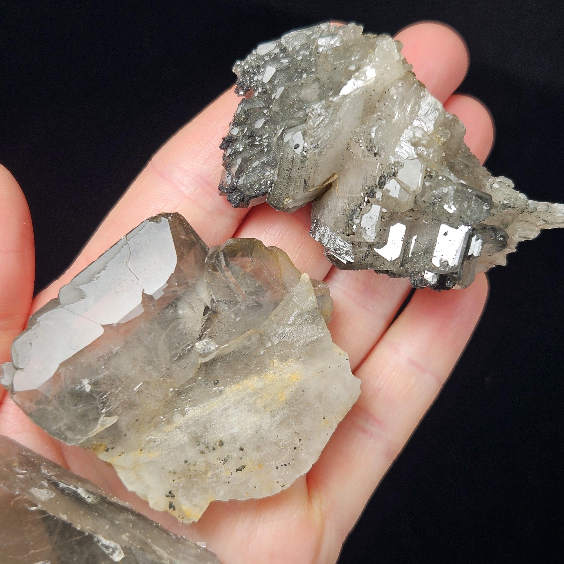 These Black Barite crystals from the Atlas Mountains in Morocco exhibit distinctive clusters of tabular, toothed terminations. They sparkle with inclusions of Marcasite within their depths. These stones have soft grey coloring with a lustrous surface and a gemmy translucence. Each specimen measures between 1.5 inches and 2 inches.