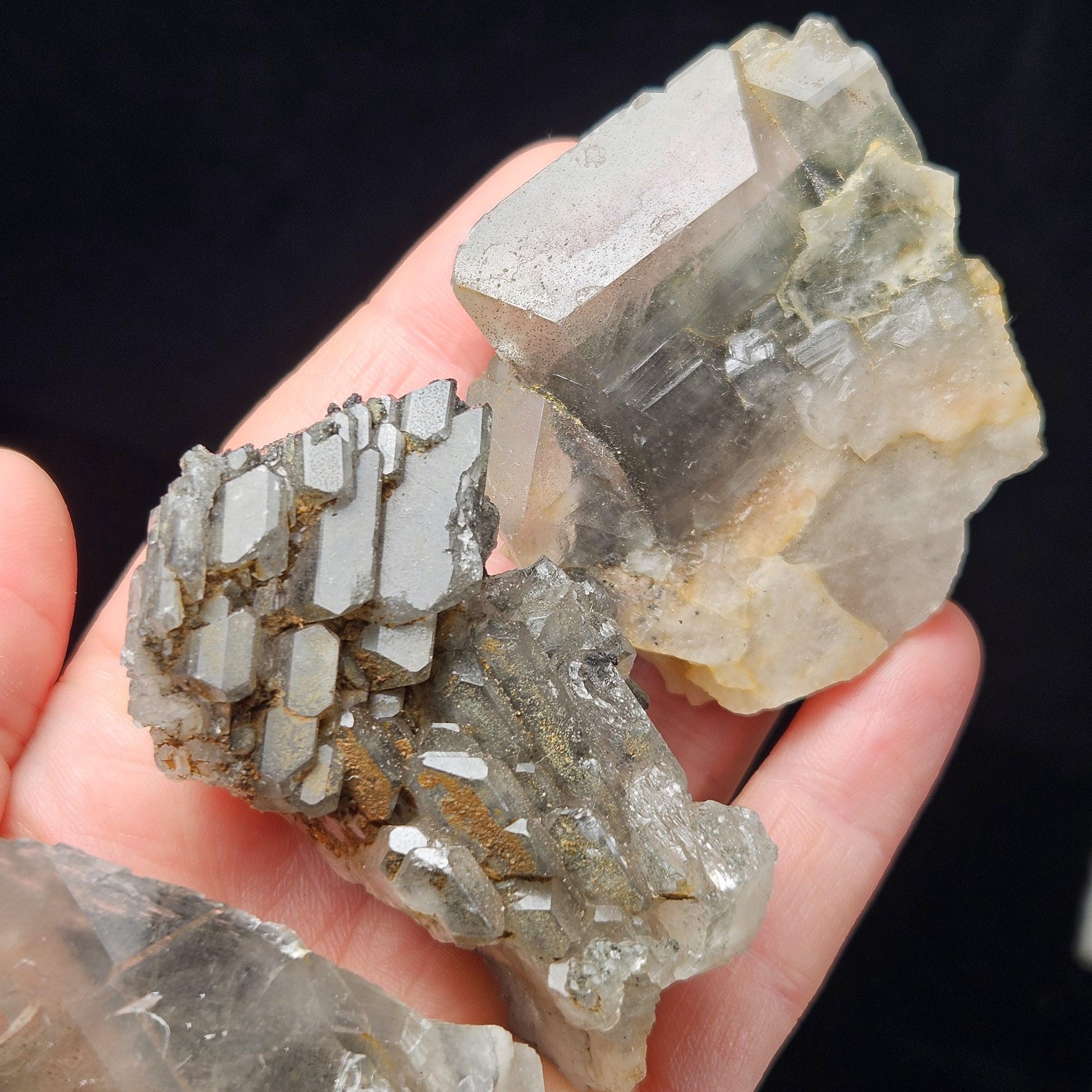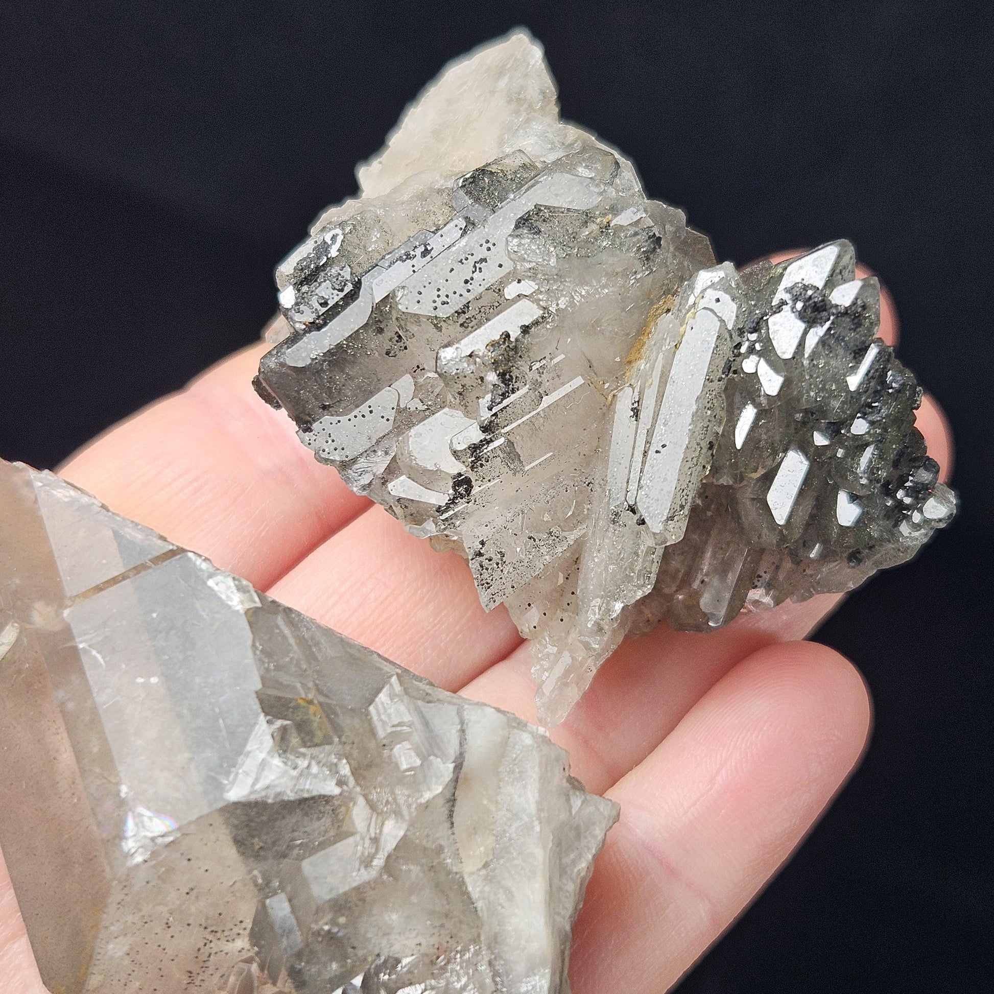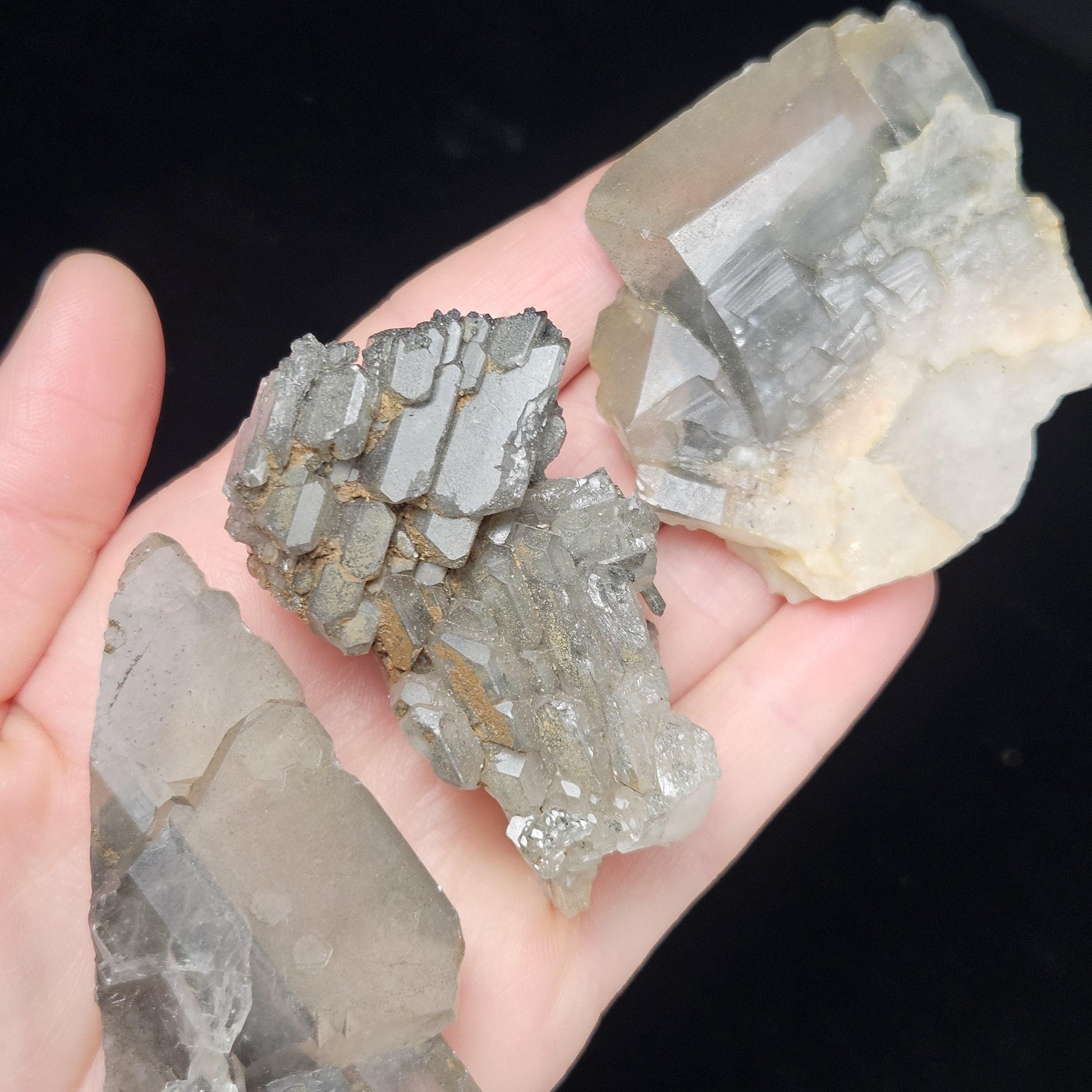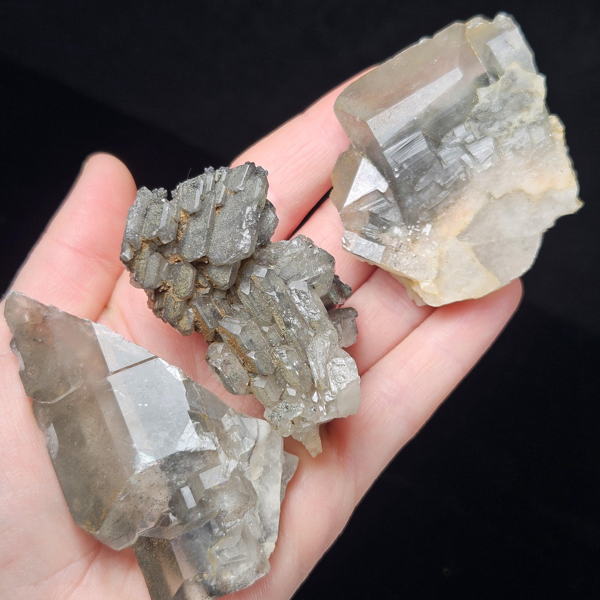 These Black Barite crystals from the Atlas Mountains in Morocco exhibit distinctive clusters of tabular, toothed terminations. They sparkle with inclusions of Marcasite within their depths. These stones have soft grey coloring with a lustrous surface and a gemmy translucence. Each specimen measures between 1.5 inches and 2 inches.