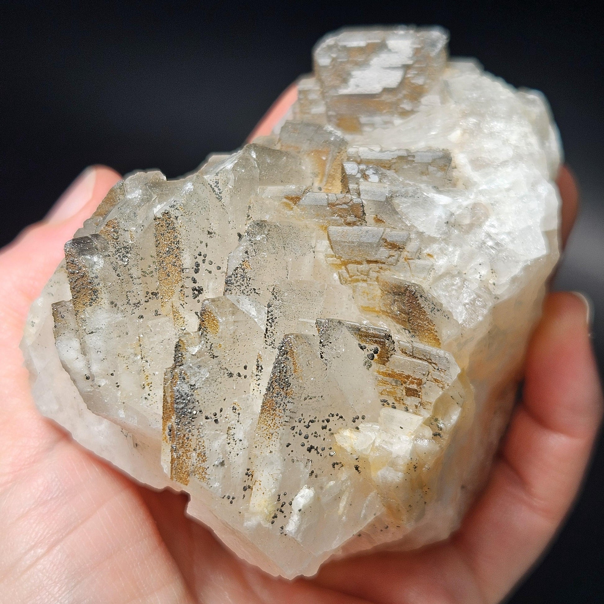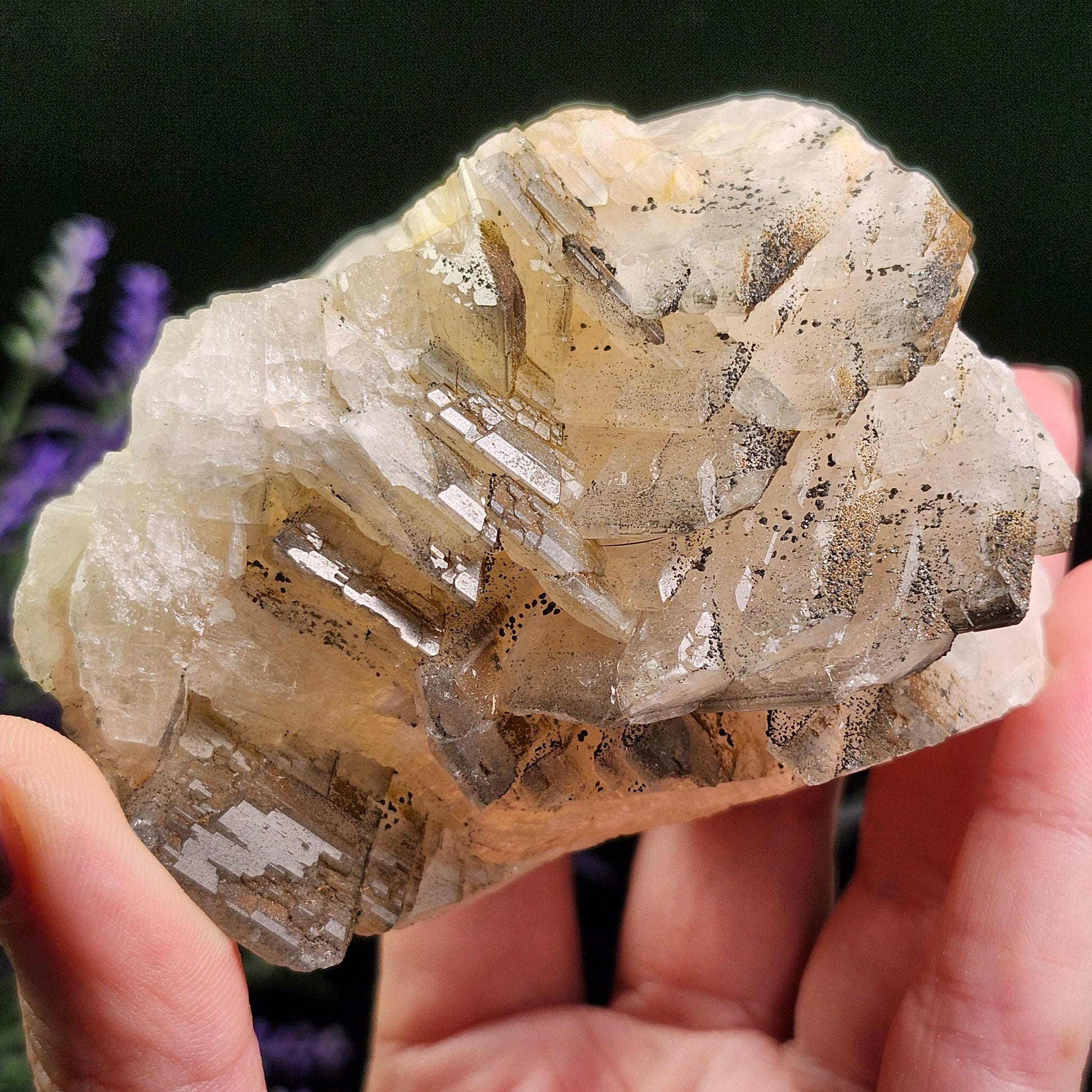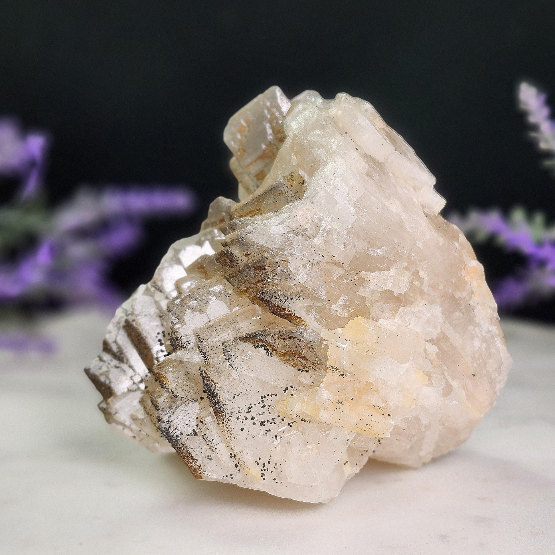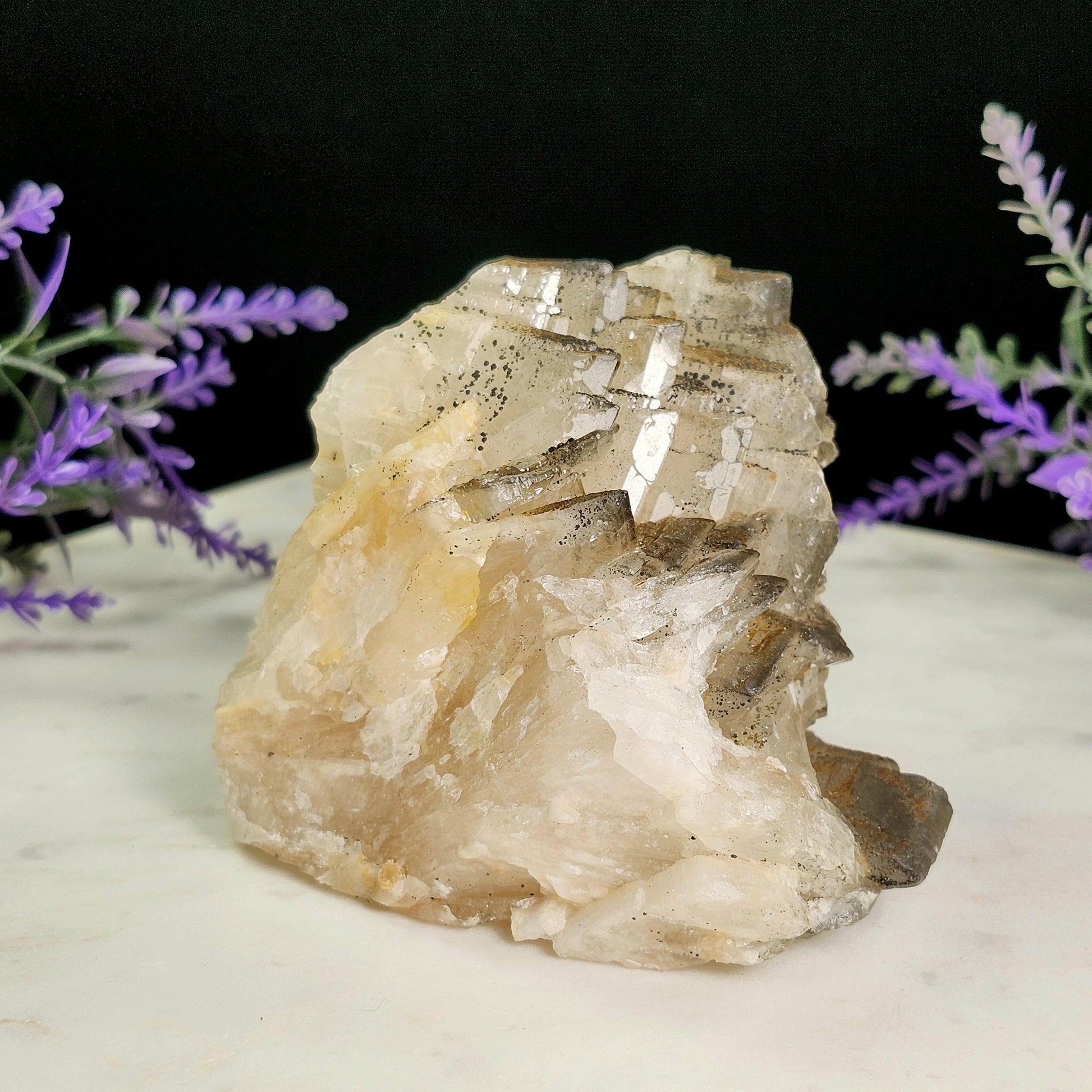 This chunky Black Barite crystal from the Atlas Mountains in Morocco exhibits clustered tabular terminations and has inclusions of Marcasite within its depths. It has a creamy coloring with speckles of soft grey. This crystal has a flattened bottom, making it an excellent display piece! This specimen measures 78mm by 70mm by 52mm and weighs 1.4 pounds.