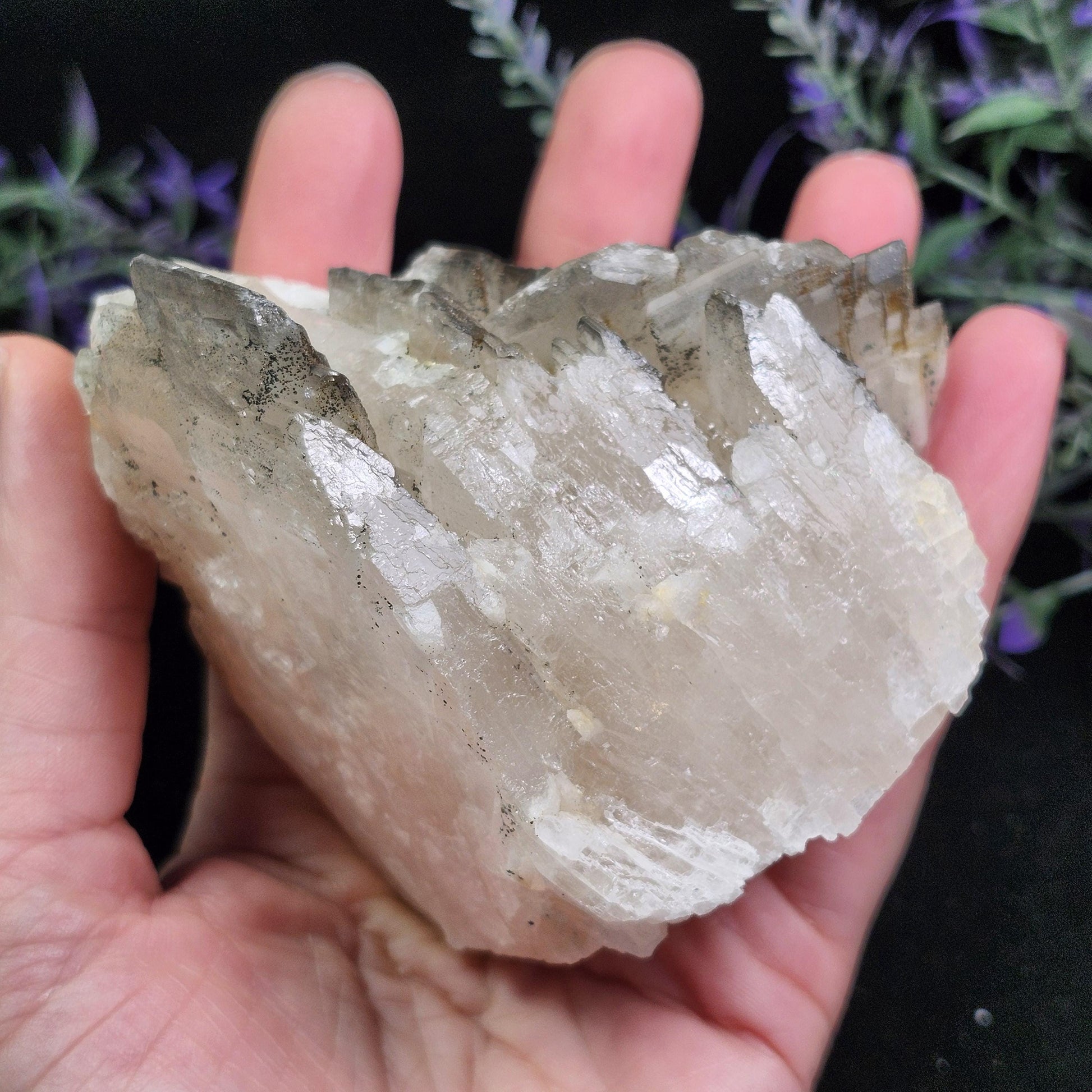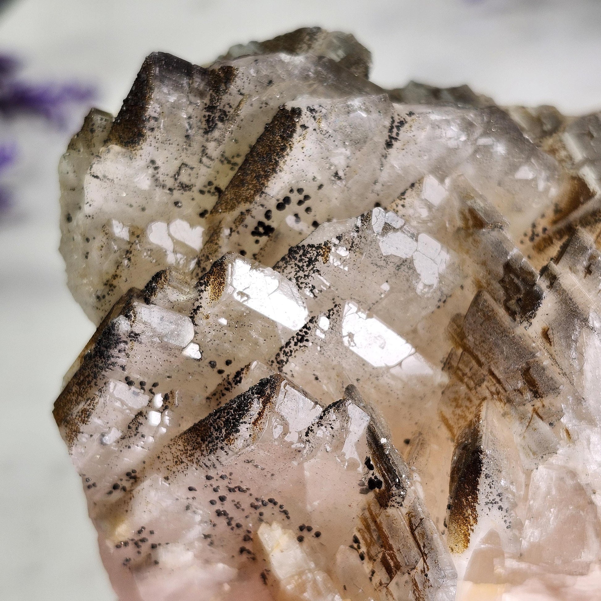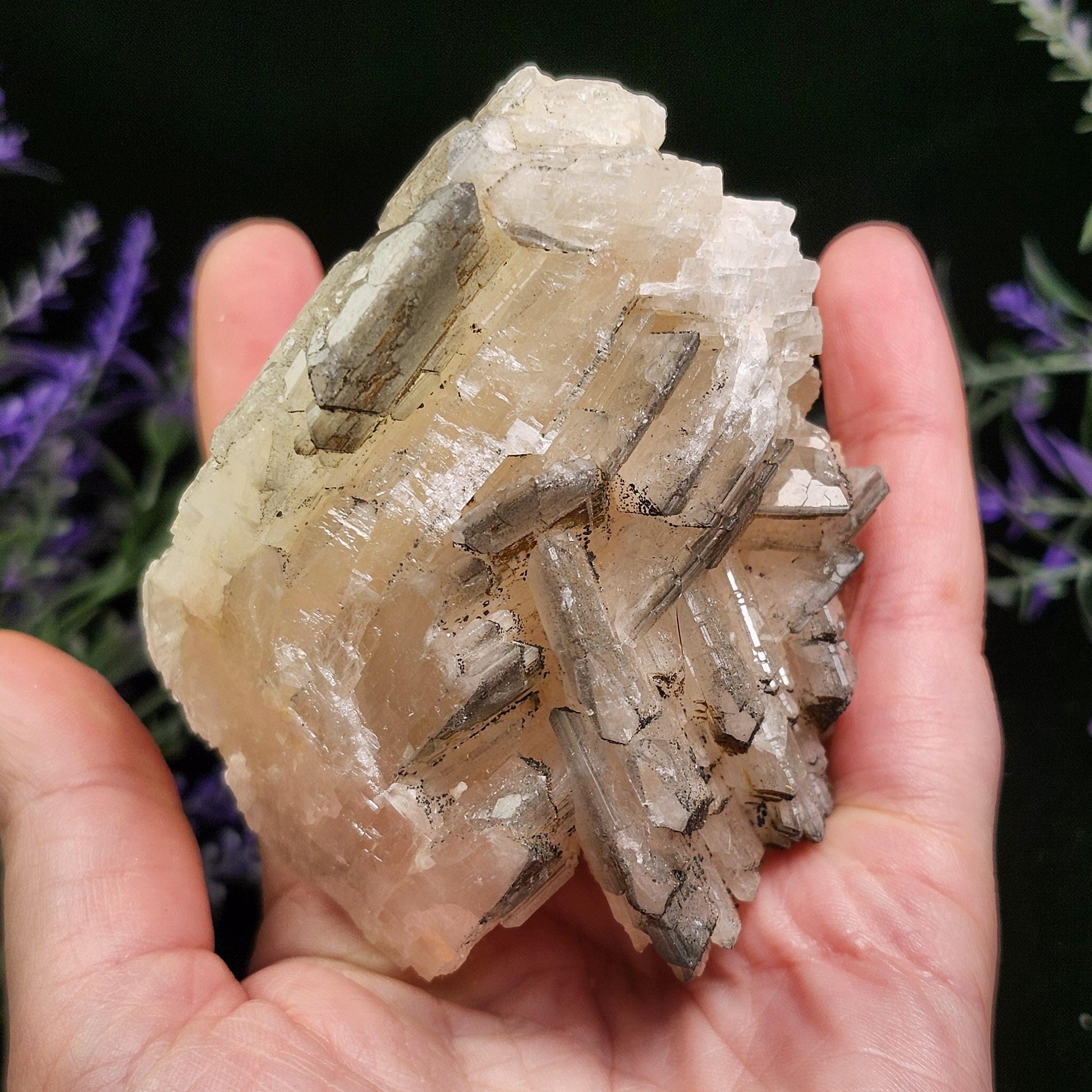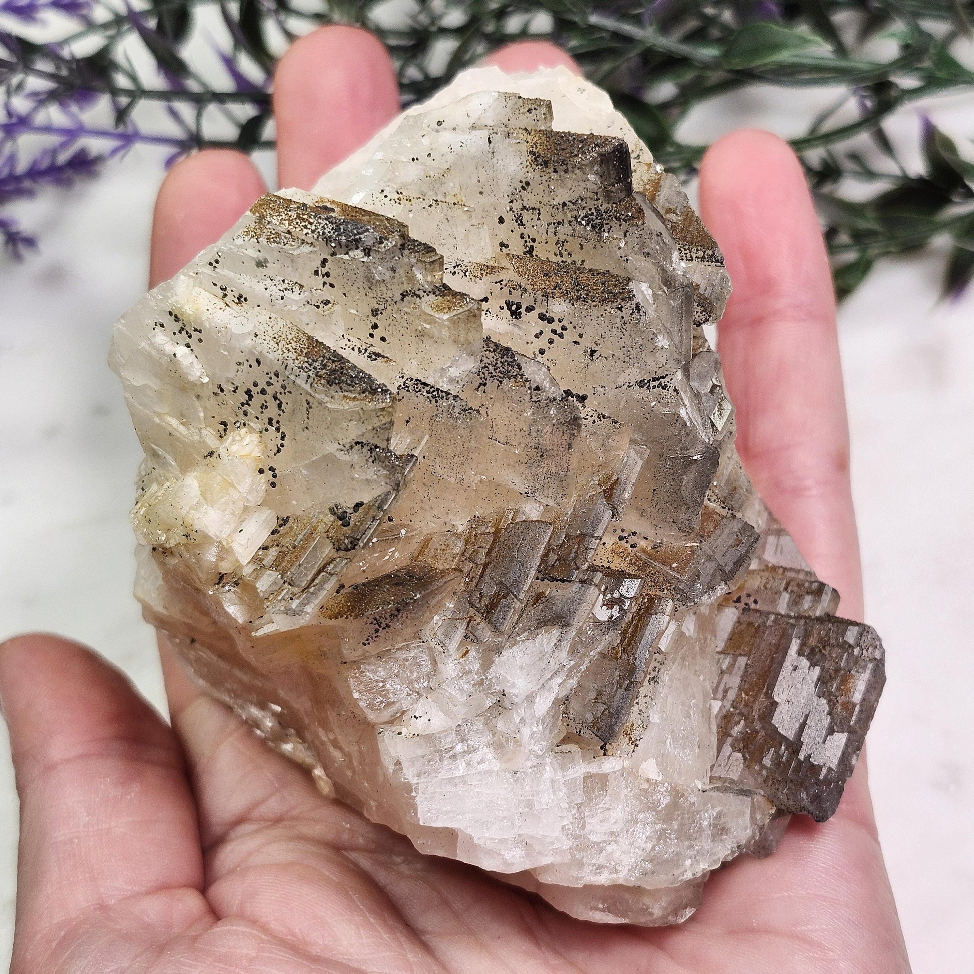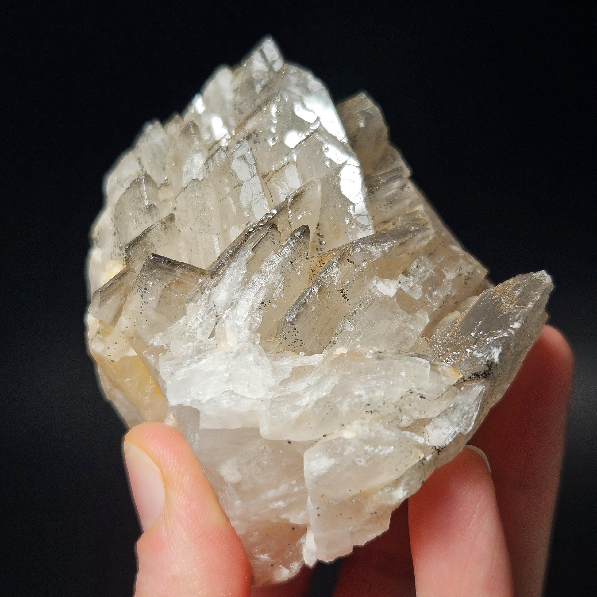 This chunky Black Barite crystal from the Atlas Mountains in Morocco exhibits clustered tabular terminations and has inclusions of Marcasite within its depths. It has a creamy coloring with speckles of soft grey. This crystal has a flattened bottom, making it an excellent display piece! This specimen measures 78mm by 70mm by 52mm and weighs 1.4 pounds.