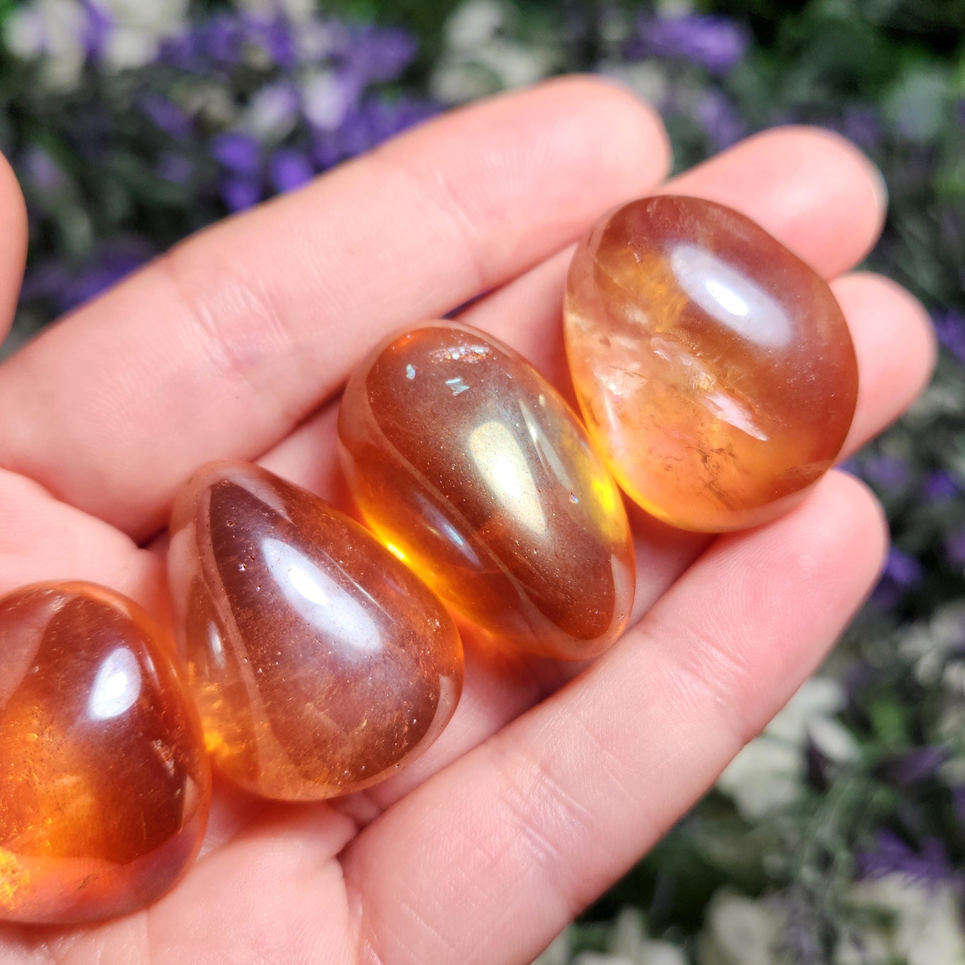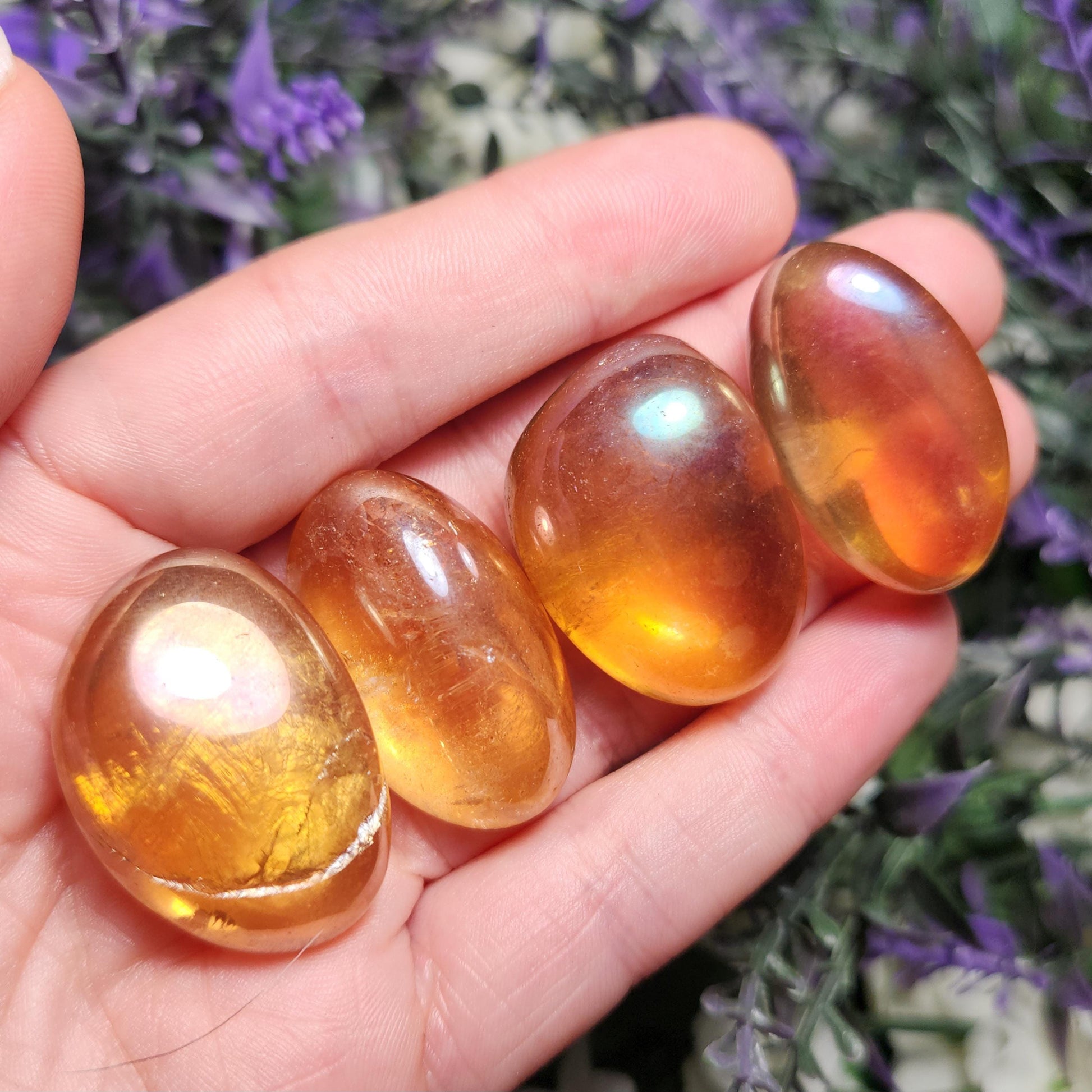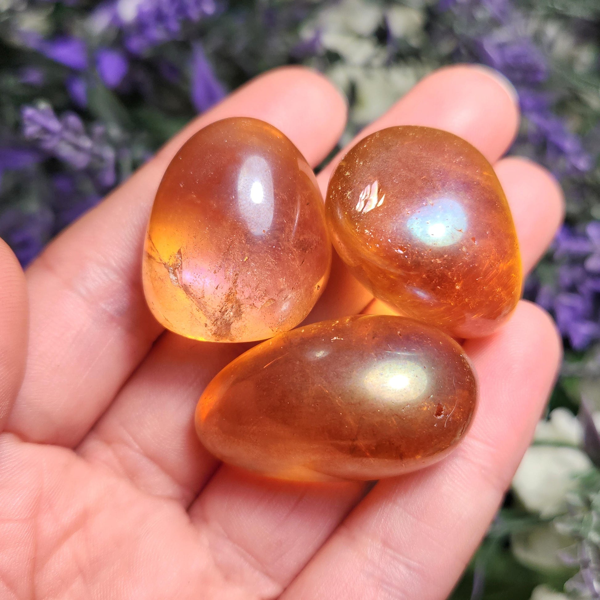 These tumbled Tangerine Aura Quartz crystals have a smooth polish and display a tangerine color with a slight pink iridescence.