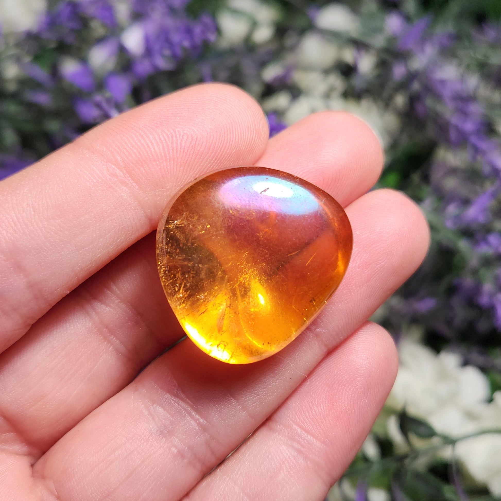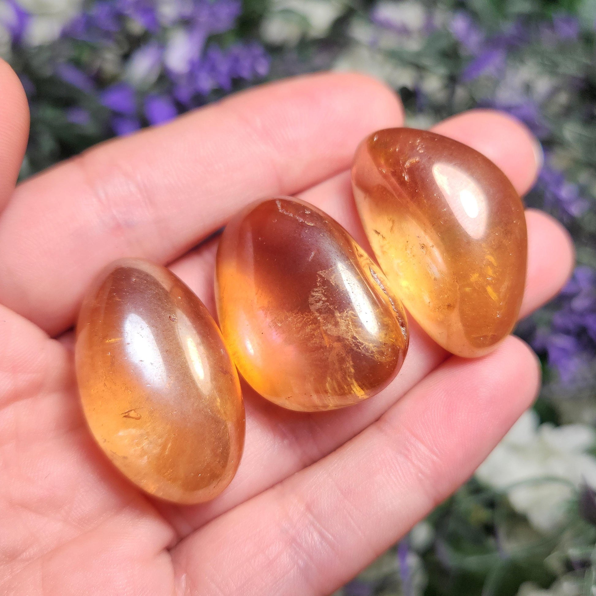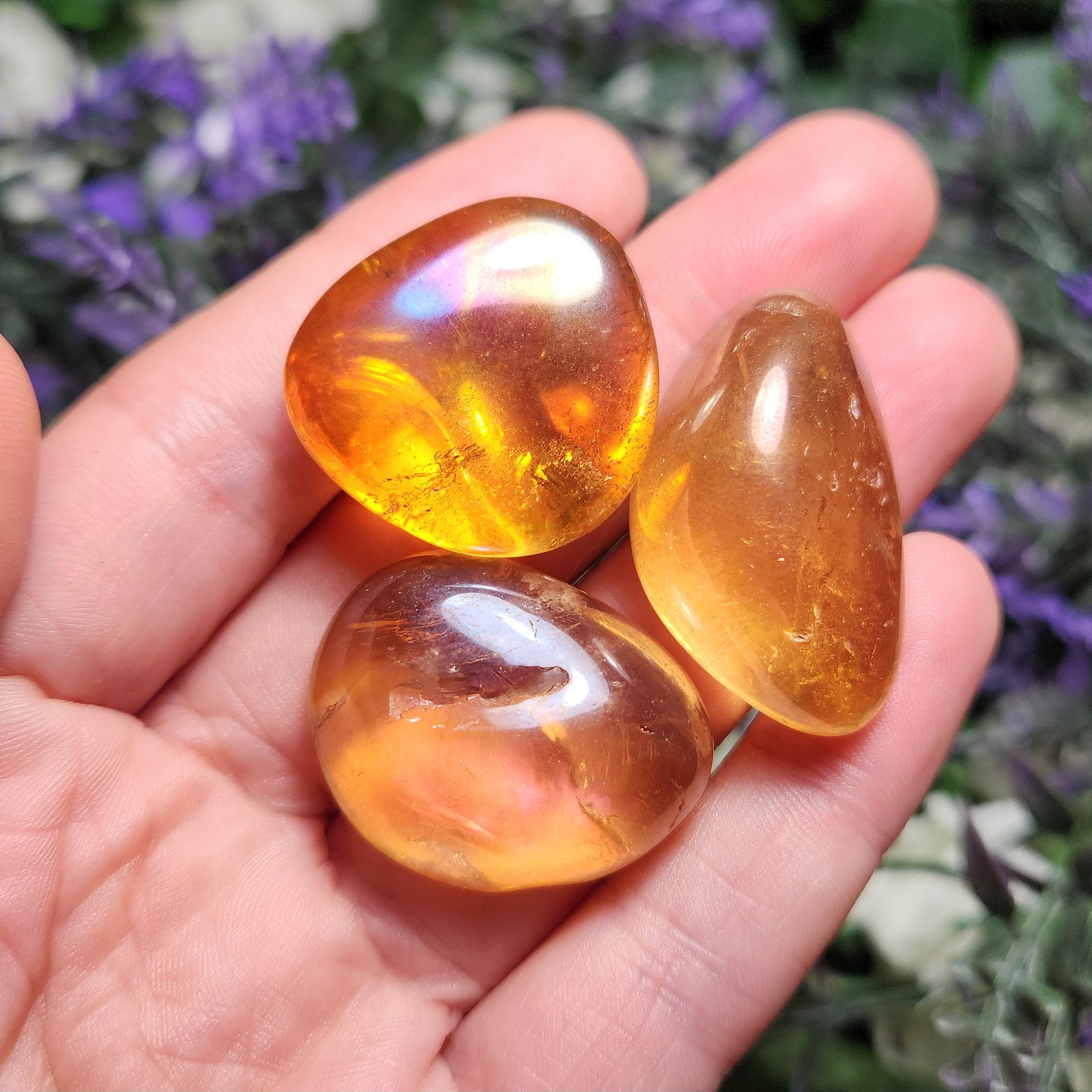 These tumbled Tangerine Aura Quartz crystals have a smooth polish and display a tangerine color with a slight pink iridescence.
