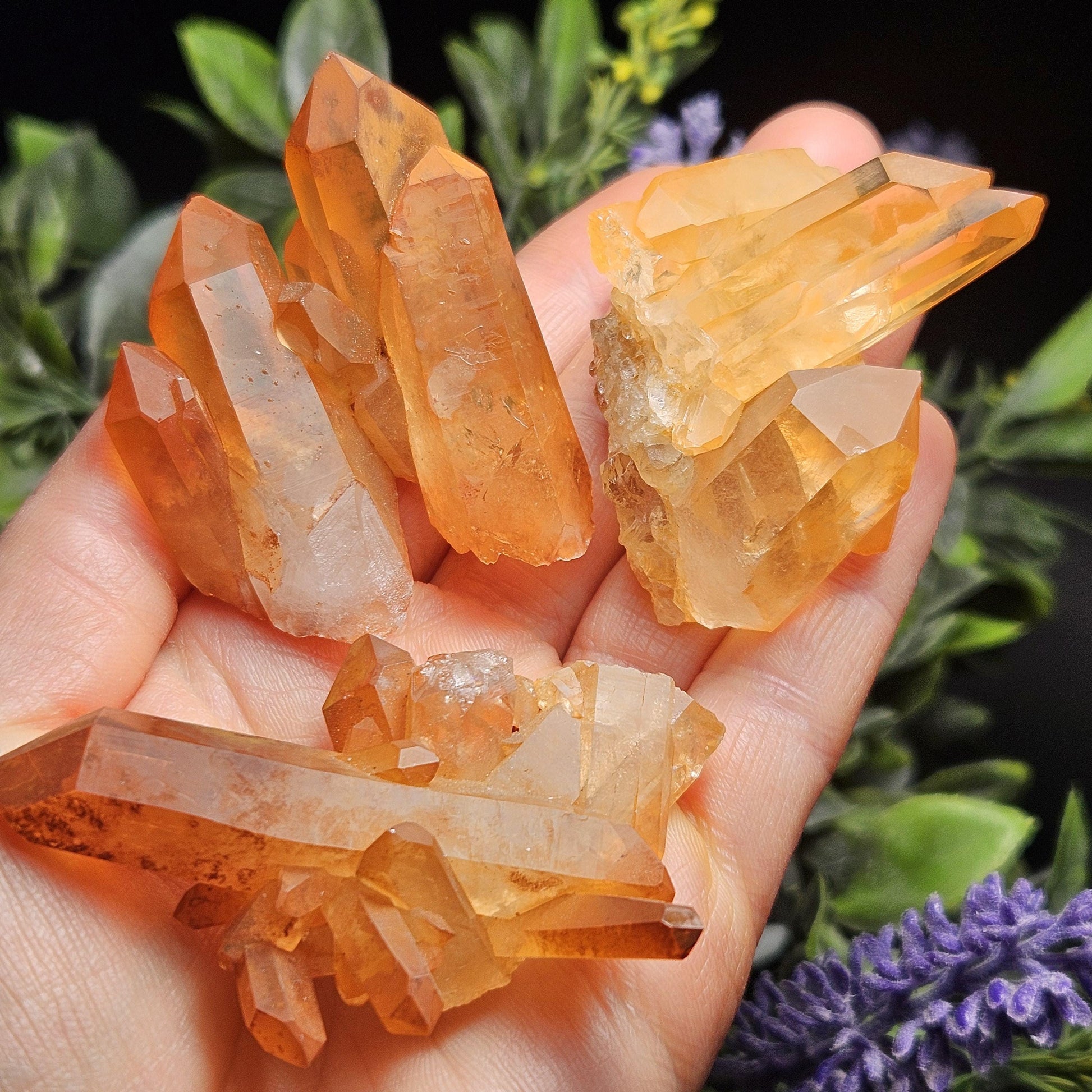 These Tangerine Quartz specimens exhibit clusters of terminations and display a range of coloring from faint golden to bright, saturated orange to deep sienna. These warm orange tones are caused by a presence of water and Hematite in the area where the crystal was formed. They have freeform shapes, some are chunky while some are more flattened, with various characteristics that make each one completely unique. Each specimen weighs between 40 grams and 50 grams.
