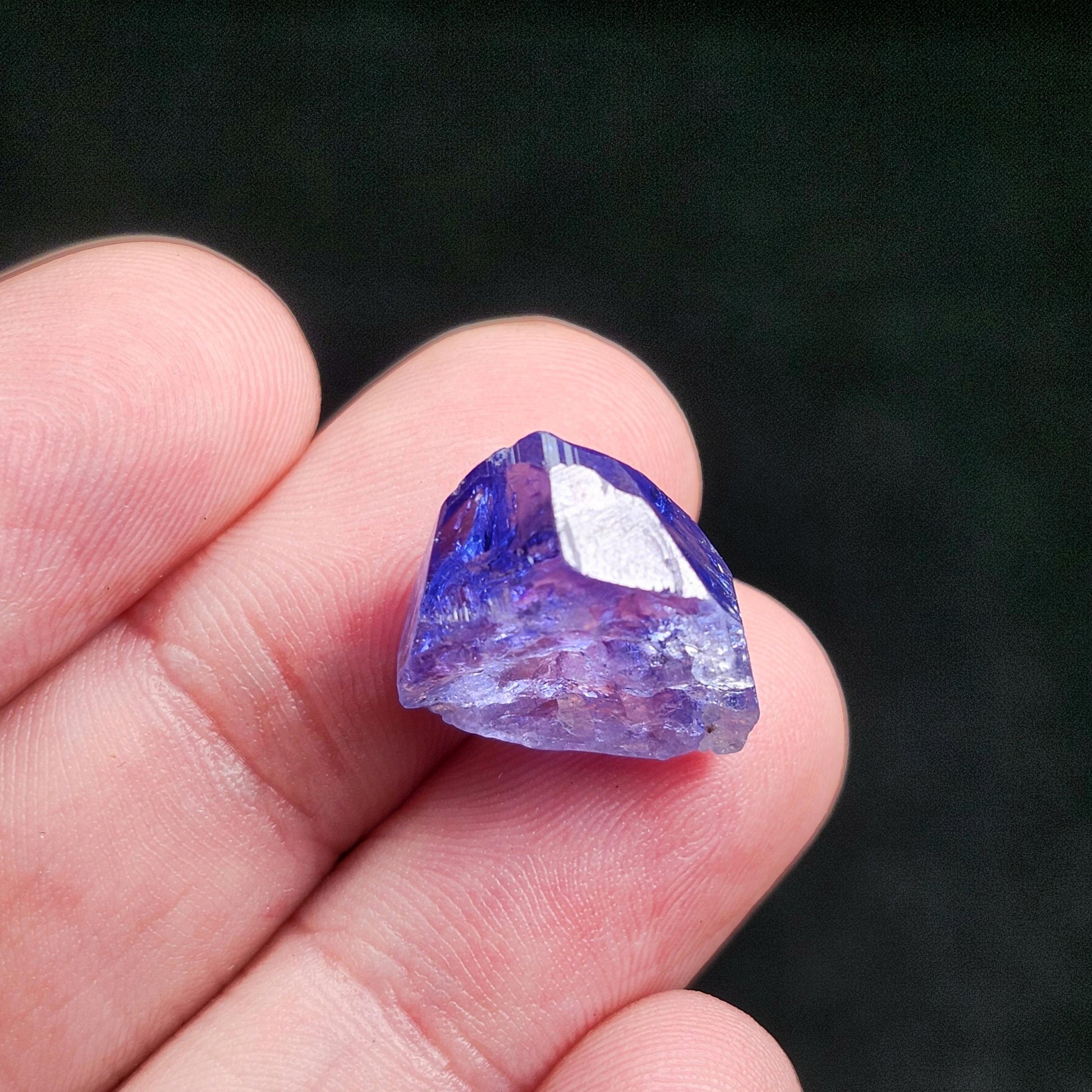 This terminated Tanzanite gemstone exhibits a gemmy indigo translucence that illuminates when backlit. It has distinct striations and shining natural facets. This specimen measures approximately 14mm by 12mm and weighs 2.8 grams.