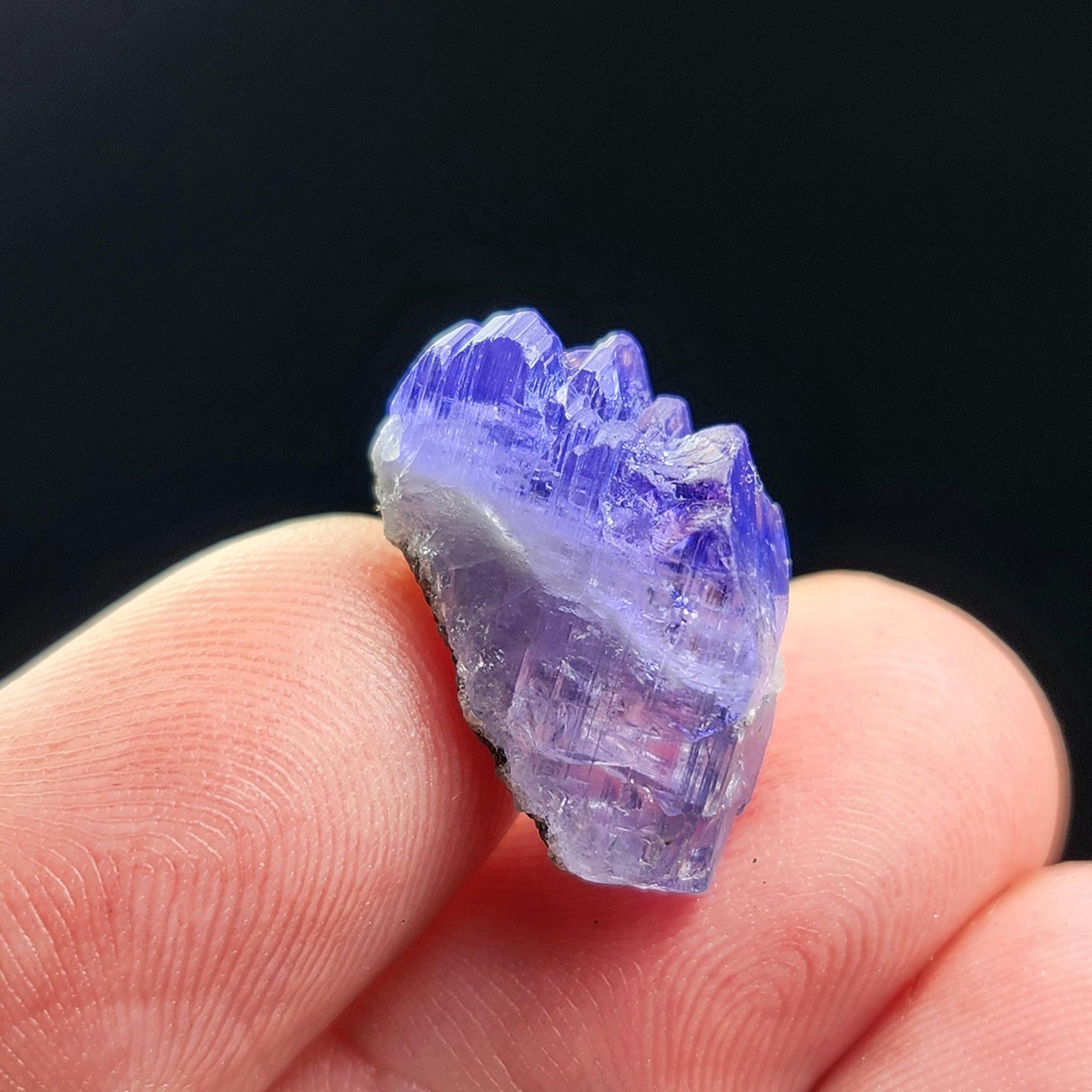 This Tanzanite gemstone showcases stepped terminations and shing striations. It has an indigo coloring and contains mineral inclusions. This specimen measures approximately 15mm by 5mm and weighs 2.9 grams.