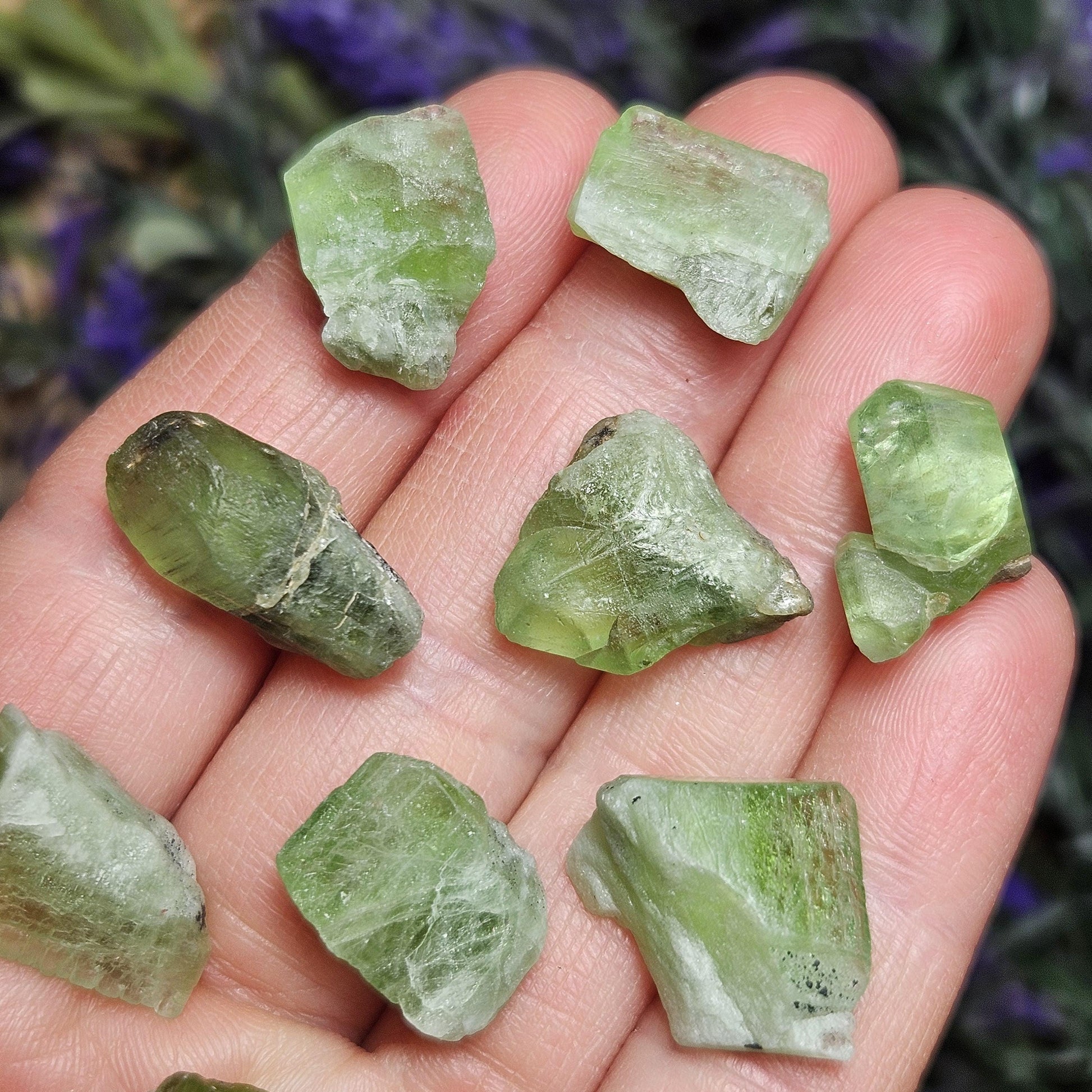 These raw Peridot crystals have distinct terminations and a glowing green translucence. Light shines off of their natural facets and terminations creating a high sheen.