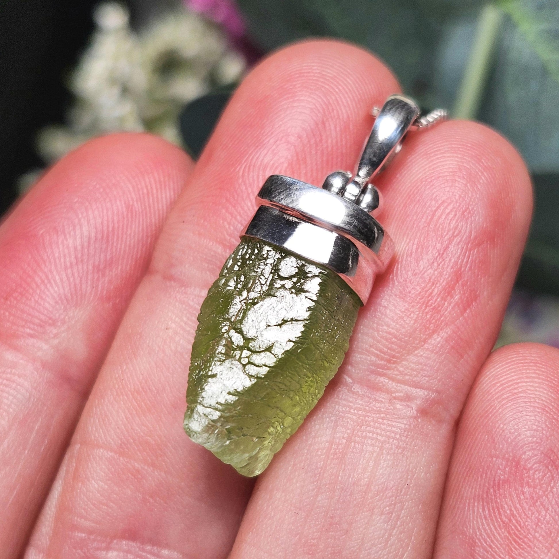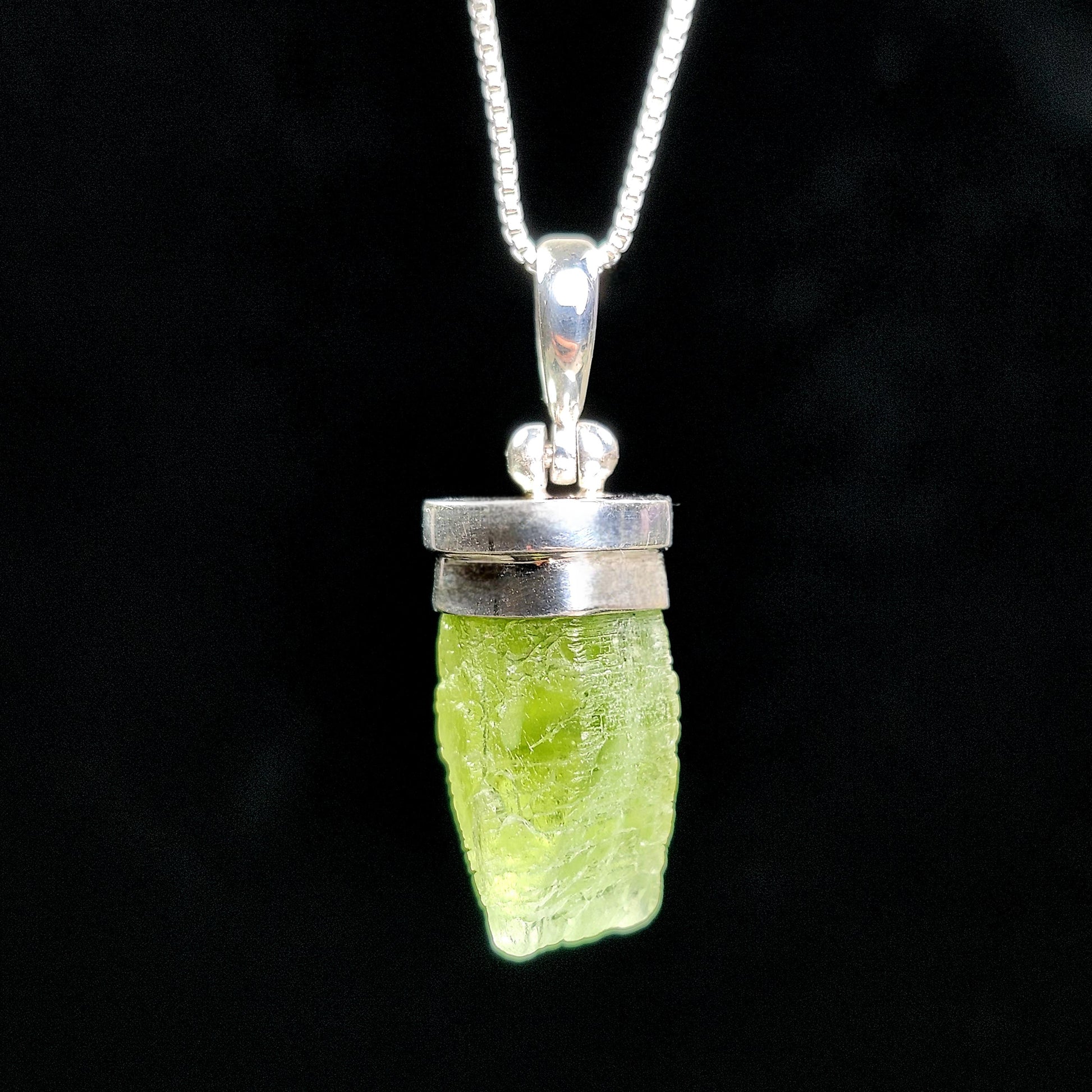 This unique Peridot gemstone has a lime green coloring and exhibits natural termination with etching on its surface. This crystal has been custom created into a sturdy piece of jewelry using .925 Sterling Silver. It measures approximately 30mm by 9mm. The silver chain used in the photos is to help envision how this pendant will look while adorned but is not included in the listing.