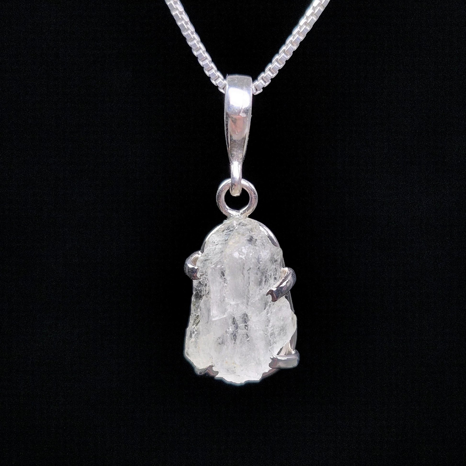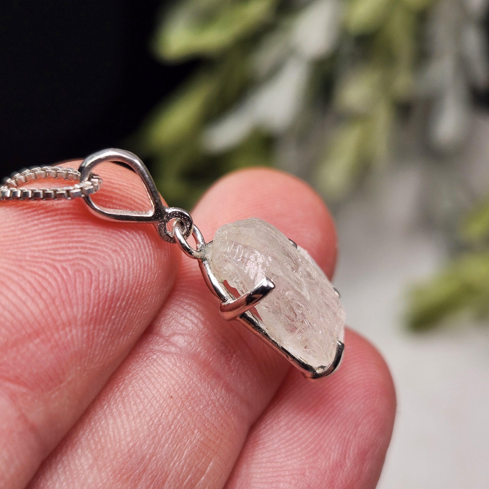 This raw, naturally terminated Phenacite crystal from Nigeria has a milky white coloring and a cloudy translucence. This crystal has been custom created into a sturdy piece of jewelry using .925 Sterling Silver. This pendant measures approximately 24mm by 8mm. The silver chain used in the photos is to help envision how this pendant will look while adorned but is not included in the listing.
