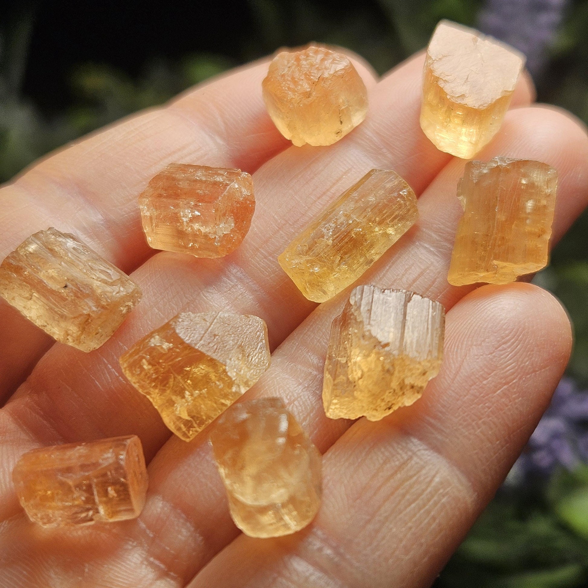 These Imperial Topaz crystals from Ouro Preto, Brazil are raw and glow with a golden translucence. Each terminated crystal displays deep striations and exhibits an etched or naturally polished termination. Each crystal weigh between 1 and 2 grams and measure approximately 10 millimeters.