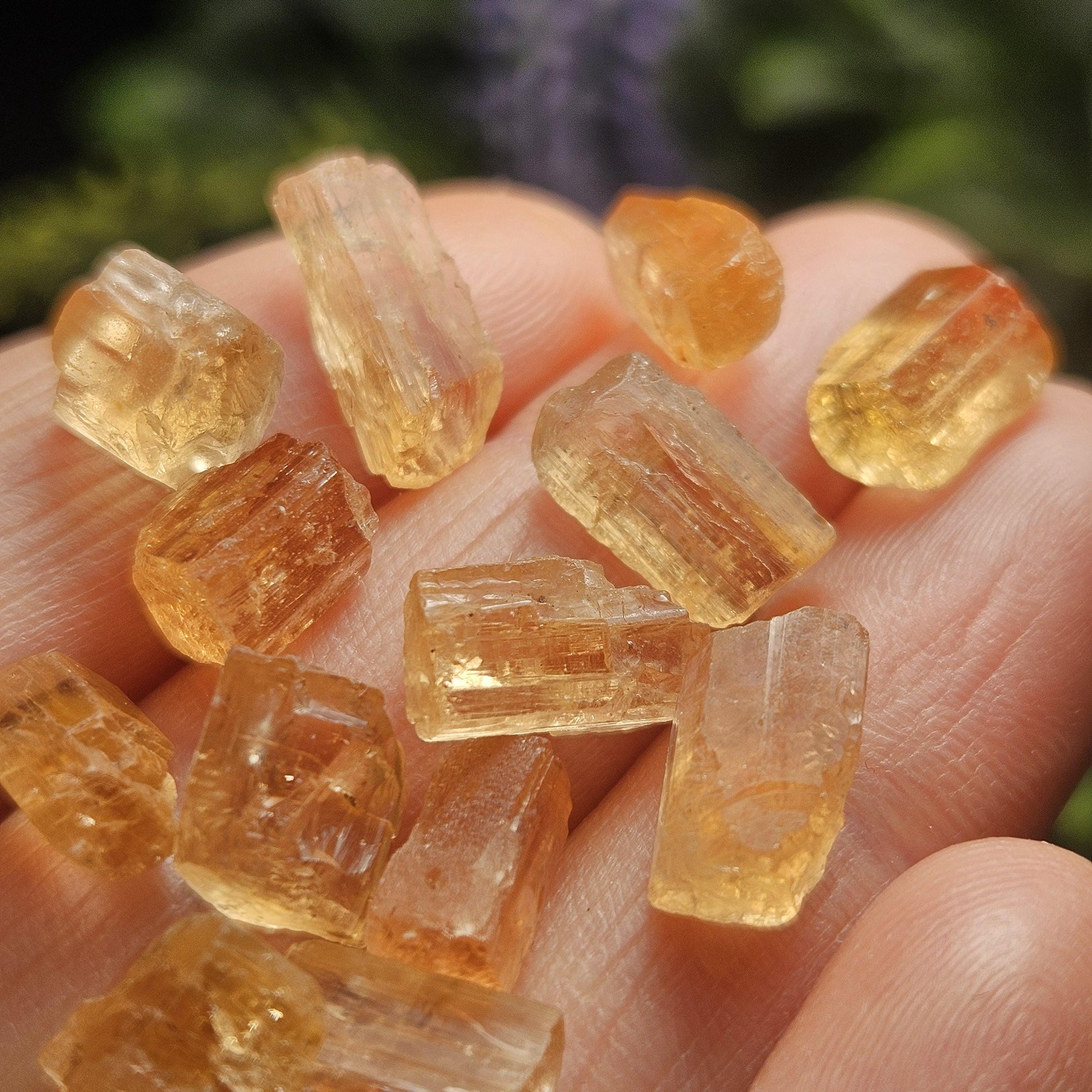 These Imperial Topaz crystals from Ouro Preto, Brazil are raw and glow with a golden translucence. Each terminated crystal displays deep striations and exhibits an etched or naturally polished termination. Each crystal weigh between .5 and 1 gram and measures between 7 and 10 millimeters.
