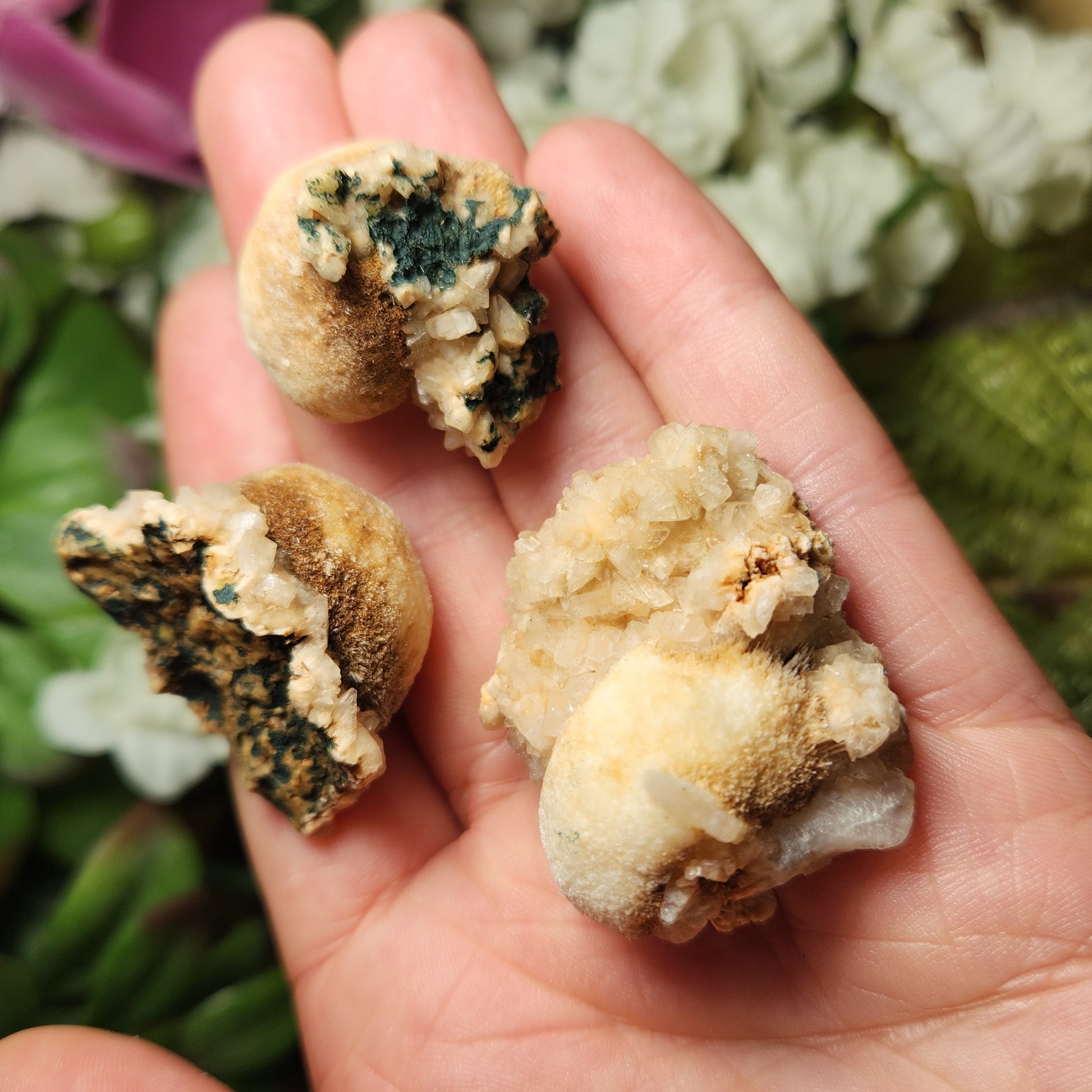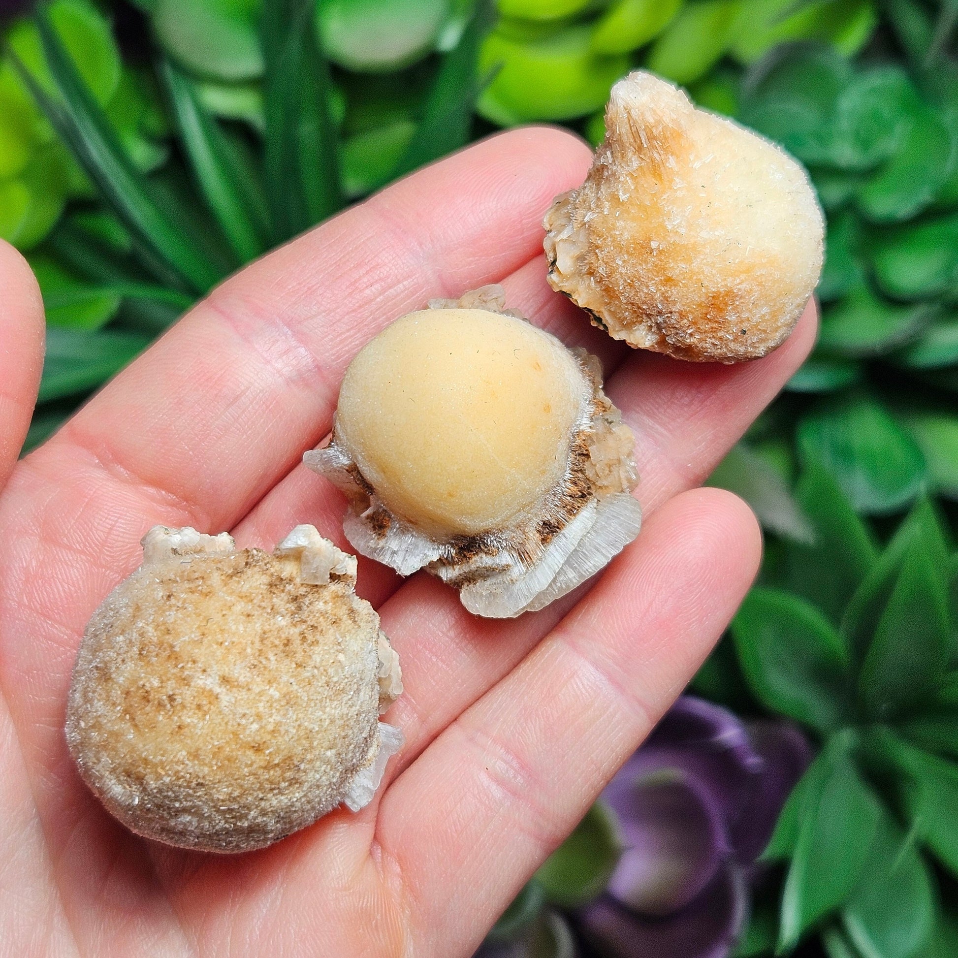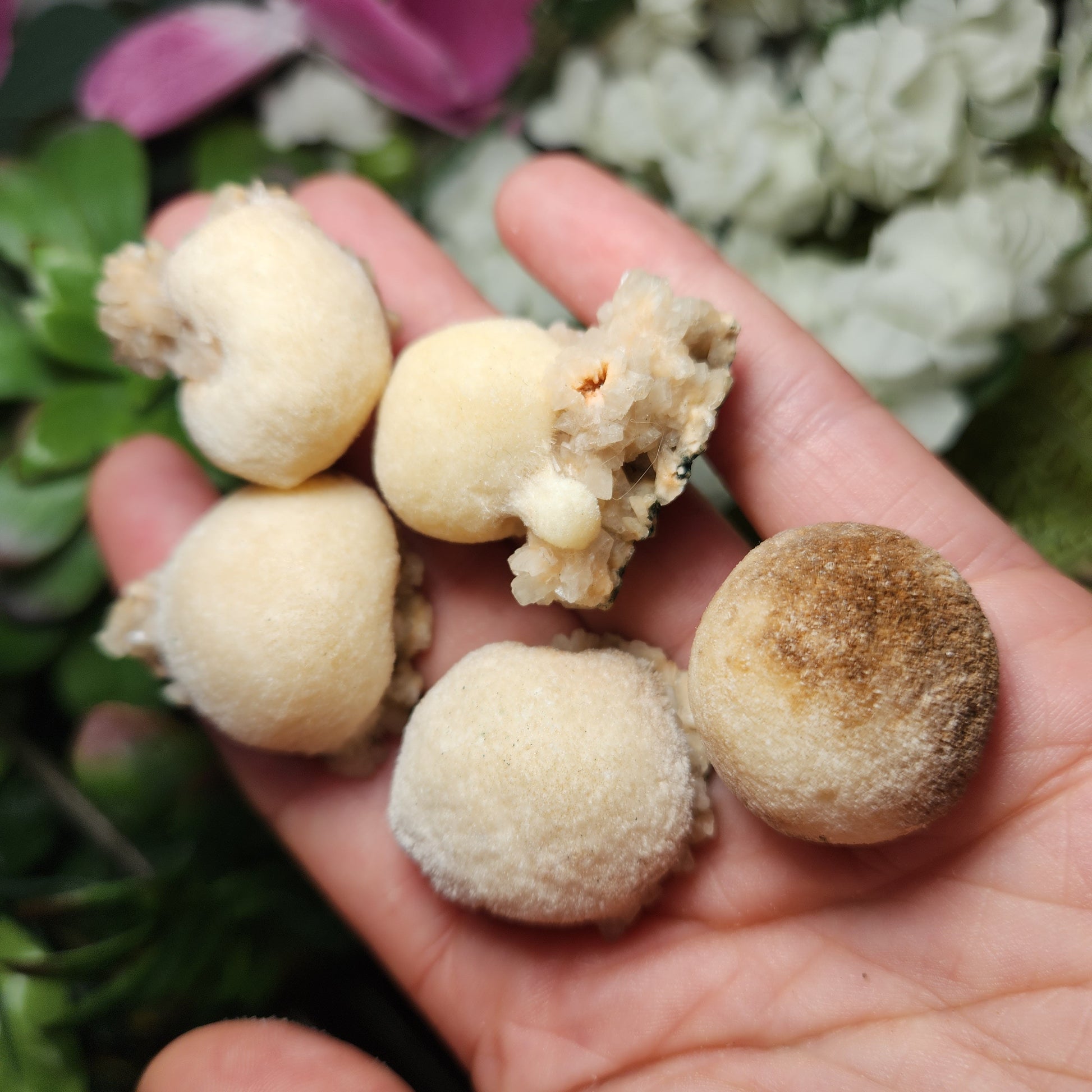 These Thomsonite specimens are in their raw, natural form. They range from rounded to more flat formations, exhibiting white, sandy tans, pale orange, and shades of brown coloring. These rare minerals showcase inclusions of Calcite and Stilbite crystallization.