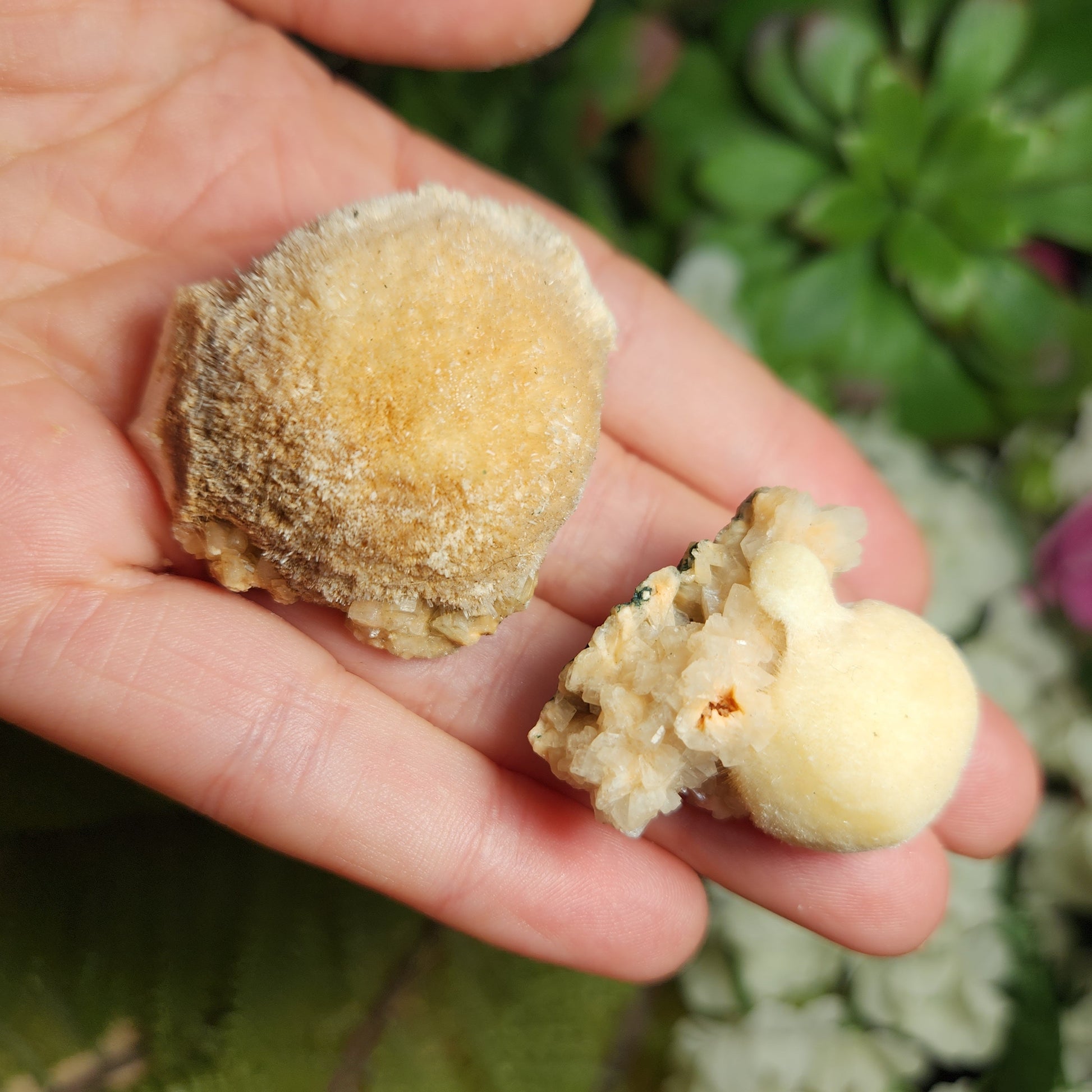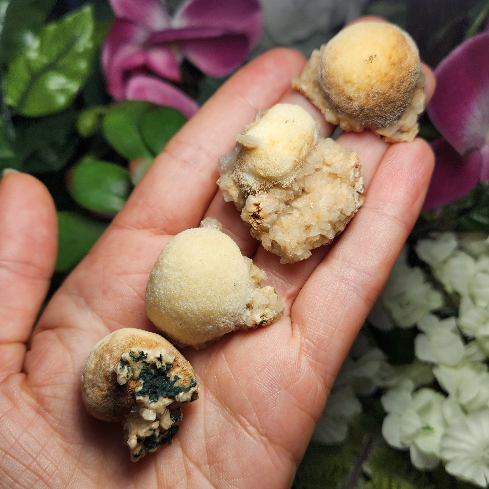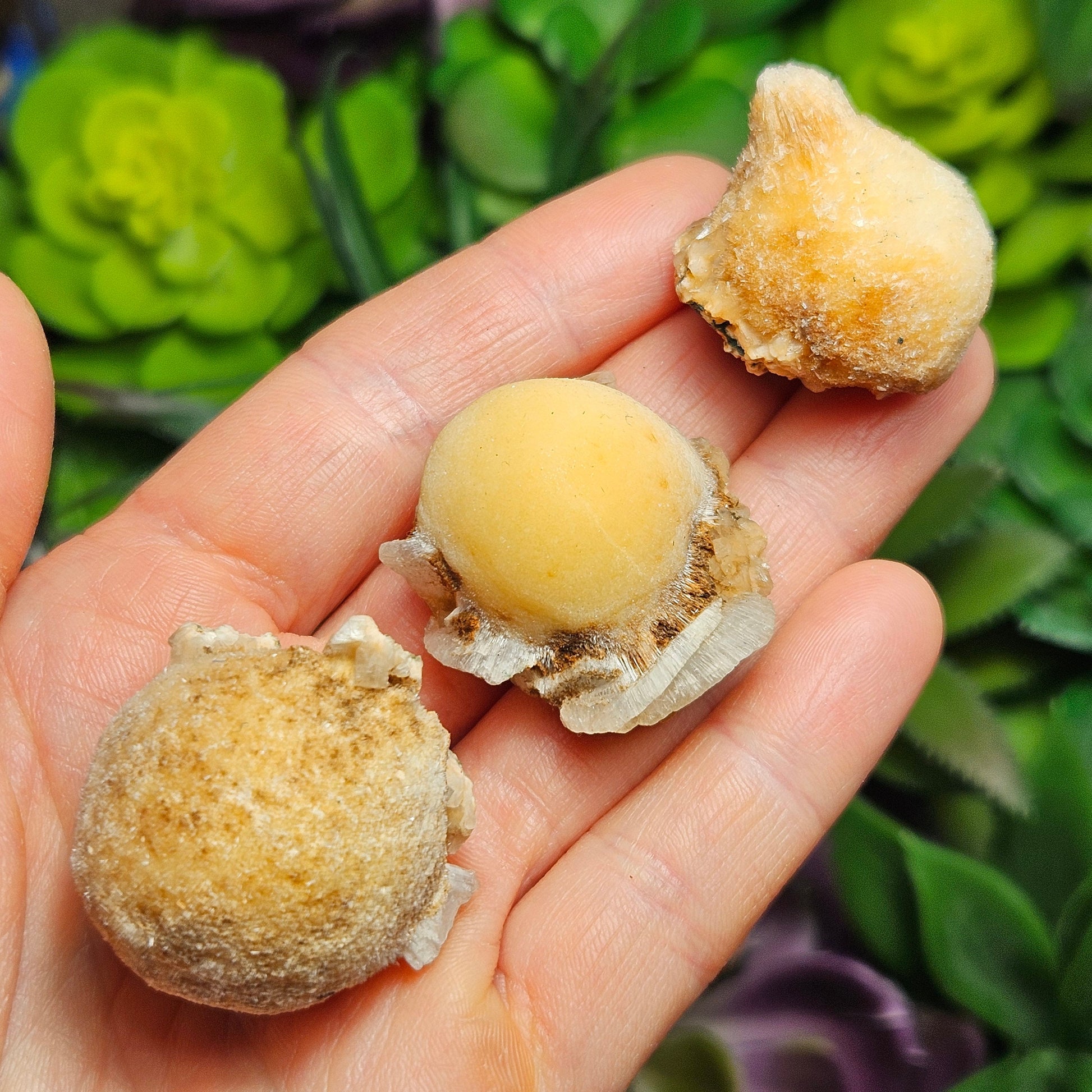 These Thomsonite specimens are in their raw, natural form. They range from rounded to more flat formations, exhibiting white, sandy tans, pale orange, and shades of brown coloring. These rare minerals showcase inclusions of Calcite and Stilbite crystallization.