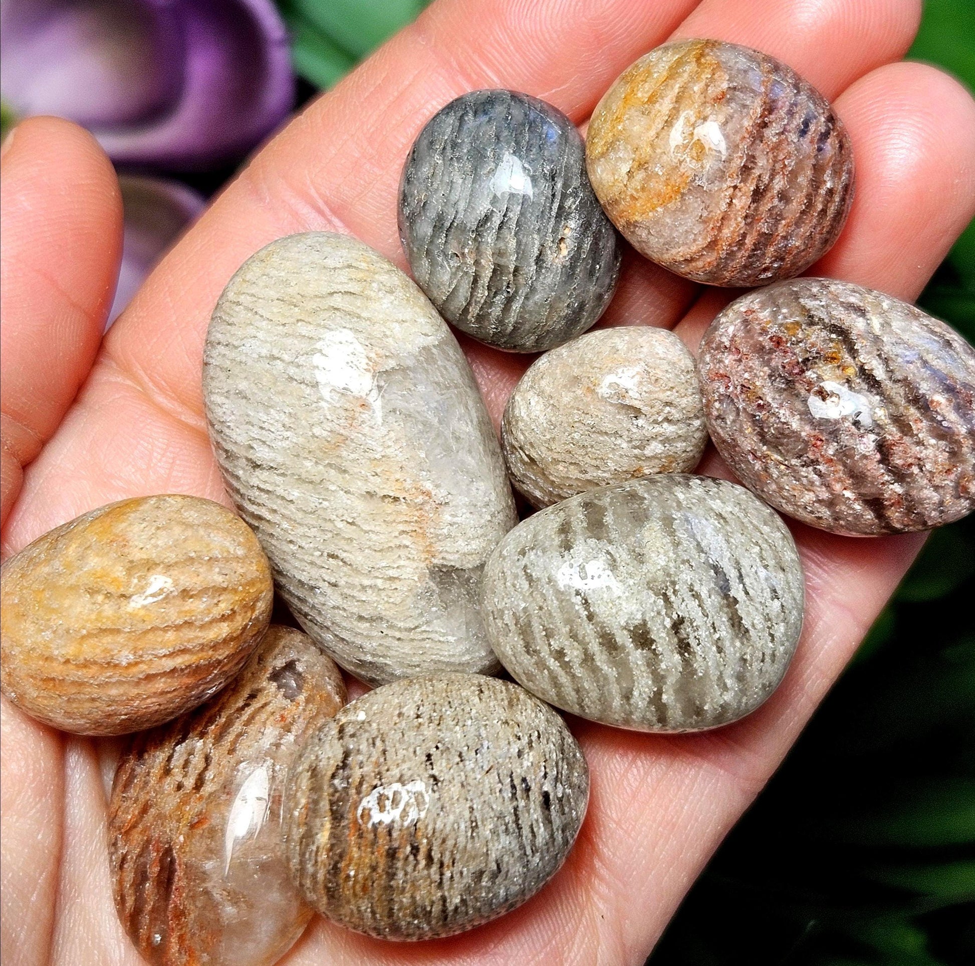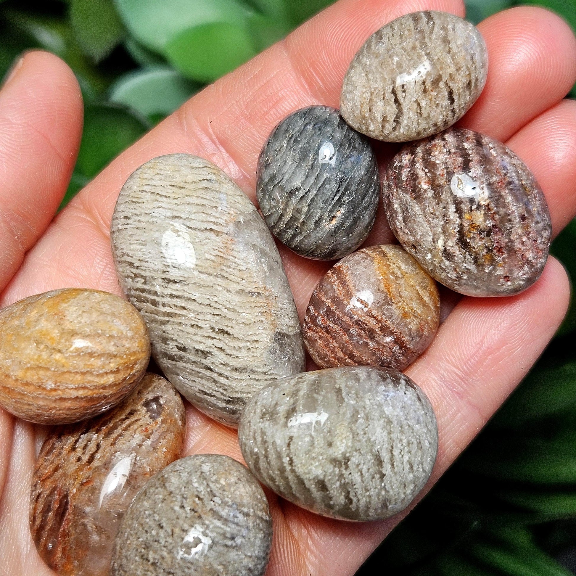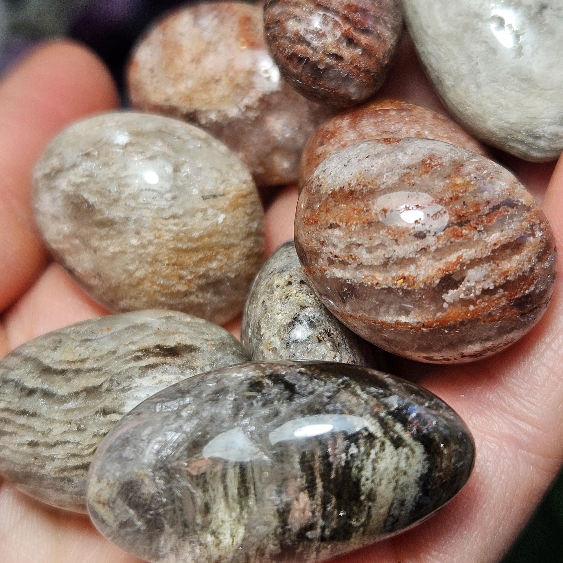 These gorgeous Lodolite crystals from Brazil exhibit characteristics that are known as "Thousand Layer Lodolite". It includes many layers of mineral inclusions, creating an aesthetic look. These tumbled stones have a high polish and may include tones of taupe, peach, cream and grey.