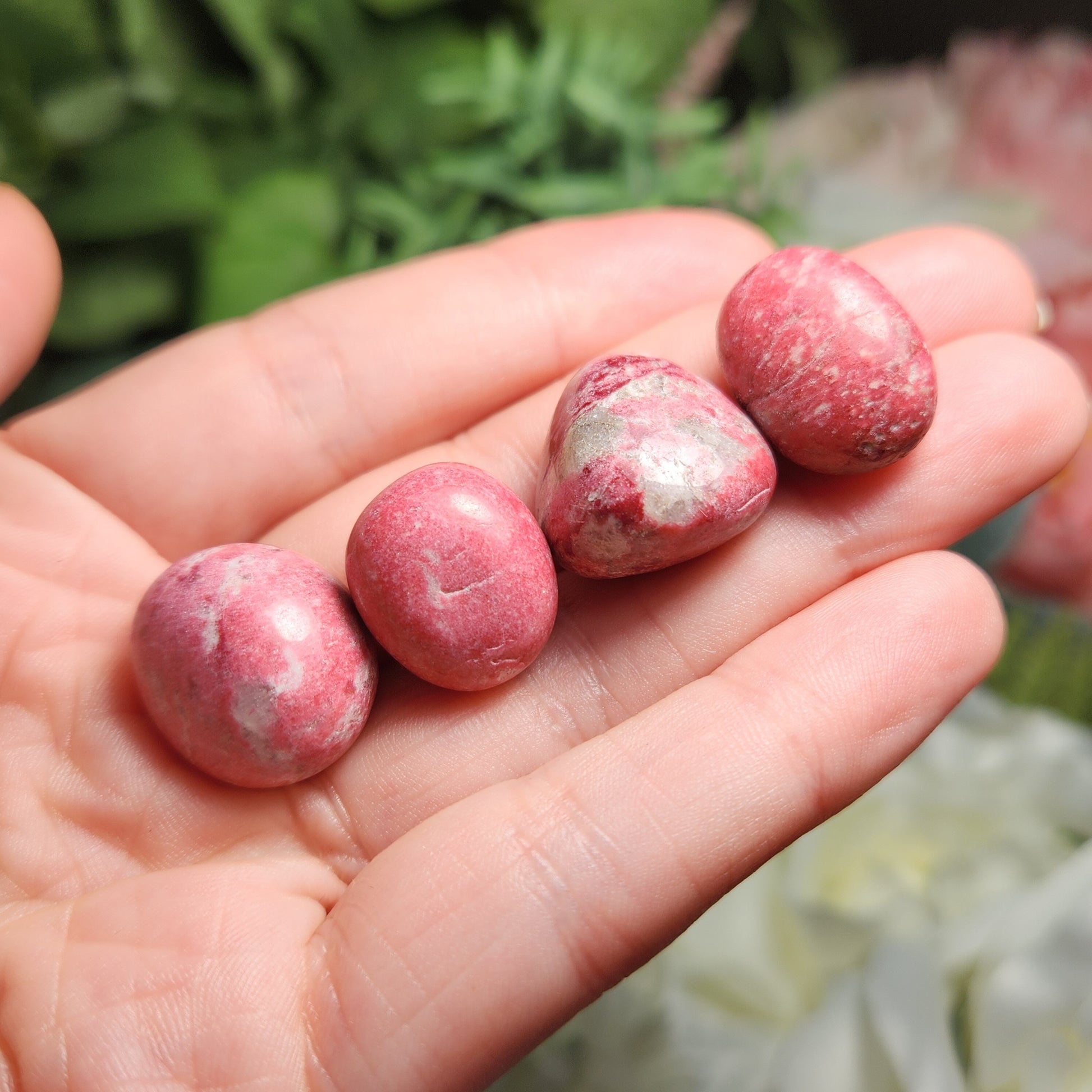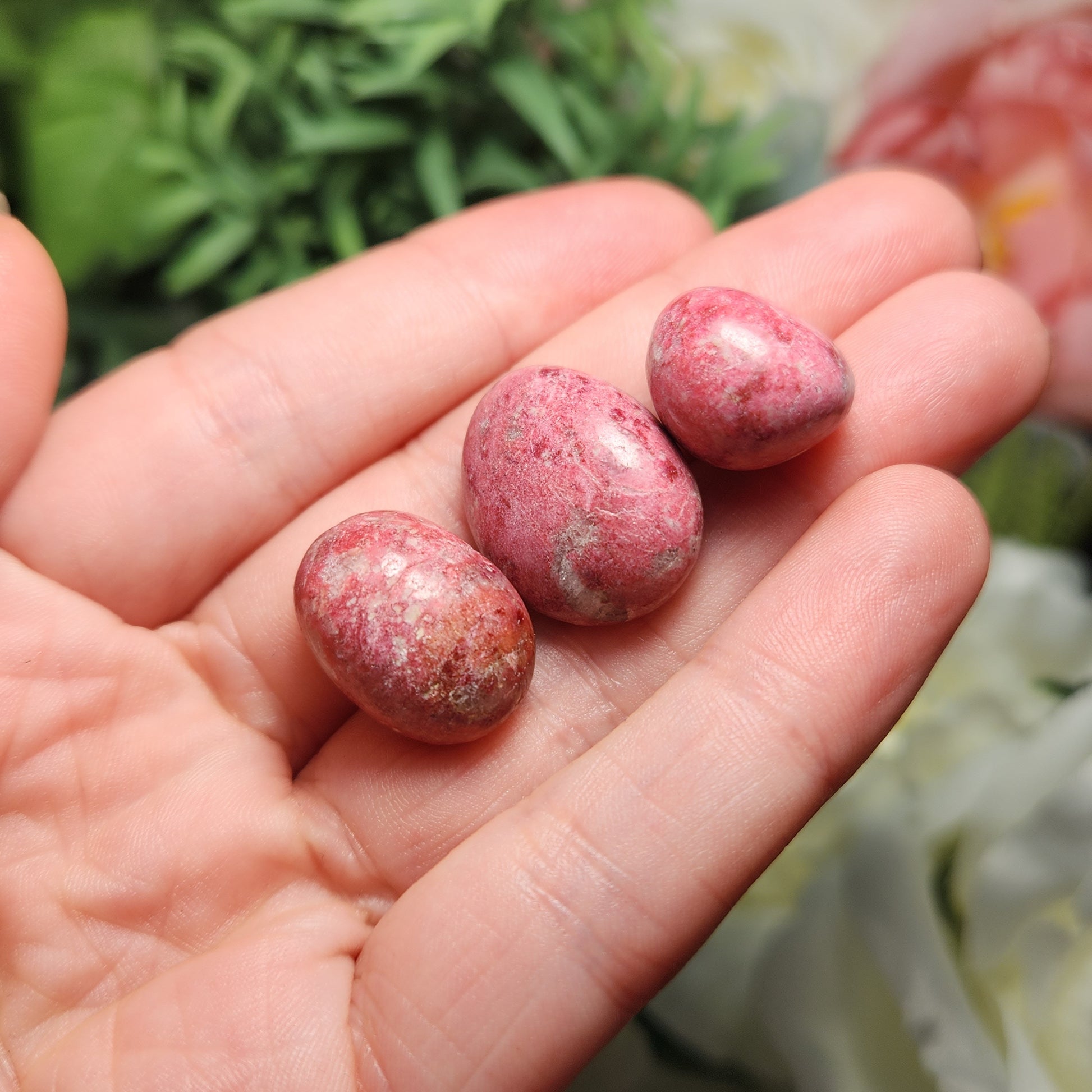 These Thulite stones have rounded shapes and have been tumbled to a smooth polish. They exhibit a rosy pink coloring mottled with white. Each specimen measures between 15mm and 20mm.