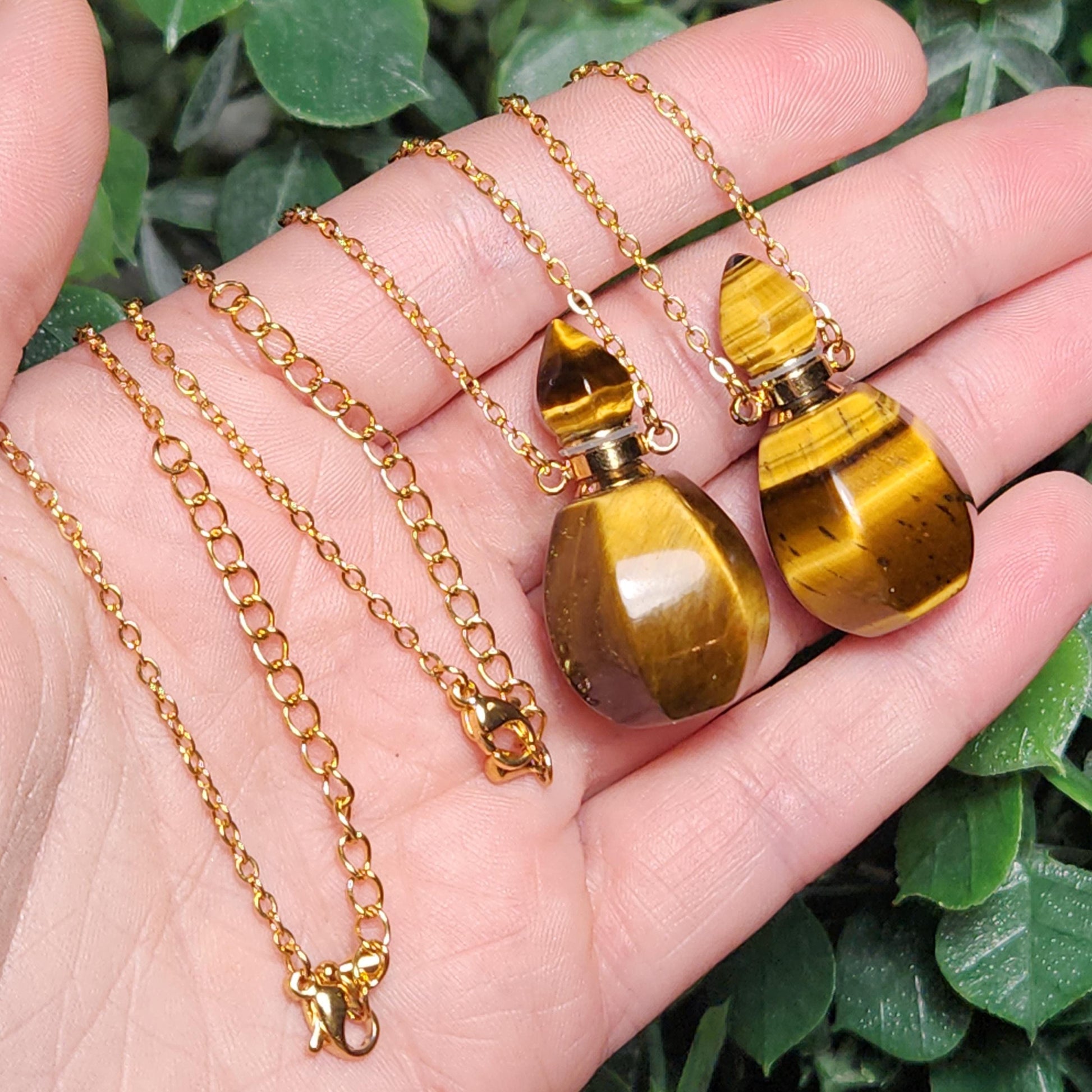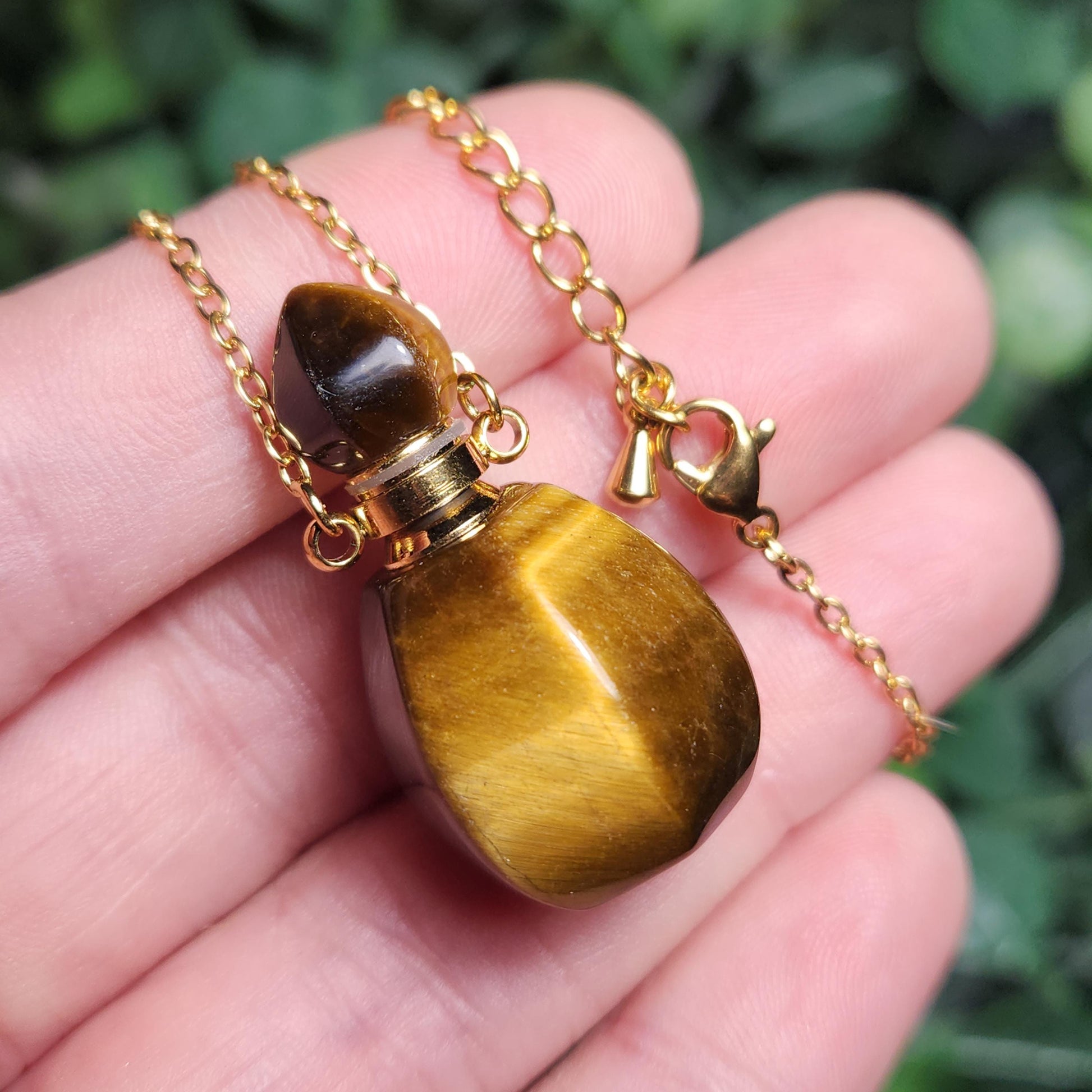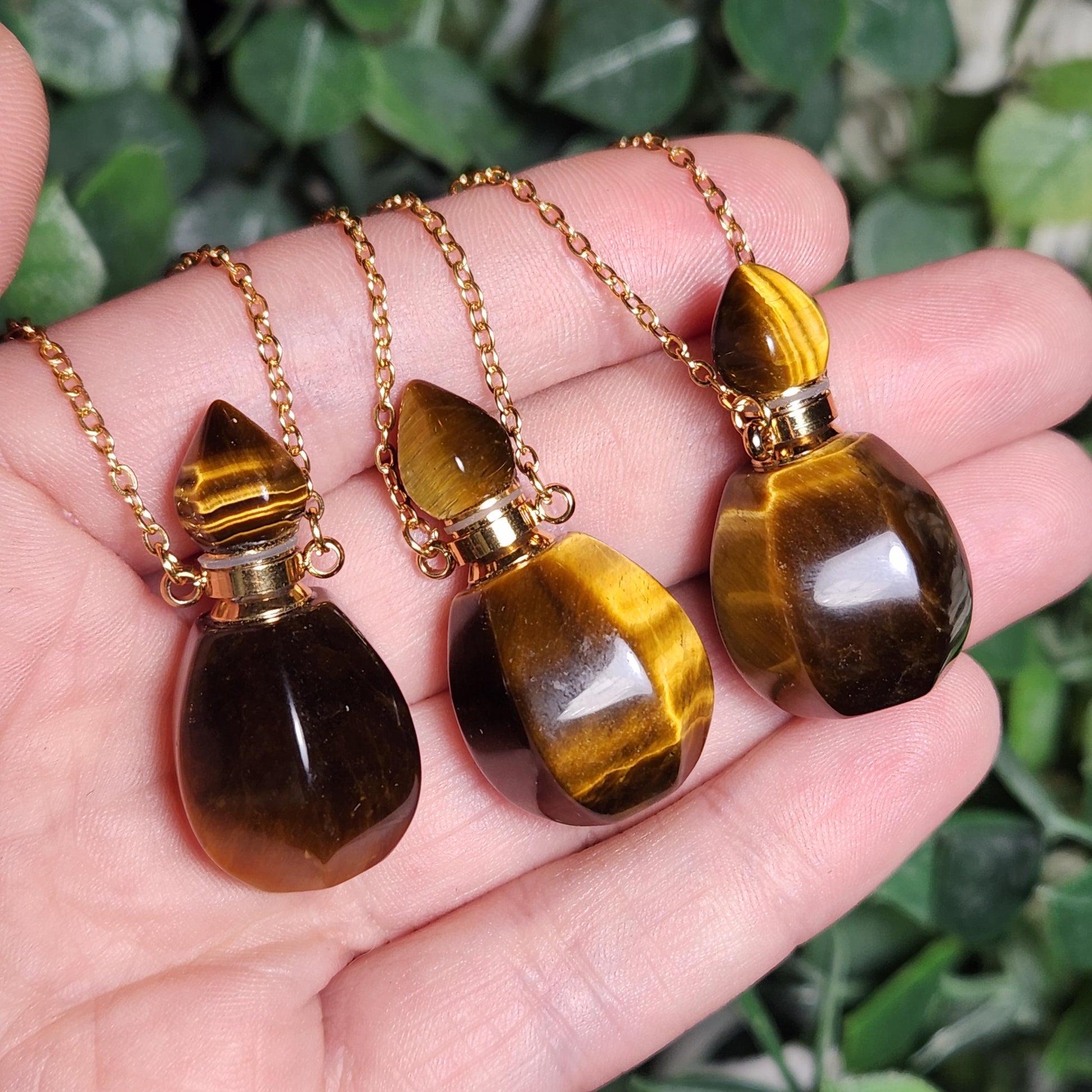 These functional oil bottles have been carved out of natural Tiger's Eye gemstones. Their openings are approximately 3mm and they are held securely closed with screw-on tops. Each 30-35mm pendant hangs from a copper-colored necklace chain that measures approximately 18 inches in length and has a lobster clasp closure. Choose your preference from the drop-down menu!