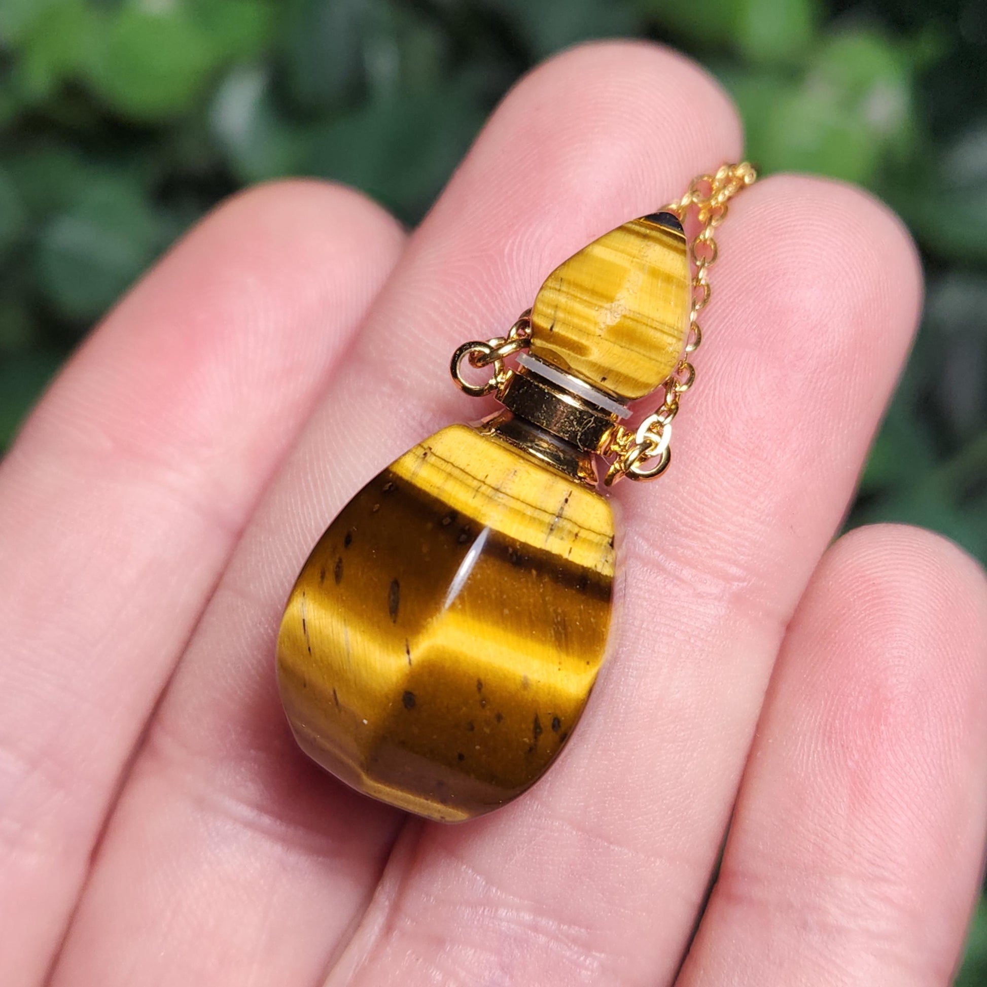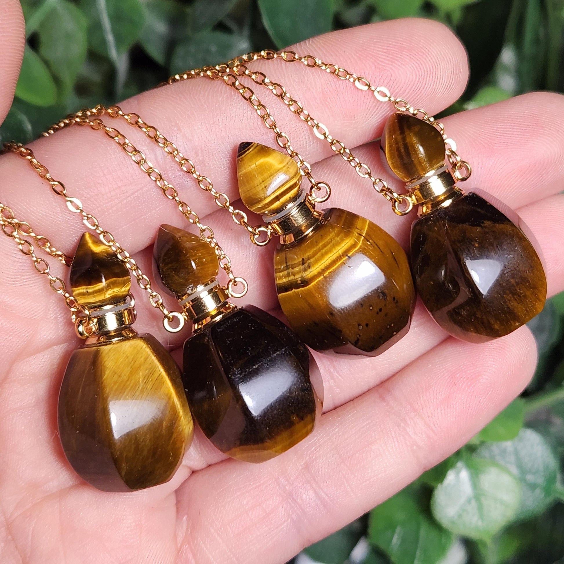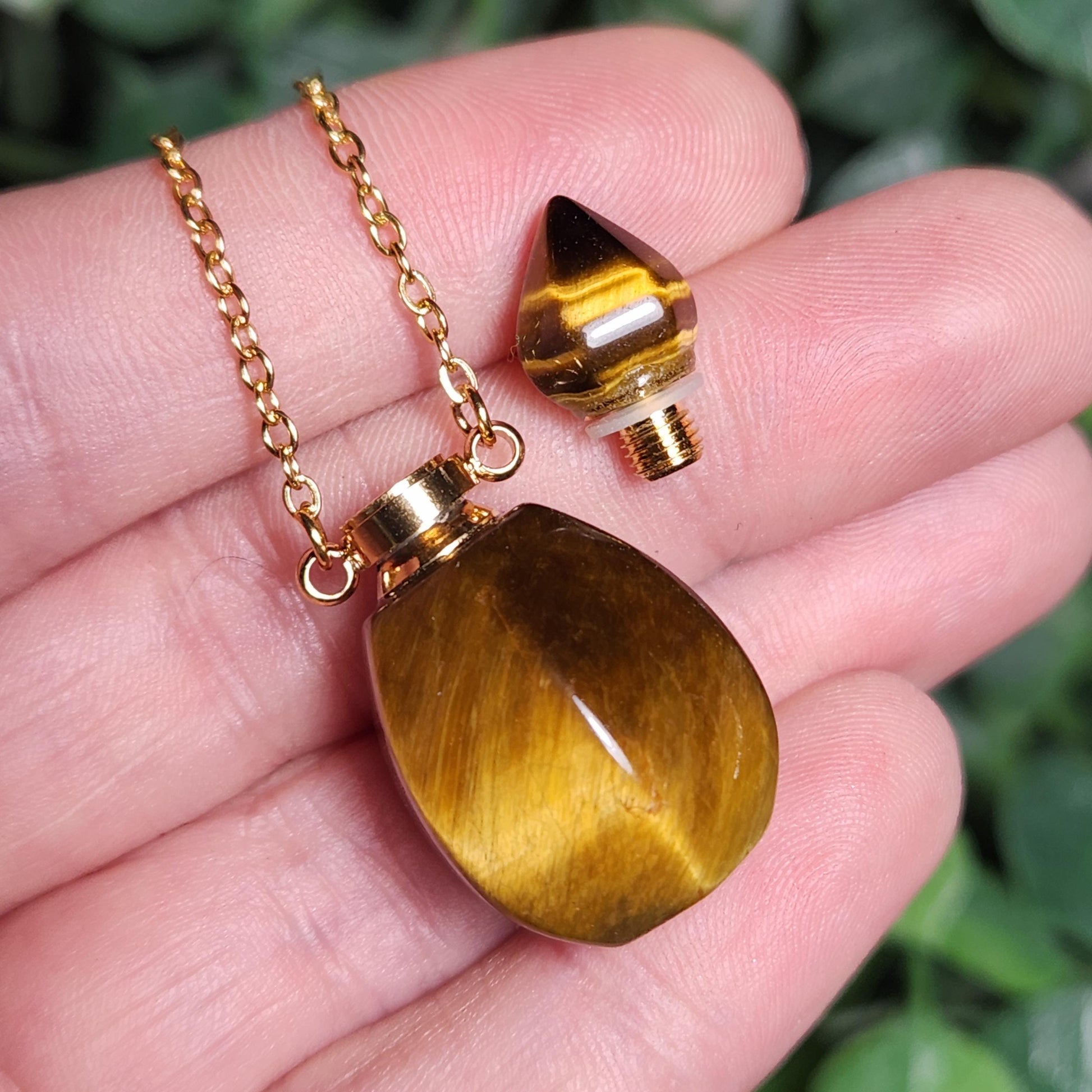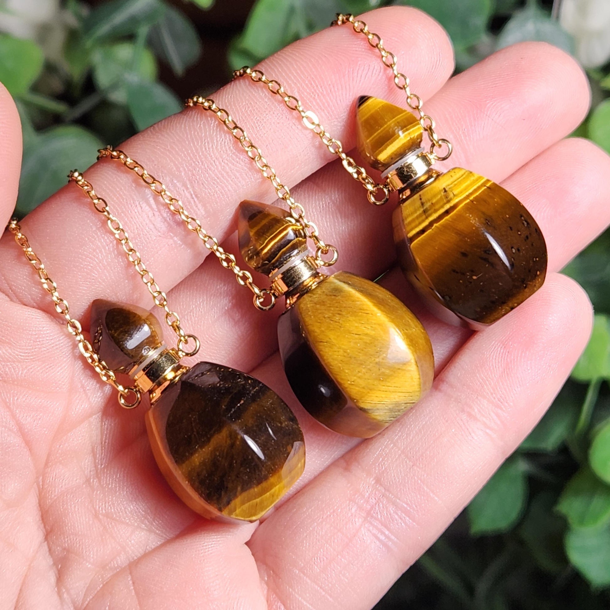 These functional oil bottles have been carved out of natural Tiger's Eye gemstones. Their openings are approximately 3mm and they are held securely closed with screw-on tops. Each 30-35mm pendant hangs from a copper-colored necklace chain that measures approximately 18 inches in length and has a lobster clasp closure. Choose your preference from the drop-down menu!