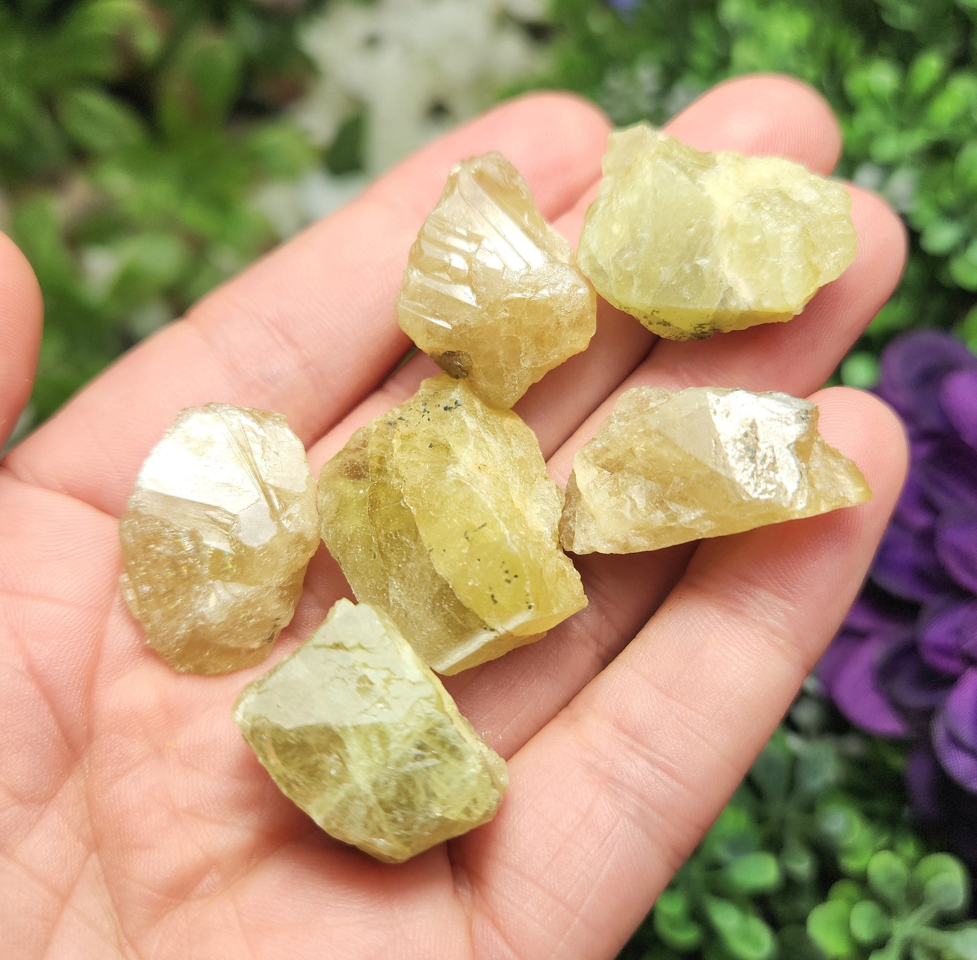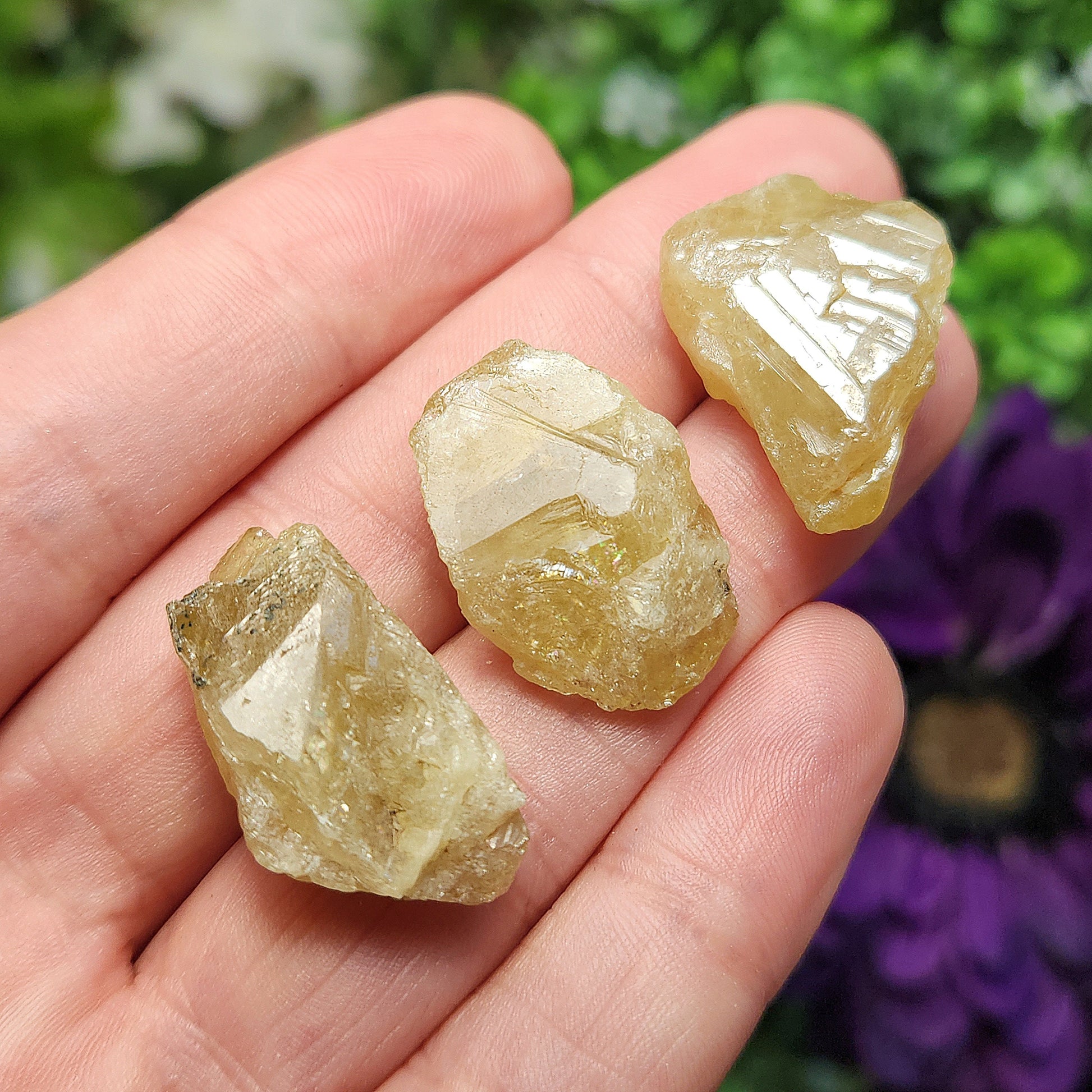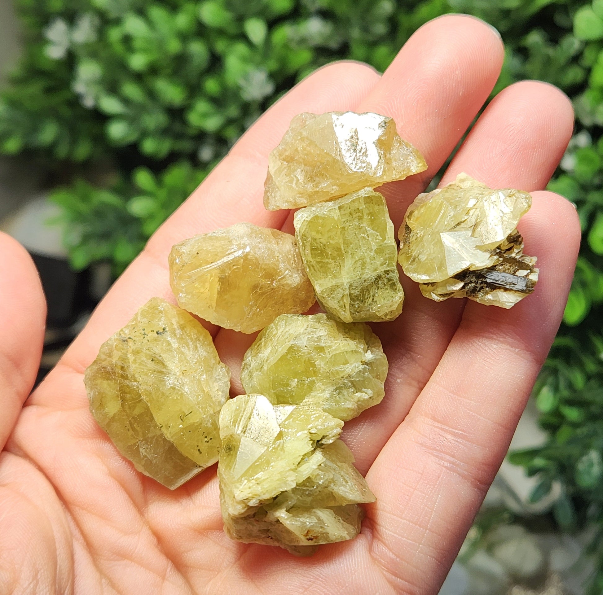 These raw Titanite crystals have terminated faces that catch and reflect light, causing them to shine. They exhibit a chartreuse coloring with a slight translucence that is revealed when backlit.