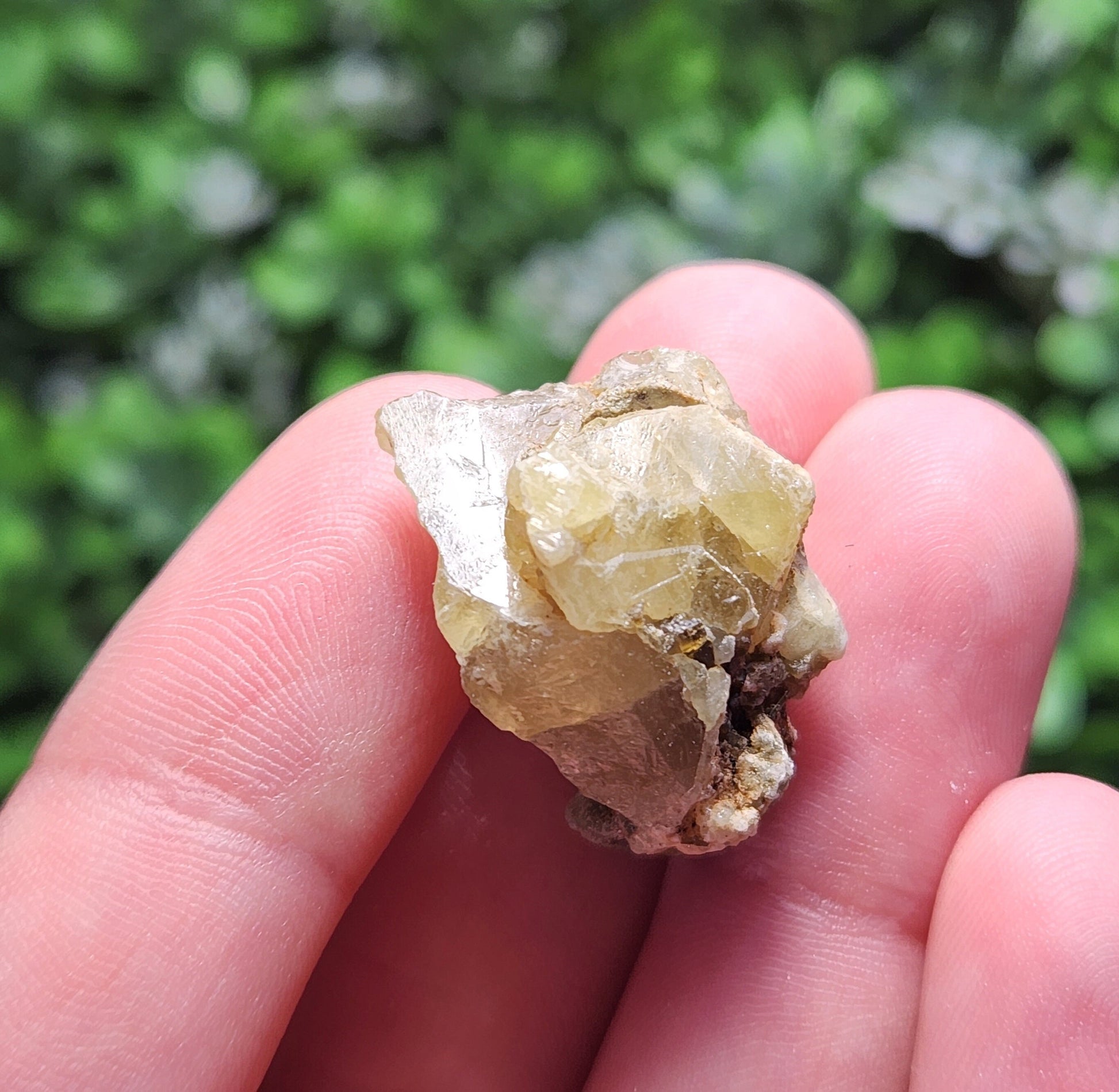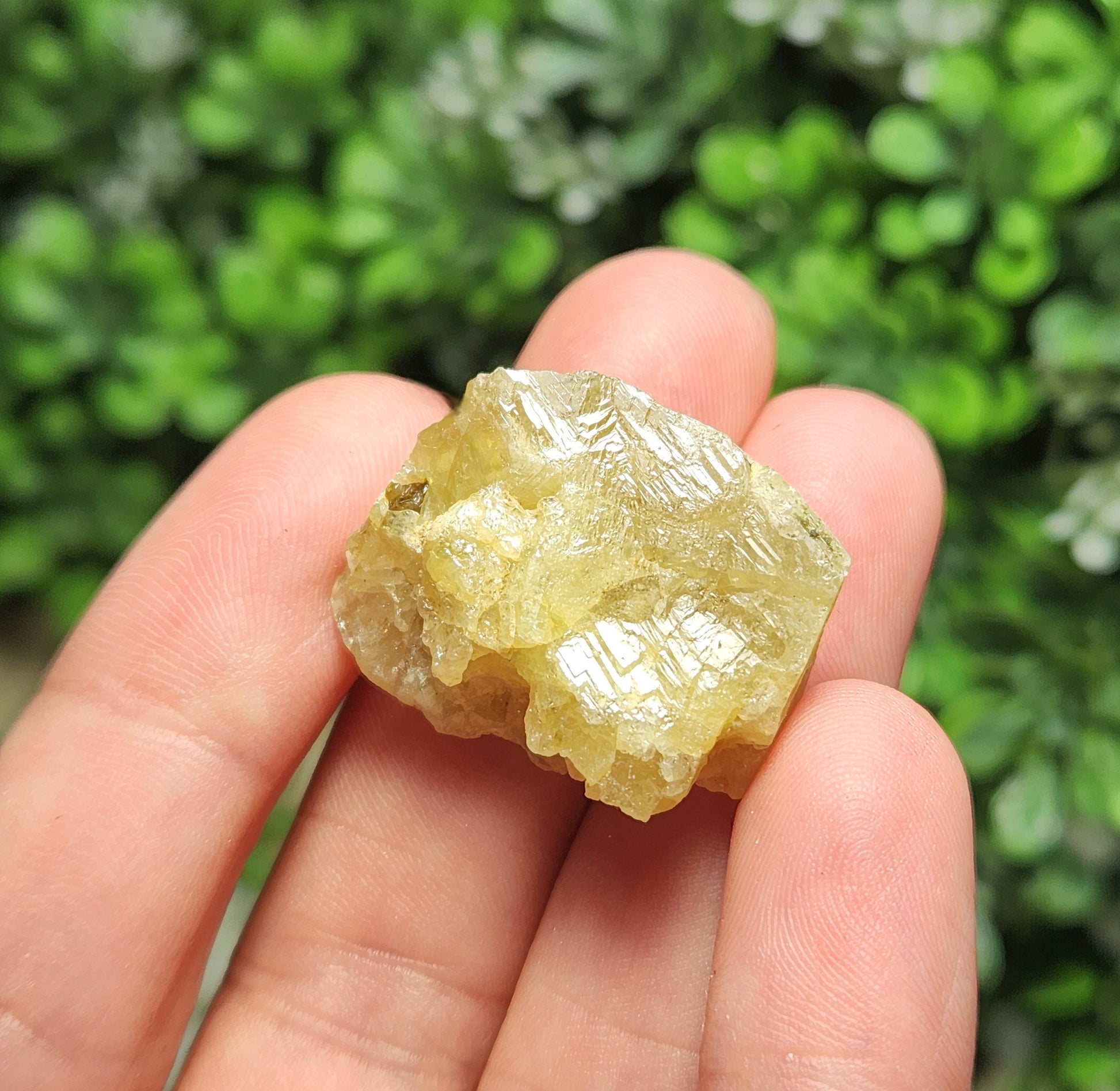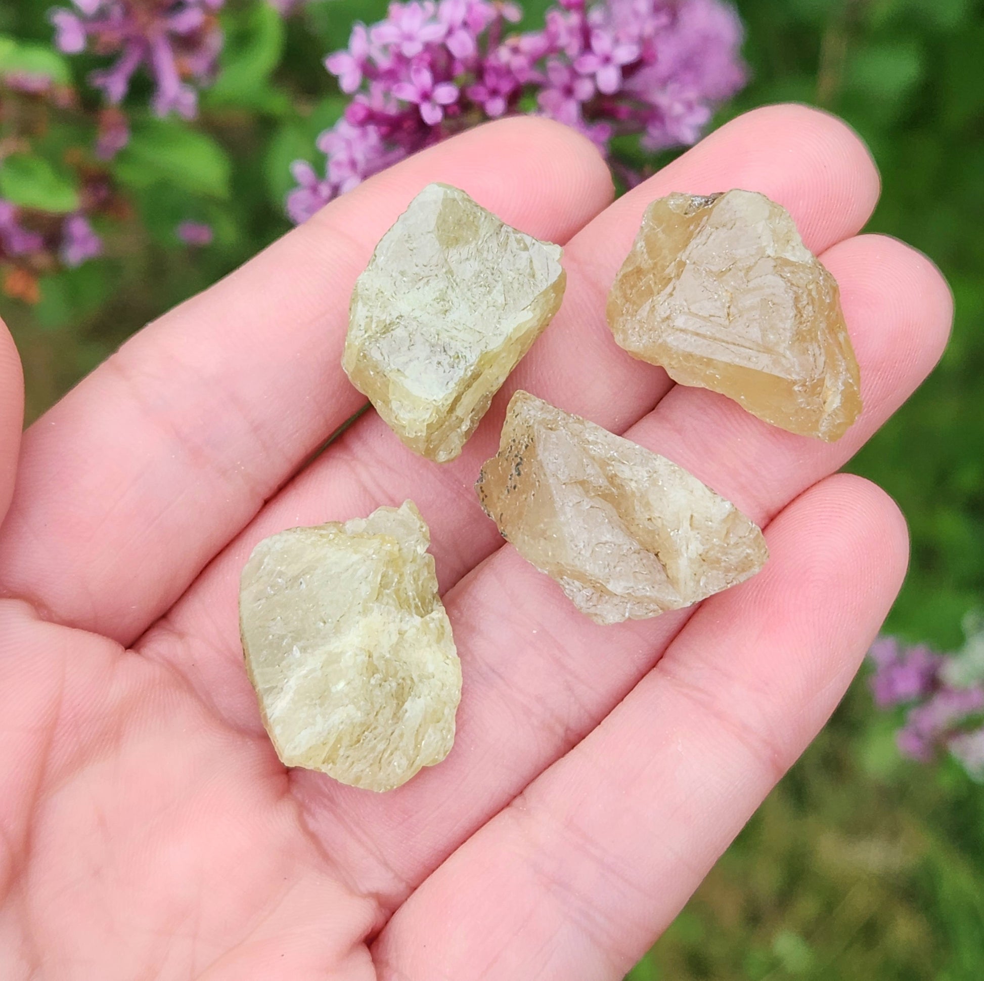 These raw Titanite crystals have terminated faces that catch and reflect light, causing them to shine. They exhibit a chartreuse coloring with a slight translucence that is revealed when backlit.