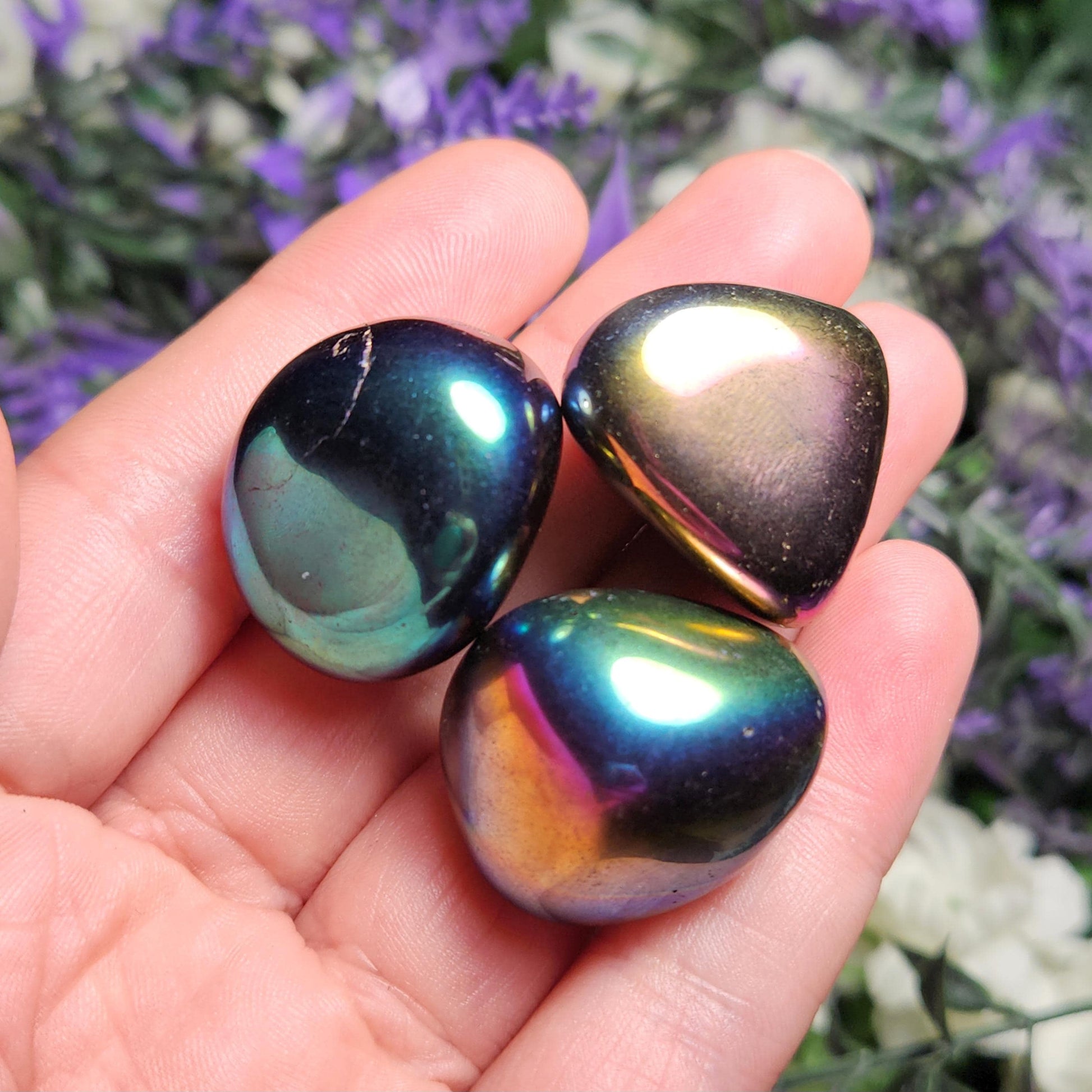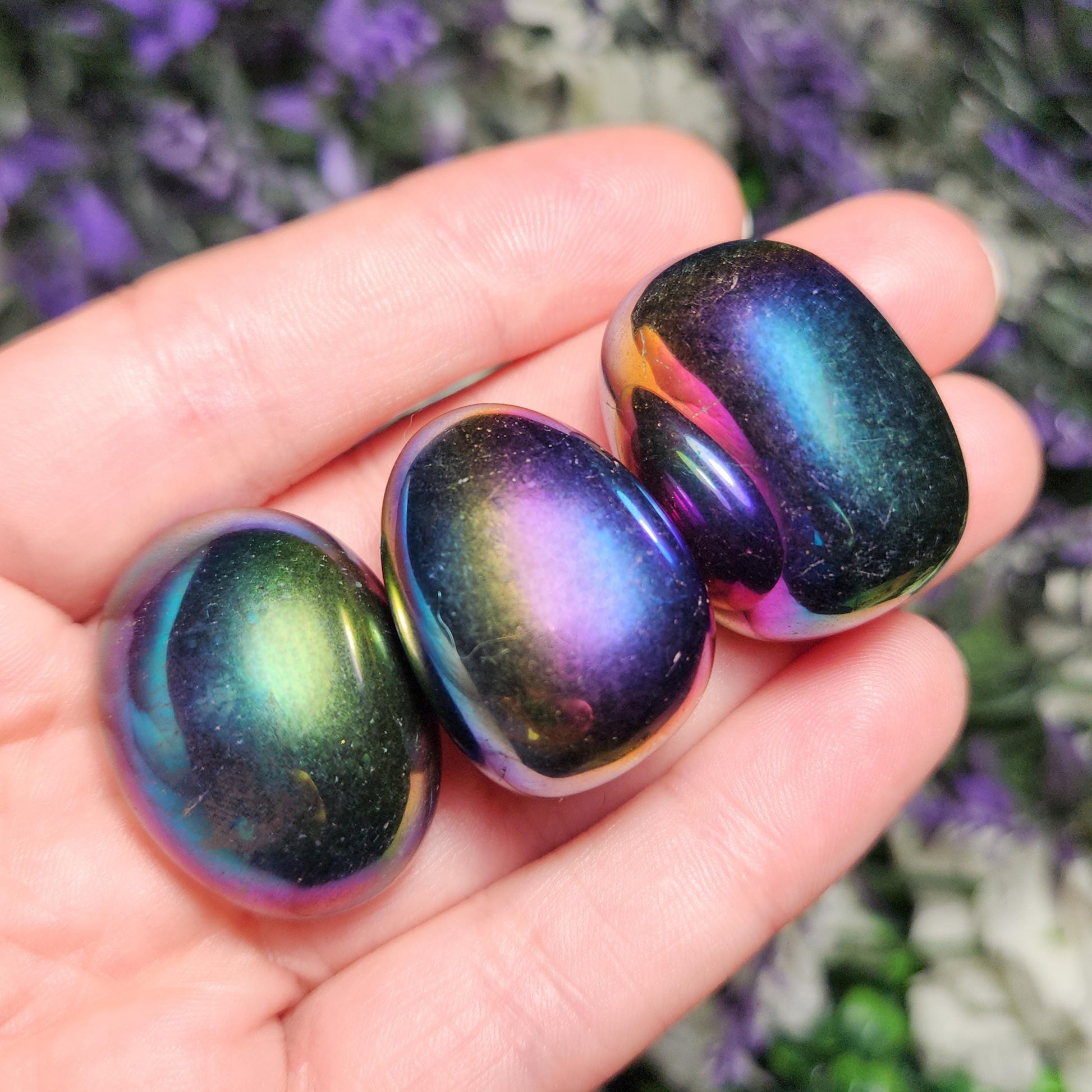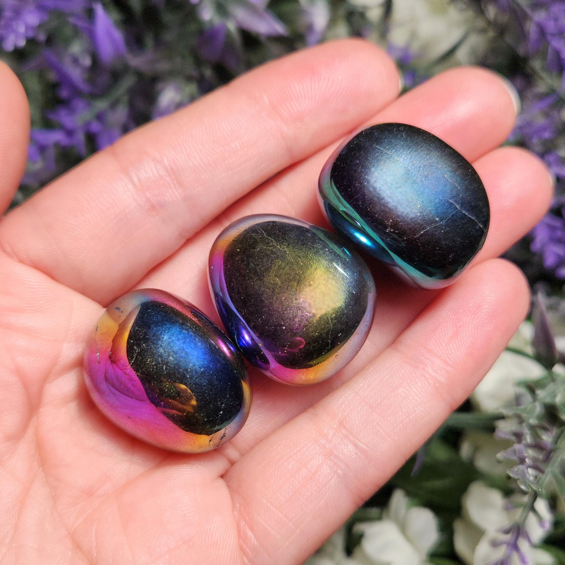 These tumbled Titanium Aura Rose Quartz crystals have a smooth polish and a strong rainbow shine. Each specimen measures between .75 inches and 1 inch.