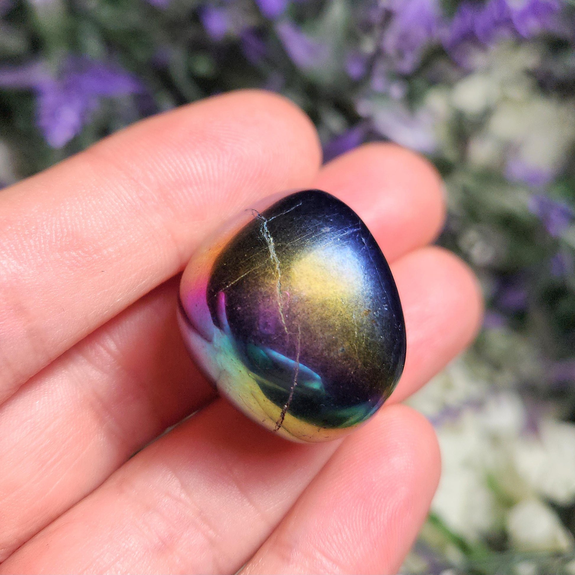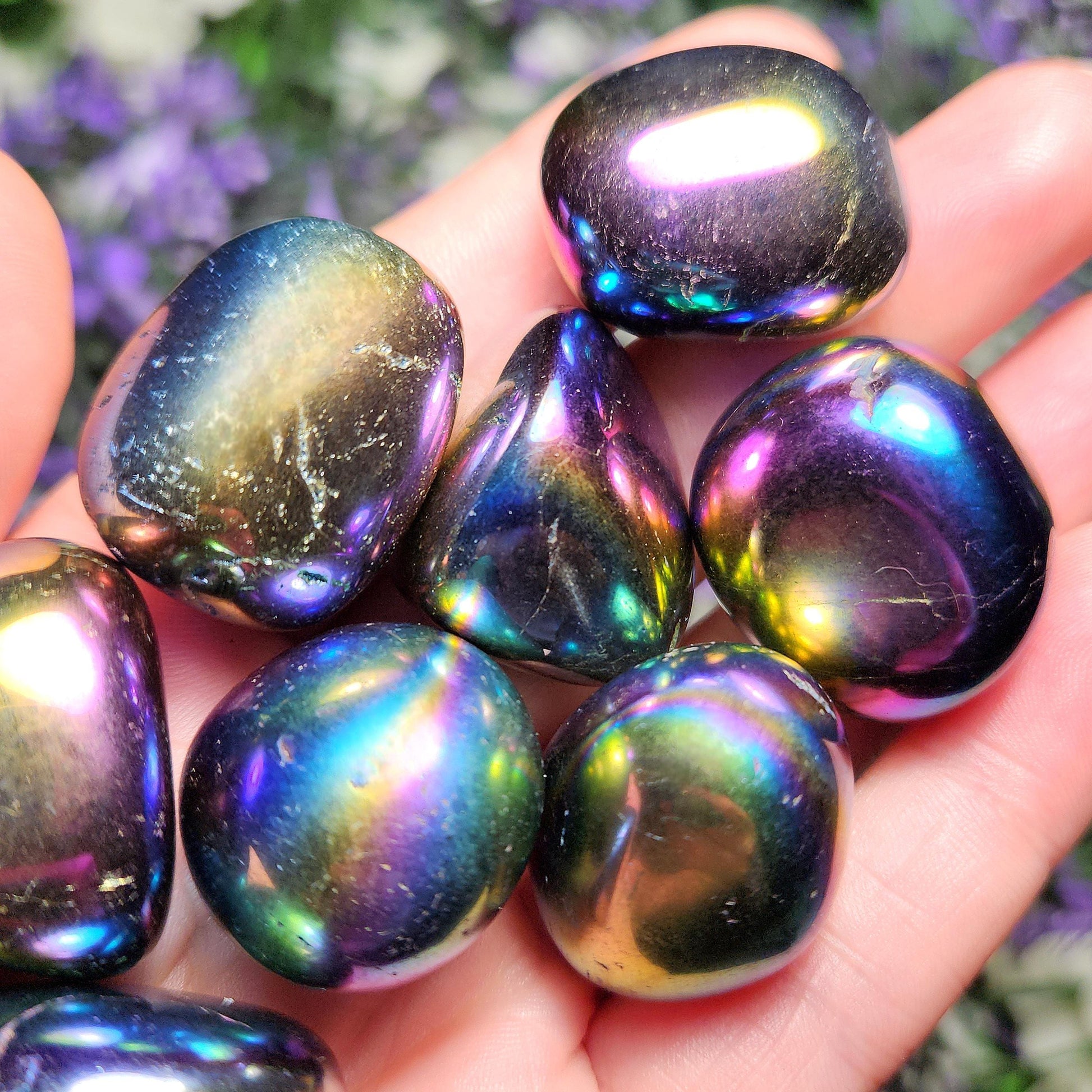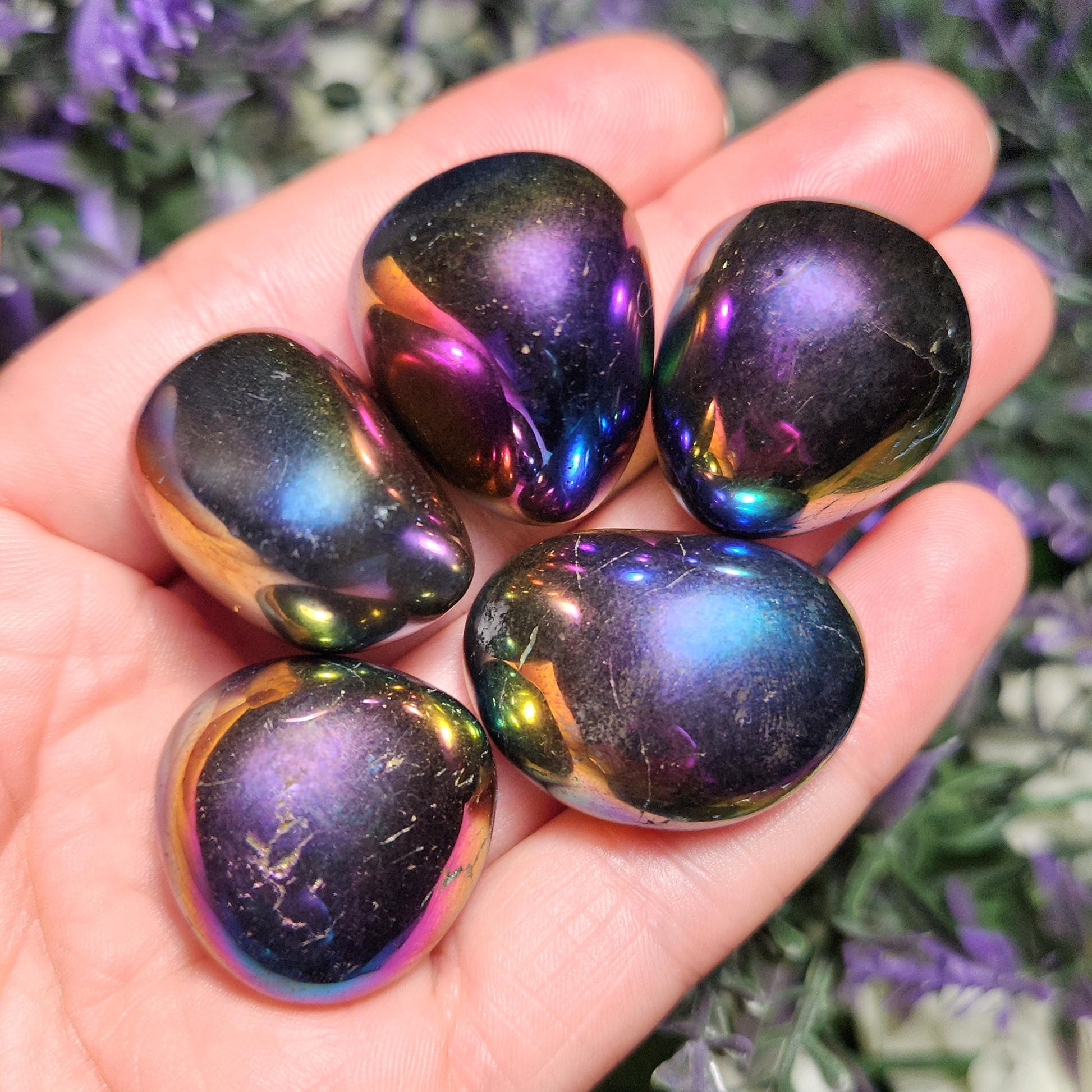 These tumbled Titanium Aura Rose Quartz crystals have a smooth polish and a strong rainbow shine. Each specimen measures between .75 inches and 1 inch.