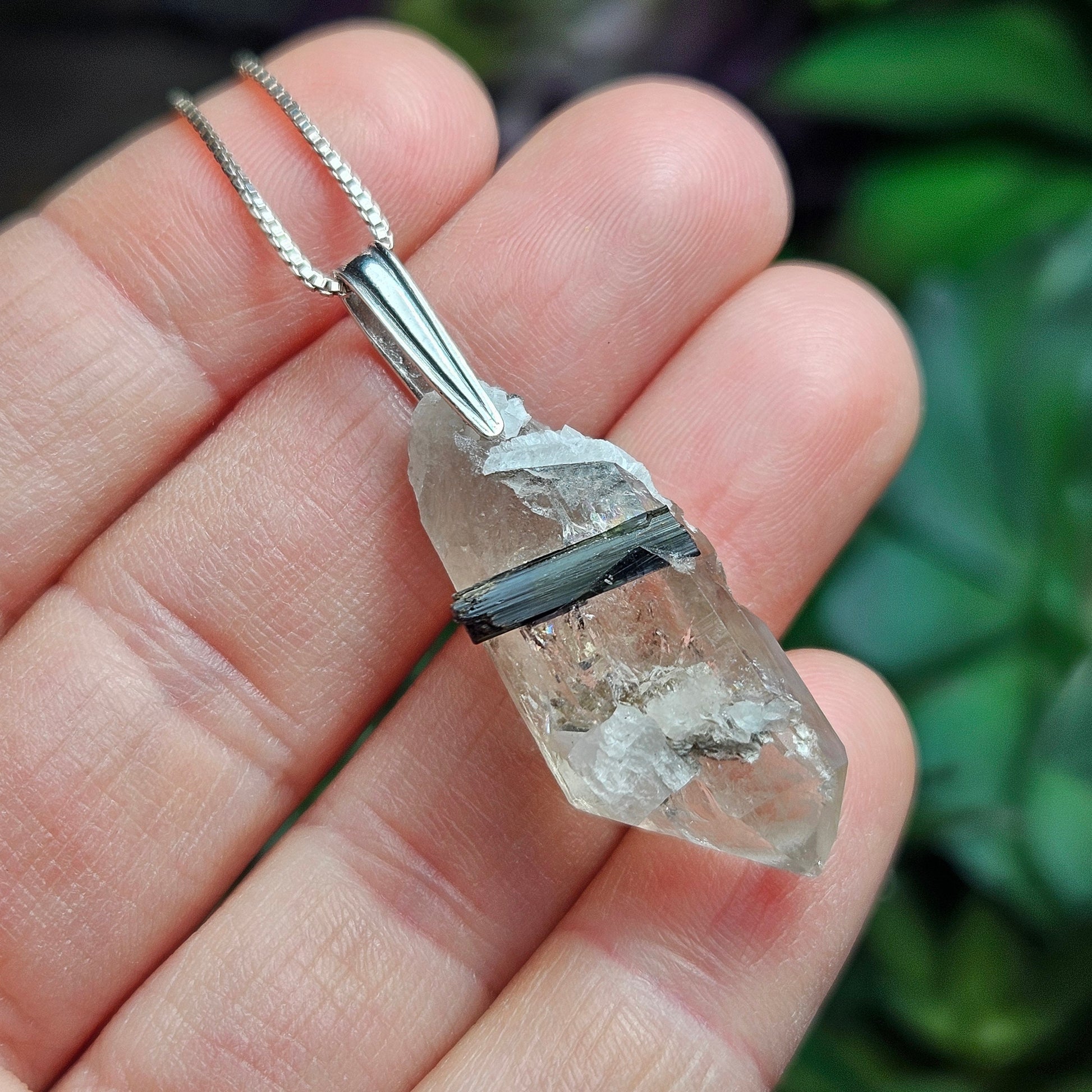 These Quartz crystals have excellent clarity, showing off the large amount of shining Black Tourmaline inclusions inside. These crystals have been carved into cabochons and polished to a high sheen. Each crystal has been handpicked and processed into an intentional piece of jewelry using .925 Sterling Silver. Each pendant measures approximately 40mm by 12mm - these measurements are meant to give a general idea of size; the actual dimensions of the pendant you receive may vary slightly. The silver chain used in the photos is to help envision how this pendant will look while adorned but is not included in the listing.