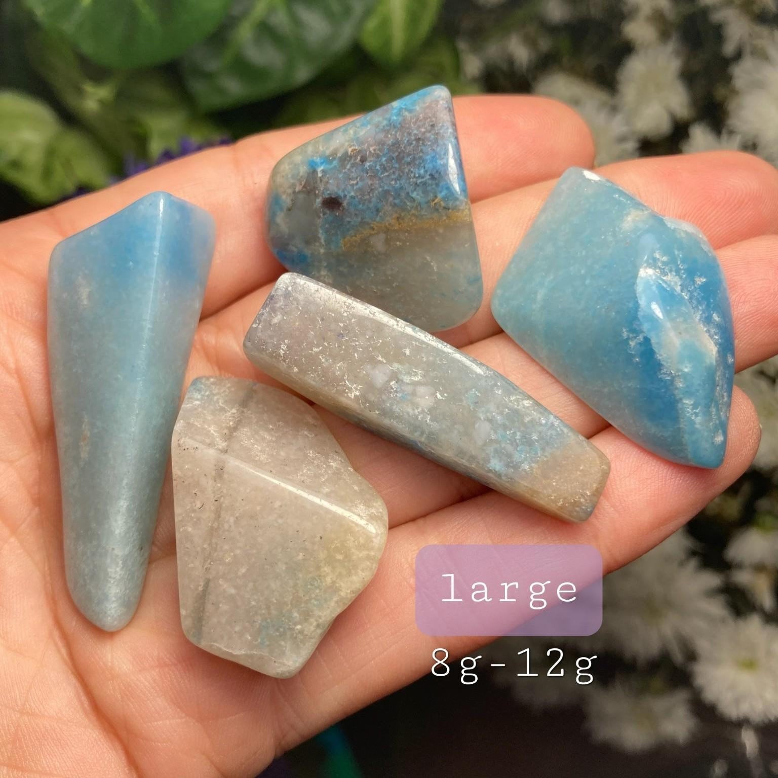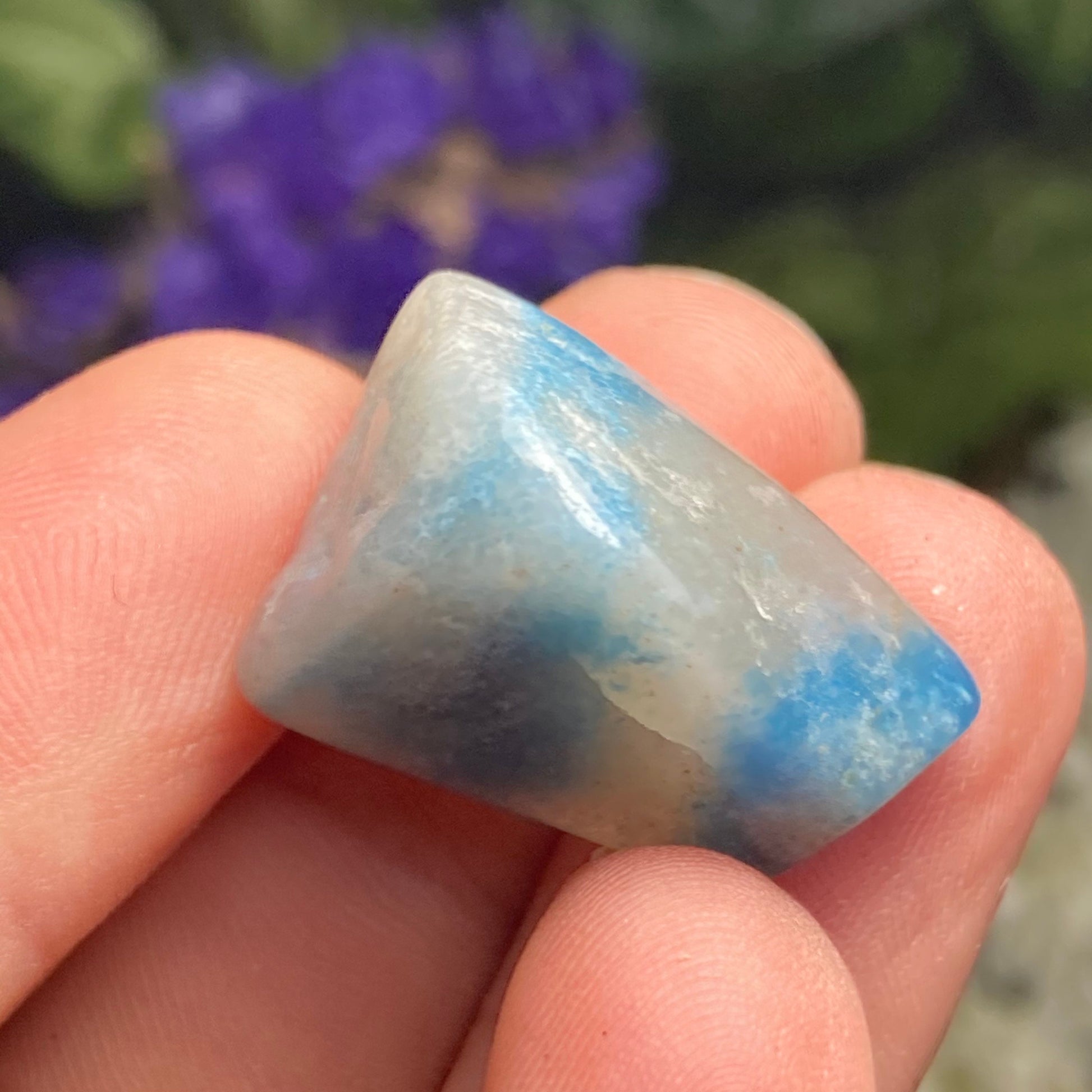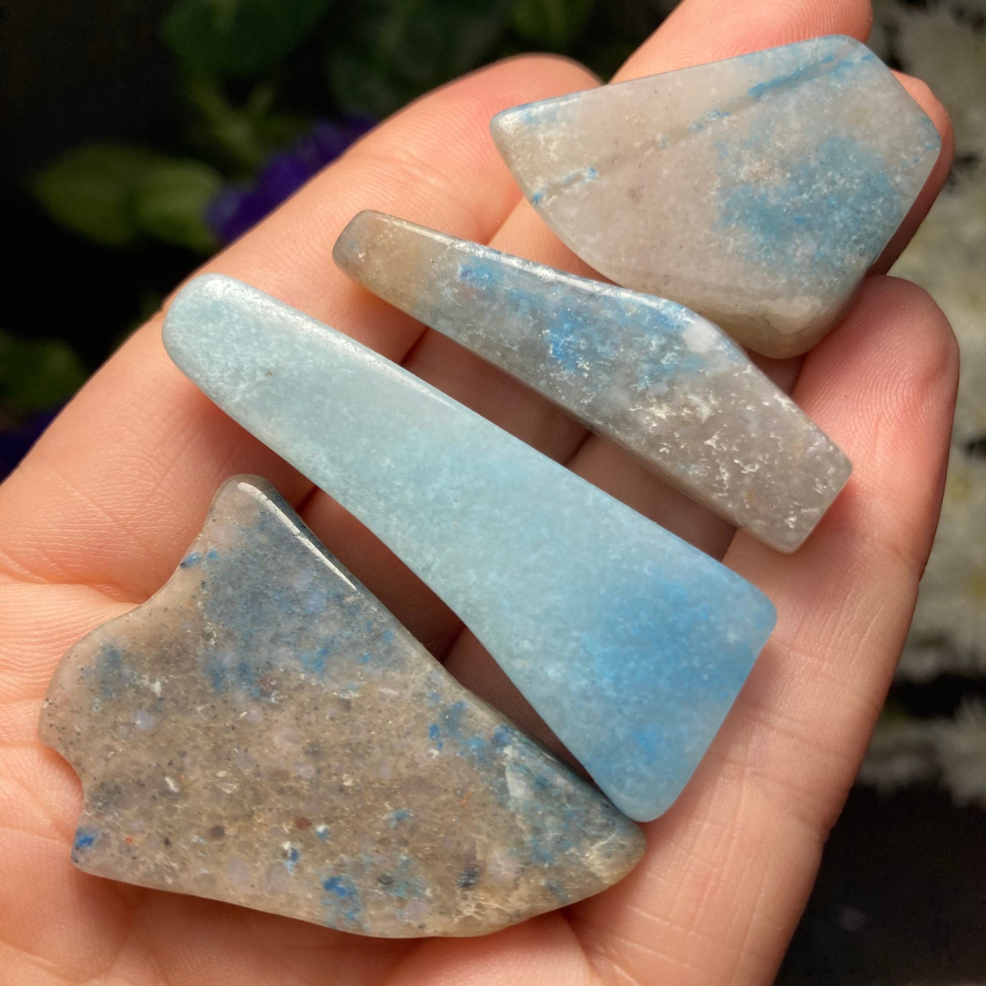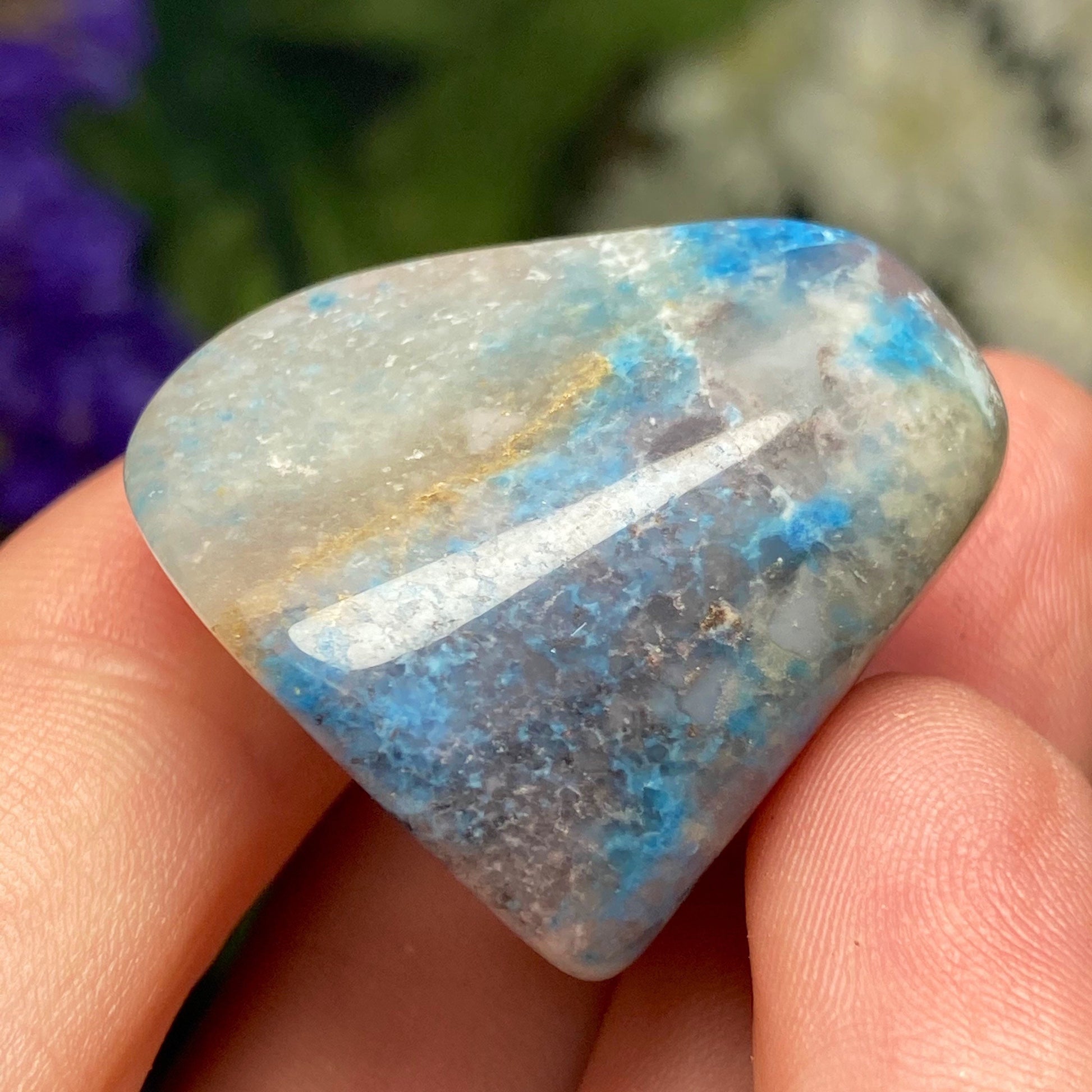 These Trolleite crystals are freeform shapes and have been tumbled to a soft polish. They exhibit spots of stunning blue coloring marbled with grey, taupe, and other neutral tones.