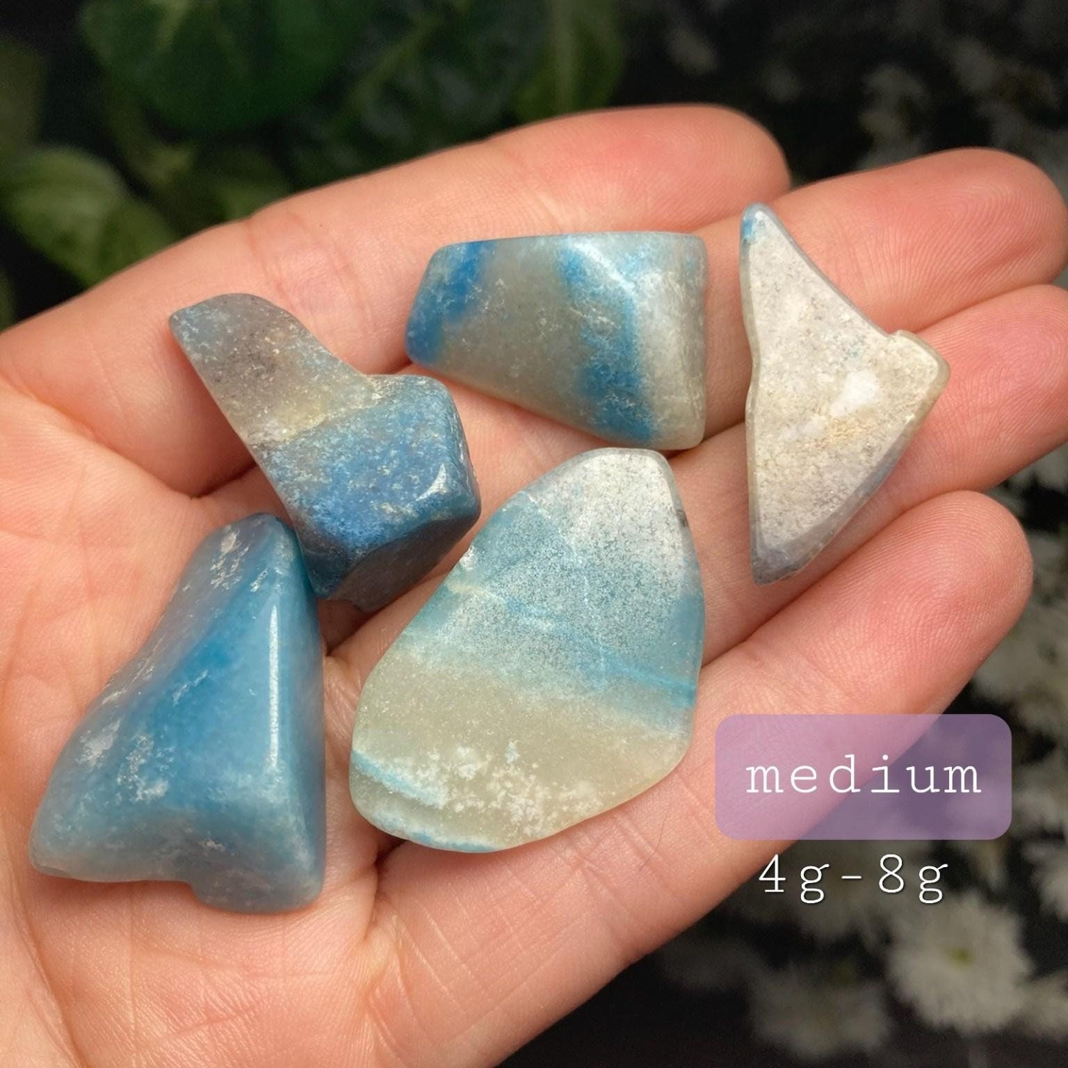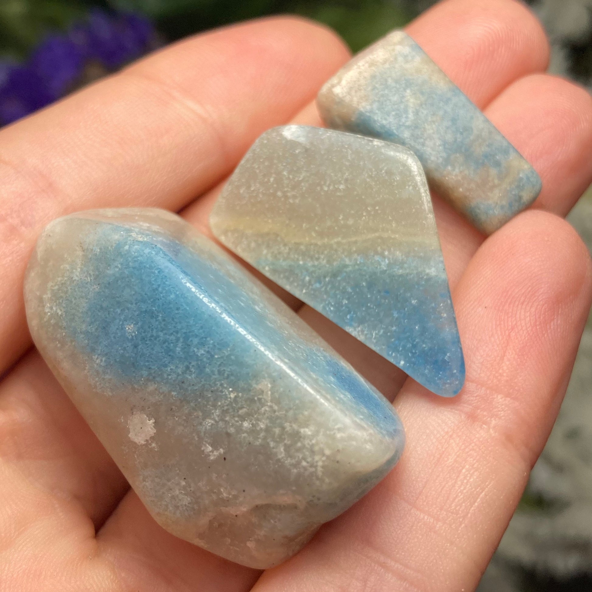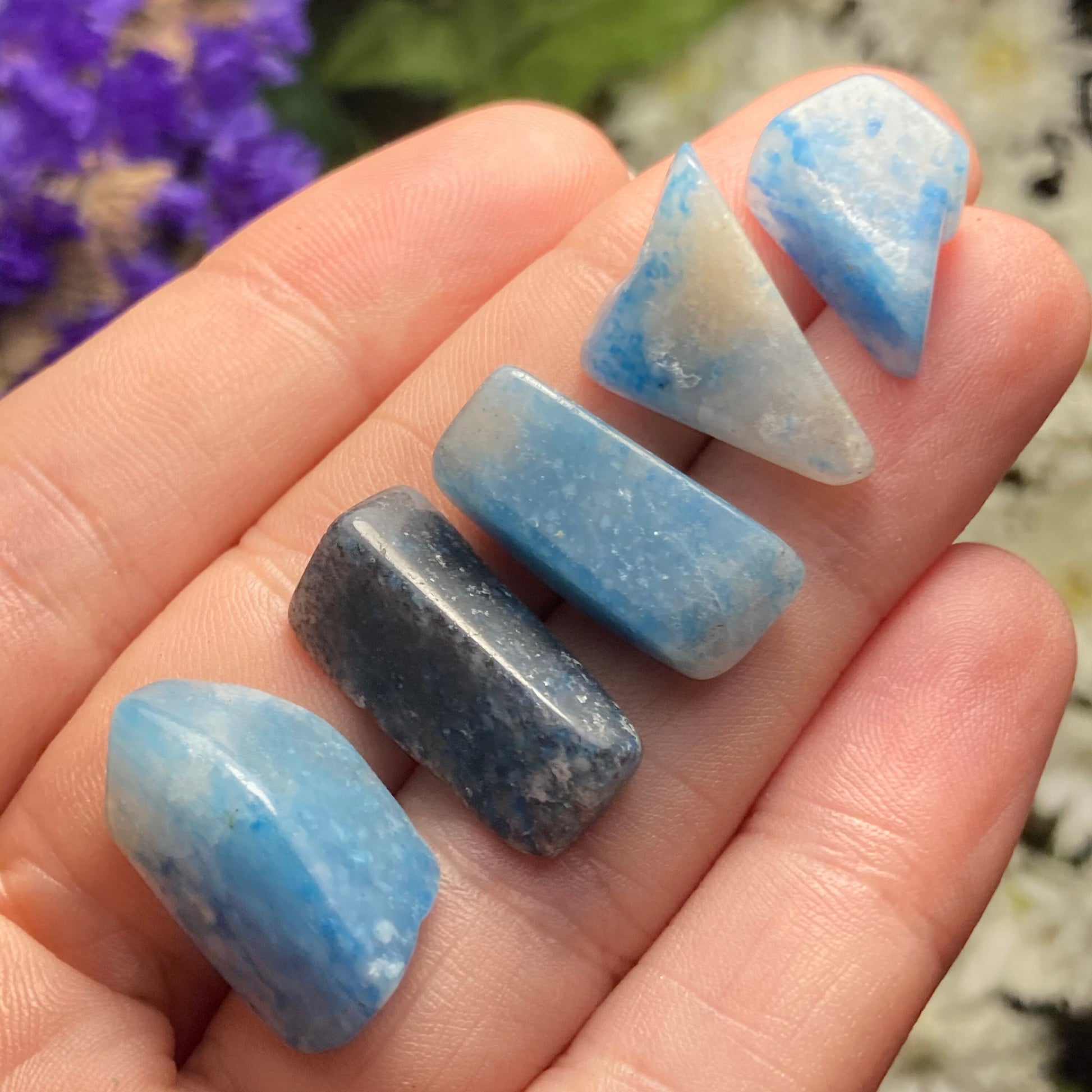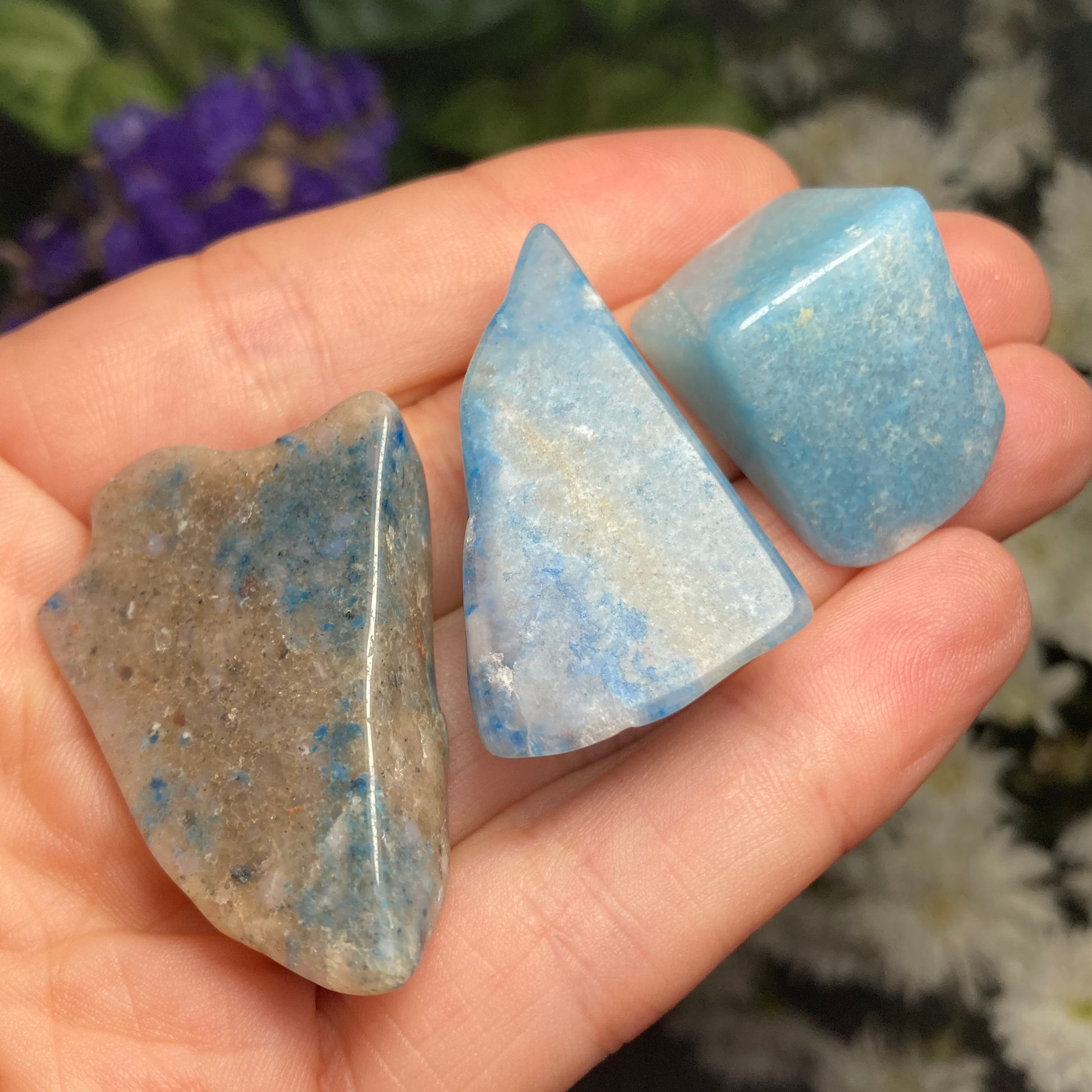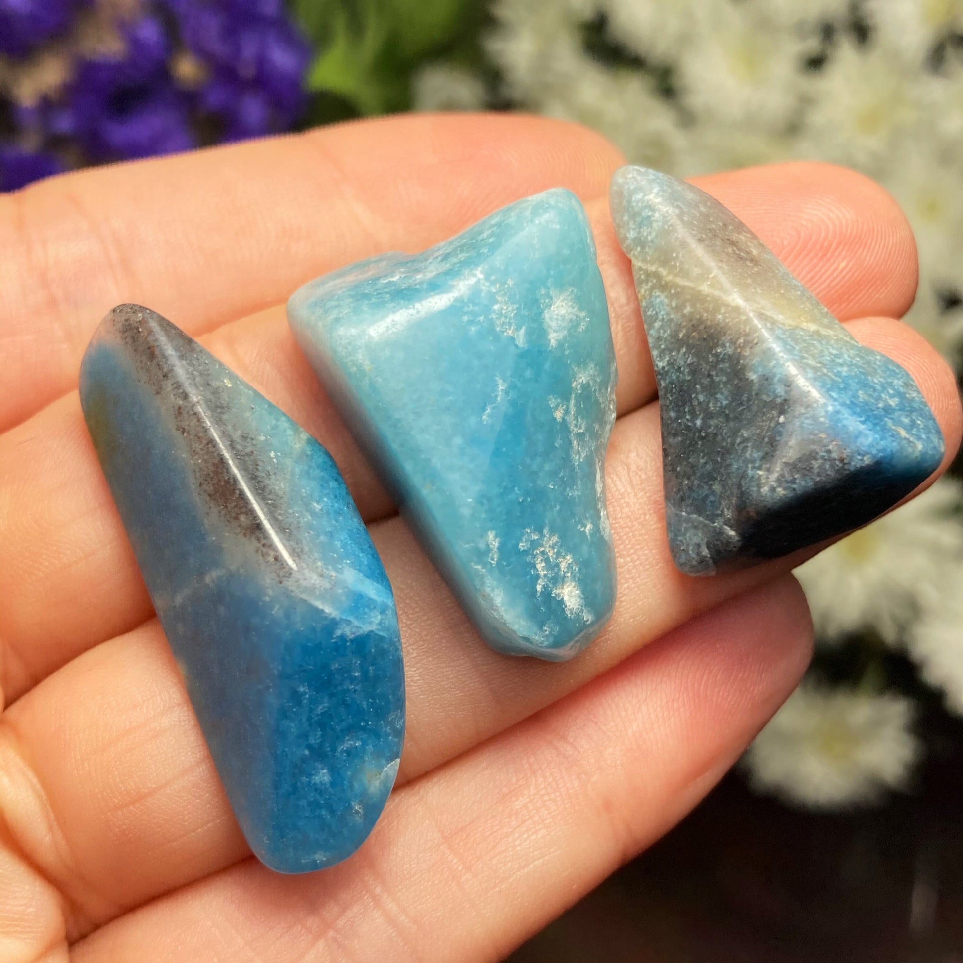 These Trolleite crystals are freeform shapes and have been tumbled to a soft polish. They exhibit spots of stunning blue coloring marbled with grey, taupe, and other neutral tones.