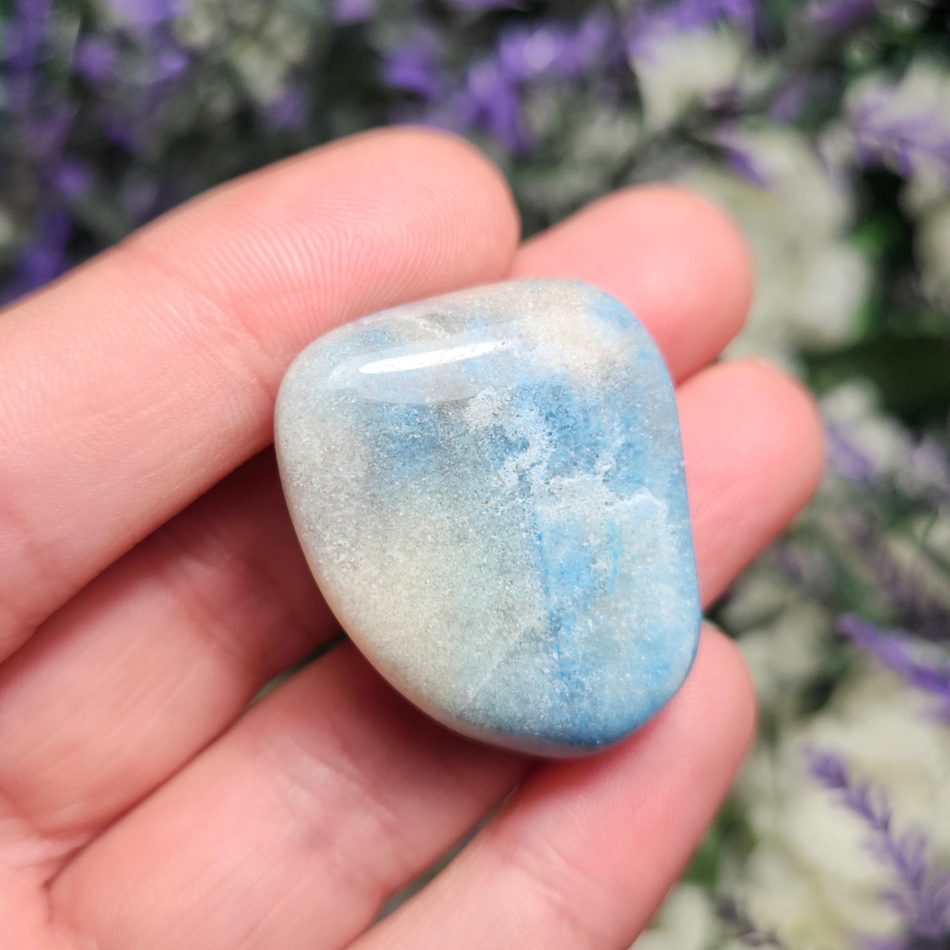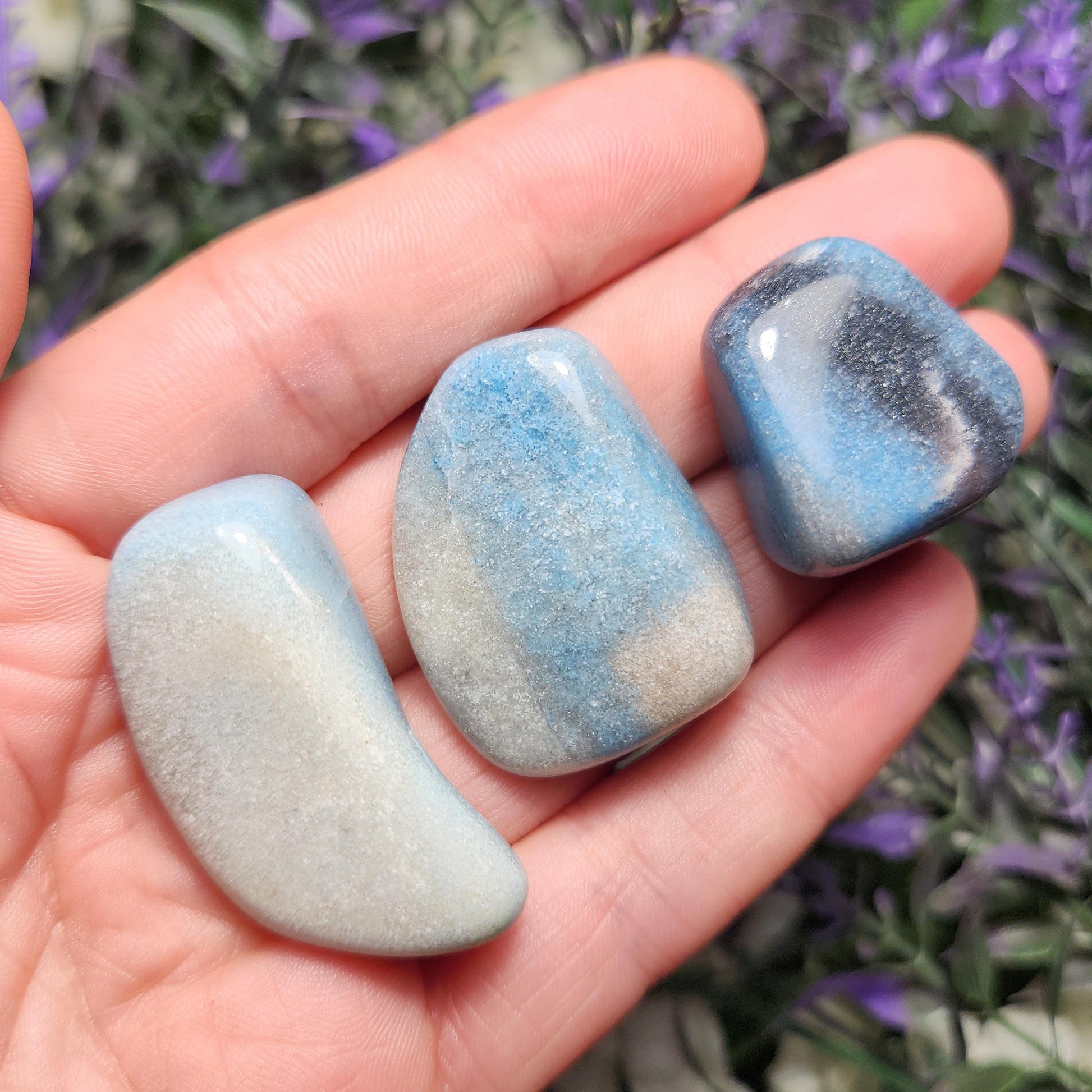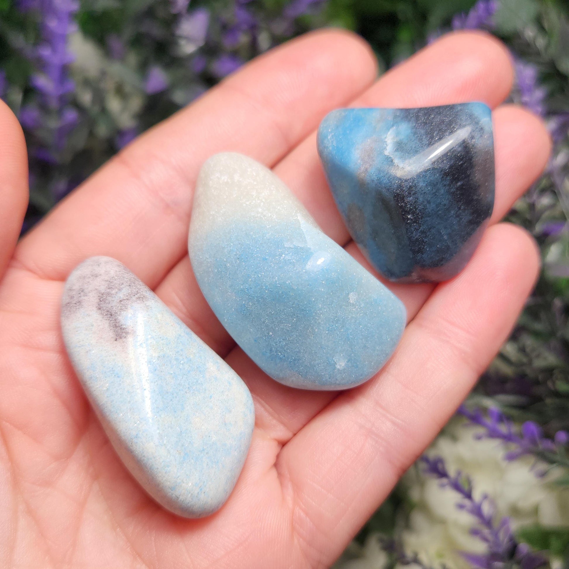 These Trolleite stones have been tumbled to a smooth polish. They exhibit a cool blue coloring marbled with dark grey and creamy taupe.