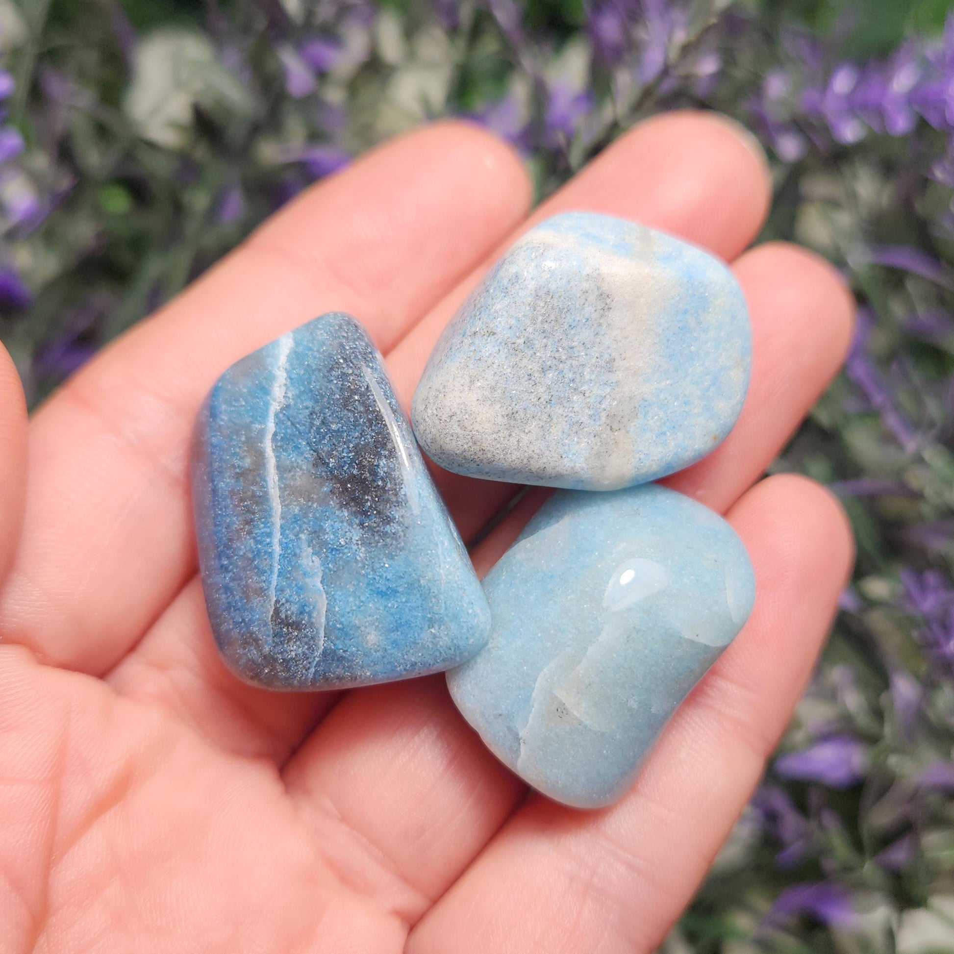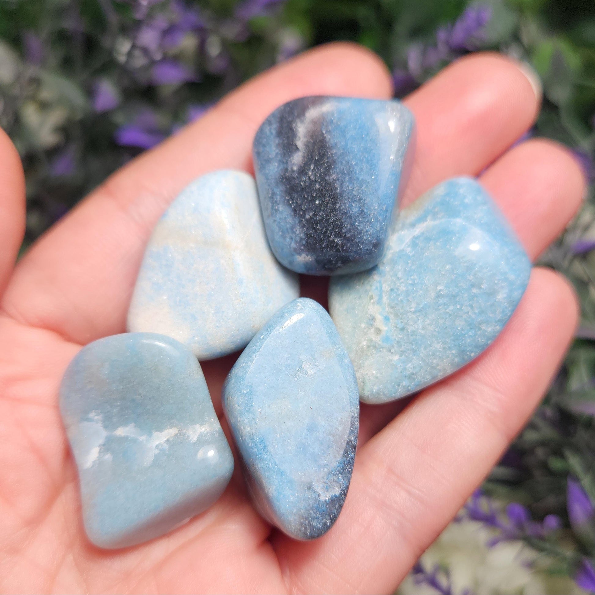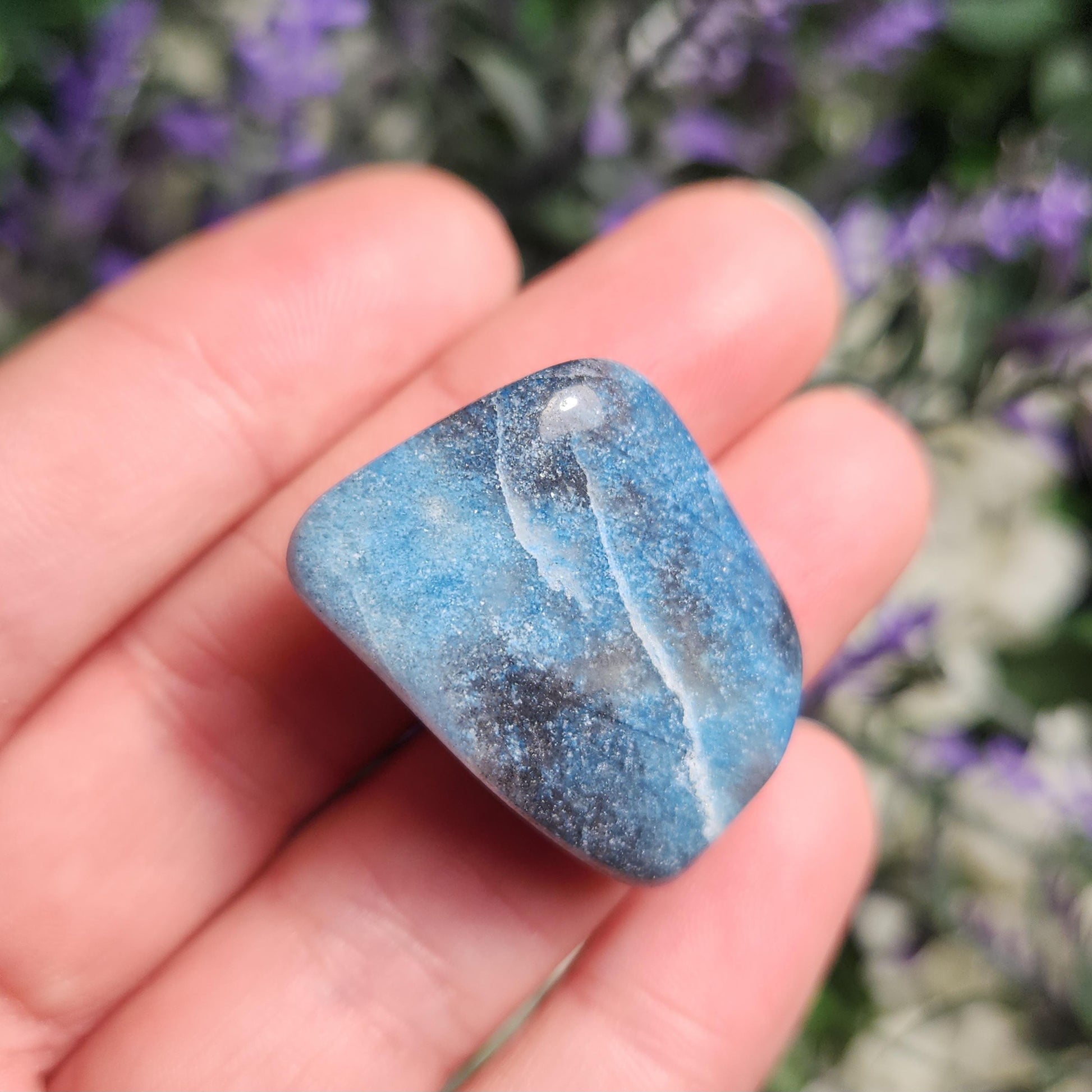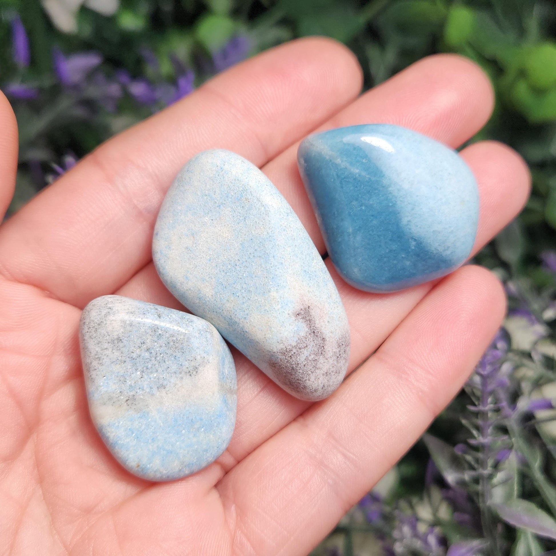These Trolleite stones have been tumbled to a smooth polish. They exhibit a cool blue coloring marbled with dark grey and creamy taupe.