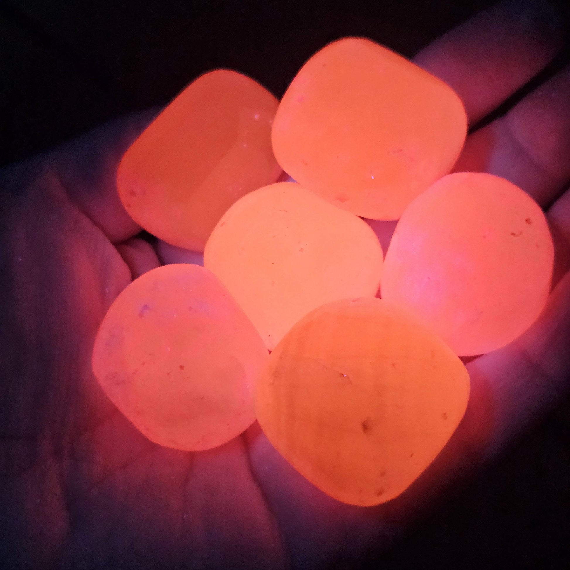 These tumbled Pink Mangano Calcite crystals from Pakistan have a soft, soothing pink color and are carved into rounded, freeform shapes. These crystals glow with a colorful, saturated brilliance when they're under a black light - a rare quality in the mineral kingdom!