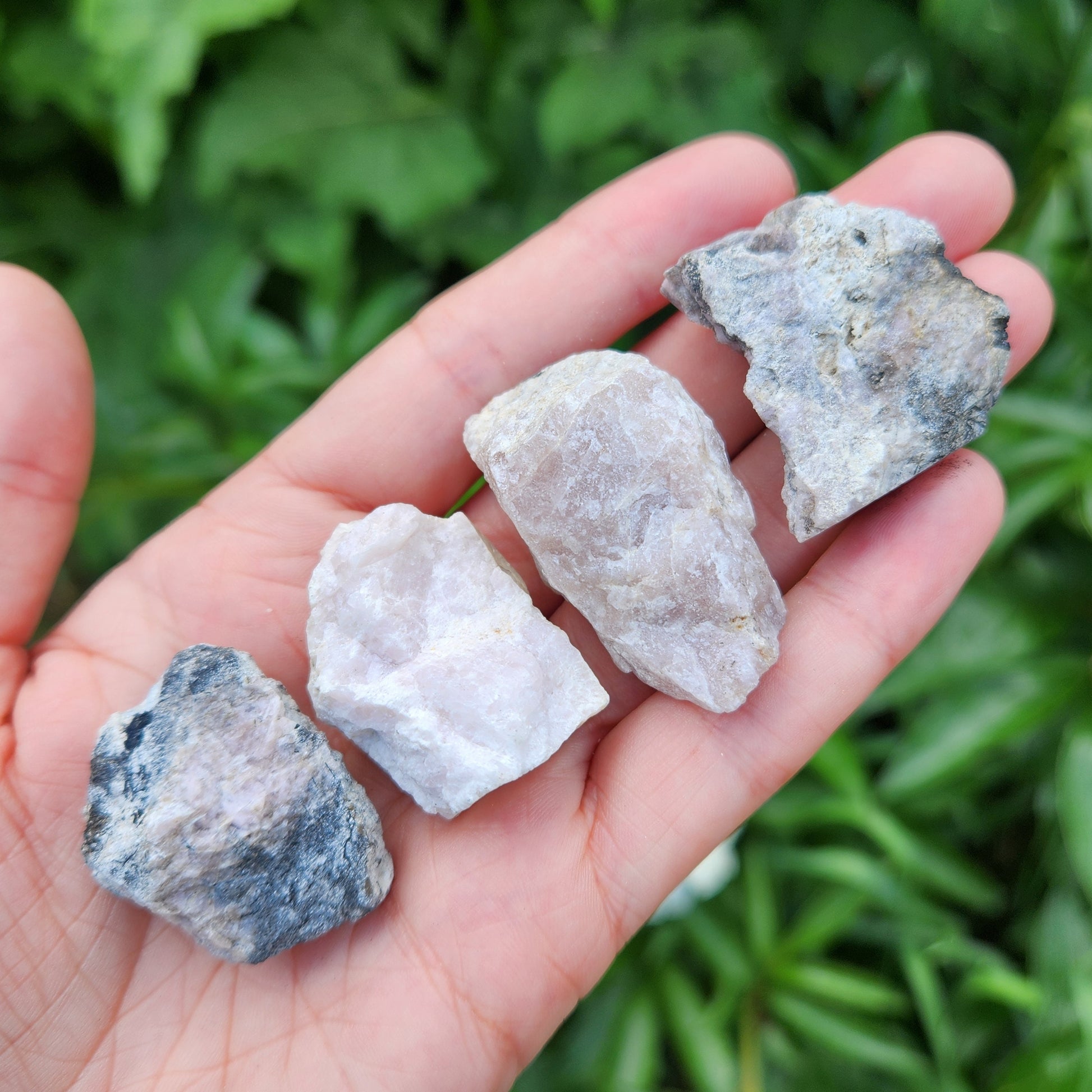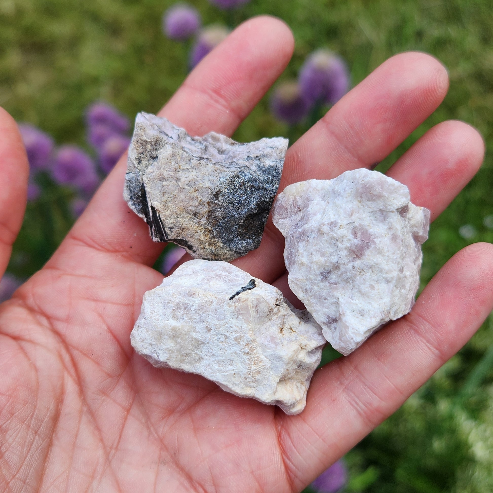 These Ussingite crystals from the Murmansk region are raw and display a taupe coloring with a pink hue that may contain some dark grey mineral inclusions. Each specimen measures between 1 inch and 1.5 inches.