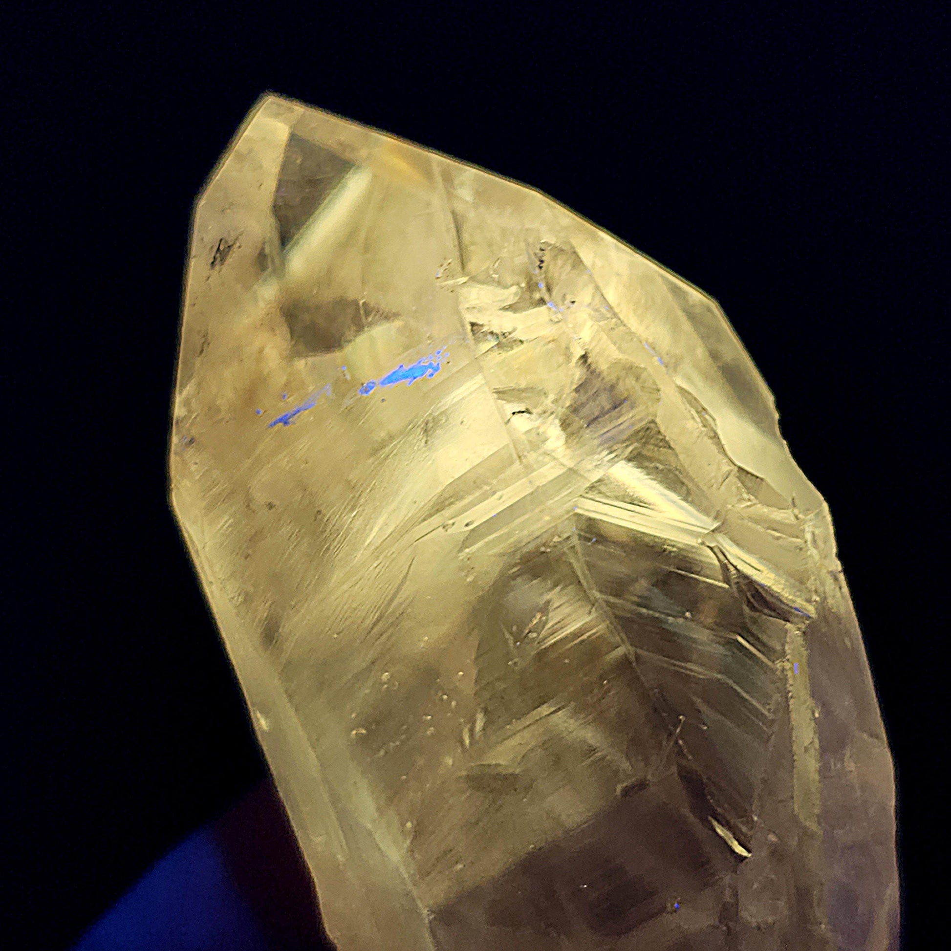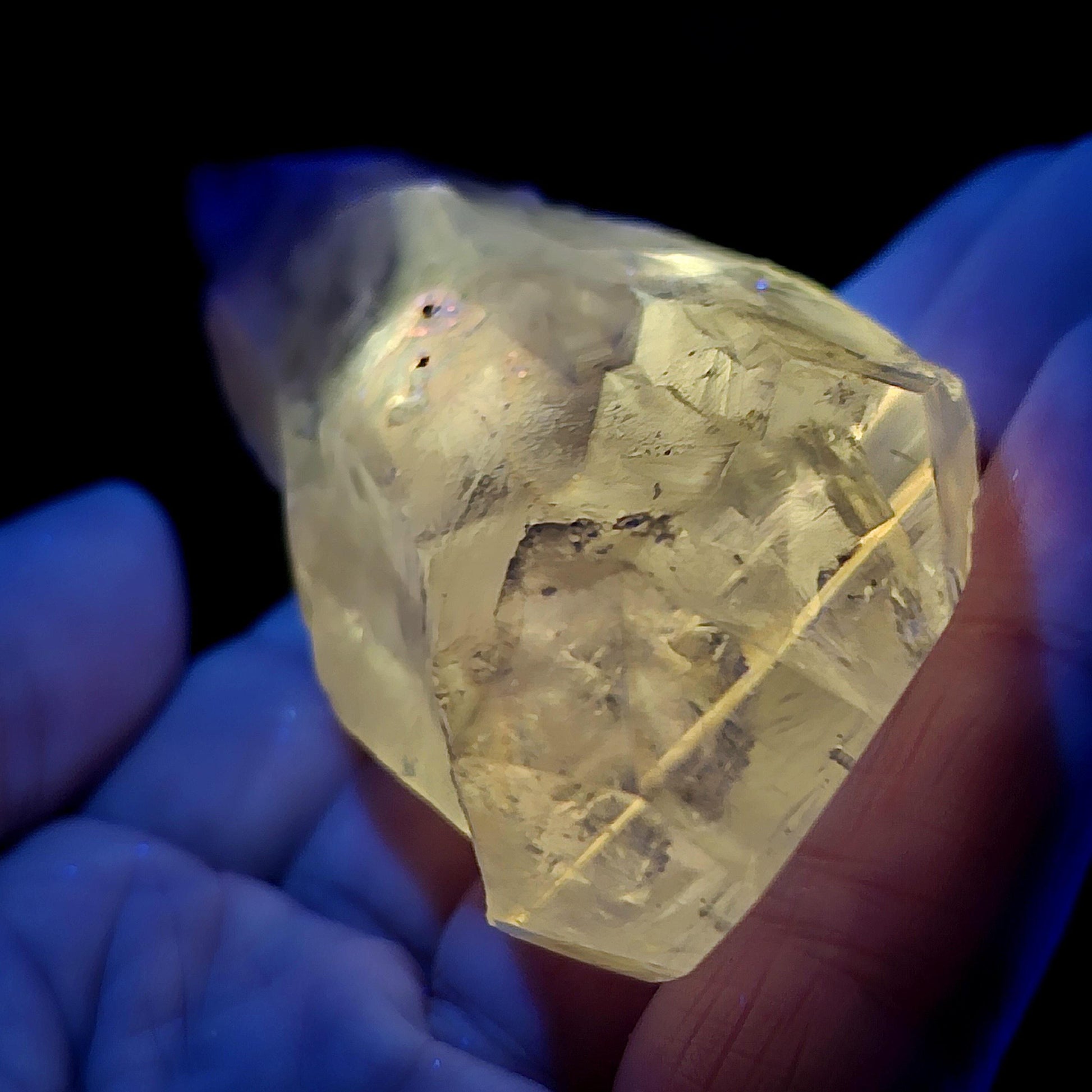 This raw, terminated Quartz crystal holds mysterious, invisible phantoms that pop when exposed to ultraviolet lighting. It exhibits very light hints of purple - not a big purple pop, but a faint lavender hue. When exposed to longwave UV light, these inclusions glow with an electric yellow-orange fire, revealing the phantom structures locked within the crystal, representing preserved echoes of growth. This stone has a terminated point with shining facets and has a textured root that is evidence of growth interference, a natural trait of Quartz. This specimen measures 103mm by 33mm and weighs 100.5 grams.