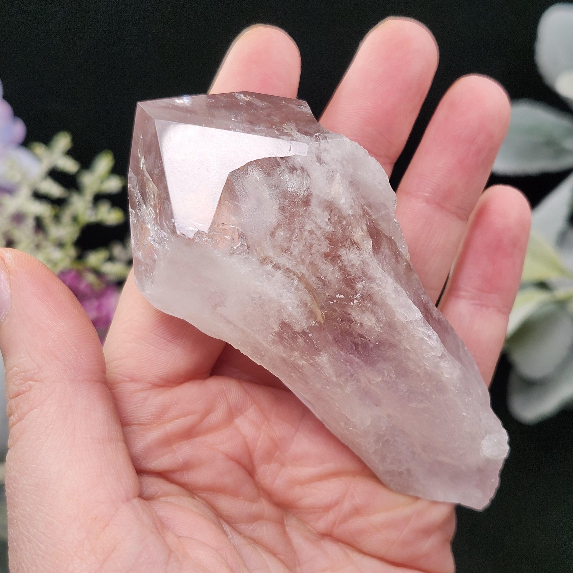 This raw, terminated Quartz crystal holds mysterious, invisible phantoms that pop when exposed to ultraviolet lighting. It exhibit very light hints of purple - not a big purple pop, but a faint lavender hue. When exposed to longwave UV light, the inclusions glow with an electric yellow-orange fire, revealing the phantom structures locked within the crystal like preserved echoes of growth. This stone has a terminated point with shining facets and has a textured root that is evidence of growth interference, a natural trait of Quartz. This specimen measures 98mm by 40mm and weighs 129 grams.