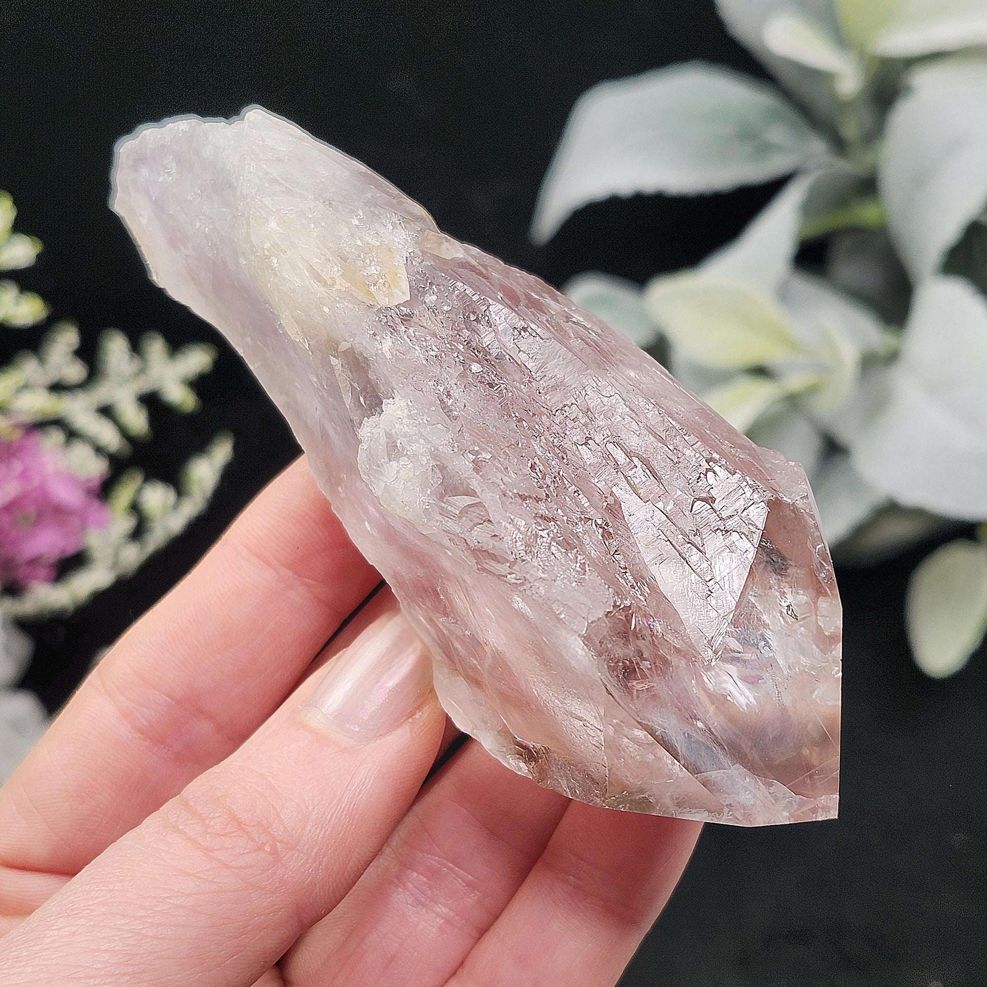 This raw, terminated Quartz crystal holds mysterious, invisible phantoms that pop when exposed to ultraviolet lighting. It exhibit very light hints of purple - not a big purple pop, but a faint lavender hue. When exposed to longwave UV light, the inclusions glow with an electric yellow-orange fire, revealing the phantom structures locked within the crystal like preserved echoes of growth. This stone has a terminated point with shining facets and has a textured root that is evidence of growth interference, a natural trait of Quartz. This specimen measures 98mm by 40mm and weighs 158 grams.
