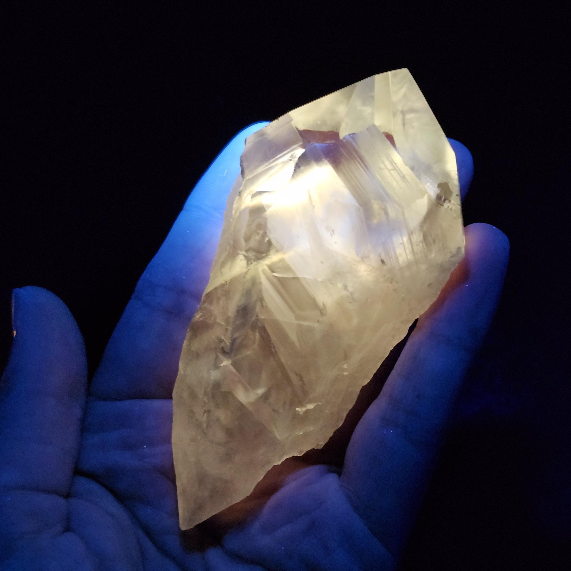 This raw, terminated Quartz crystal holds mysterious, invisible phantoms that pop when exposed to ultraviolet lighting. When exposed to longwave UV light, the inclusions glow with an electric yellow-orange fire, revealing the phantom structures locked within the crystal like preserved echoes of growth. This stone has a terminated point with shining facets and has a textured root that is evidence of growth interference, a natural trait of Quartz. This specimen measures 88mm by 45mm and weighs 138 grams.