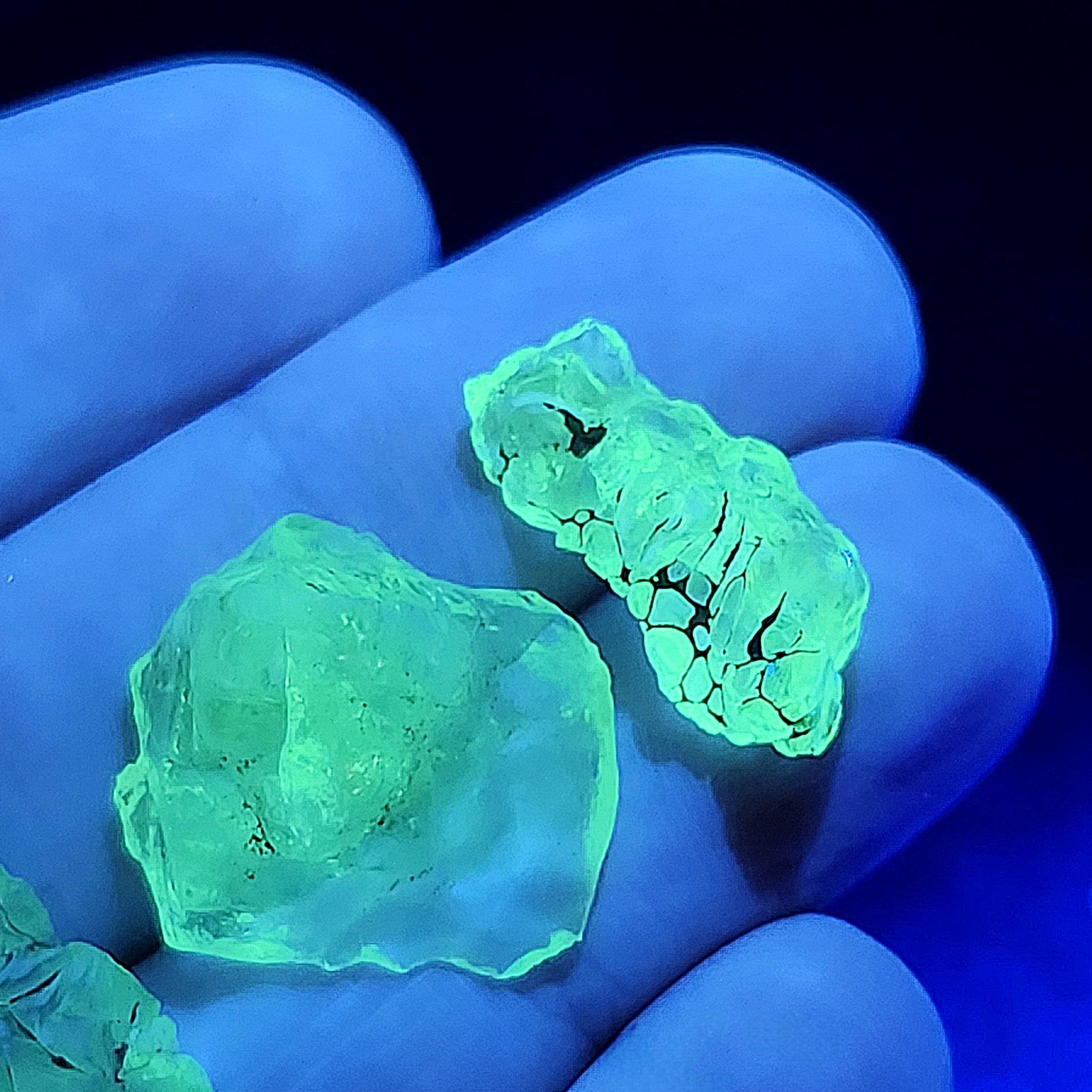 Hyalite is a special, colorless variety of Opal that grows in volcanic formations! Although these Mexican stones do not show typical opalescence, they have their own unique trait - fluorescence! Hyalite contains trace amounts of uranium within its silica structure, causing it to have a bright fluorescent glow. These gemmy, rough Hyalite Opal specimens have a vivid green glow when they're exposed to UV rays and remain translucent crystals in incandescent light. They range in translucence with clear to milky or golden coloring and may contain mineral inclusions.