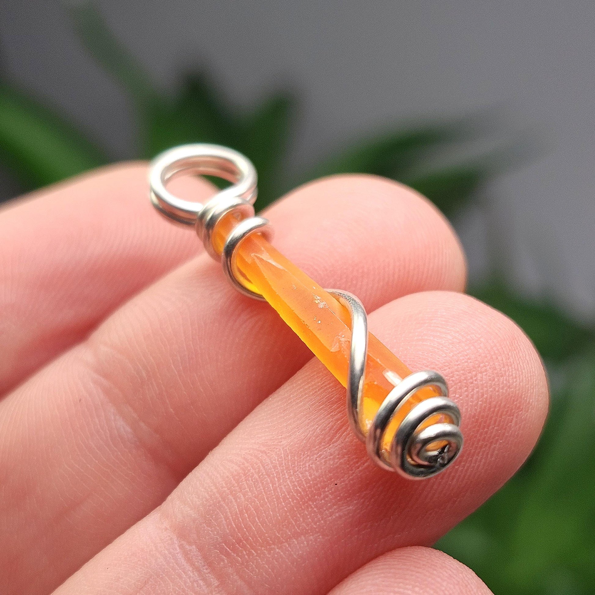 This raw Zincite gemstone exhibits a naturally elongated shape, with shining facets and a bright orange coloring. It glows with a colorful, saturated brilliance when under a black light - a rare quality in the mineral kingdom! This crystal was custom created into a sturdy piece of jewelry using .925 Sterling Silver. This pendant measures approximately 32mm by 6mm. The silver chain used in the photos is to help envision how this pendant will look while adorned but is not included in the listing.