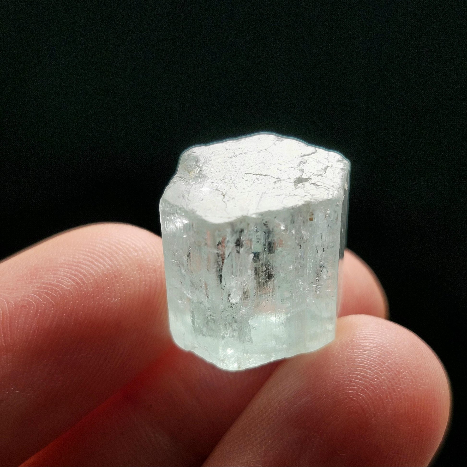 This terminated Vanadium-bearing Beryl crystal from Nigeria displays a pale blue hue with a gemmy translucence. This specimen measures approximately 15mm by 14mm by 11mm and weighs 5.5 grams.