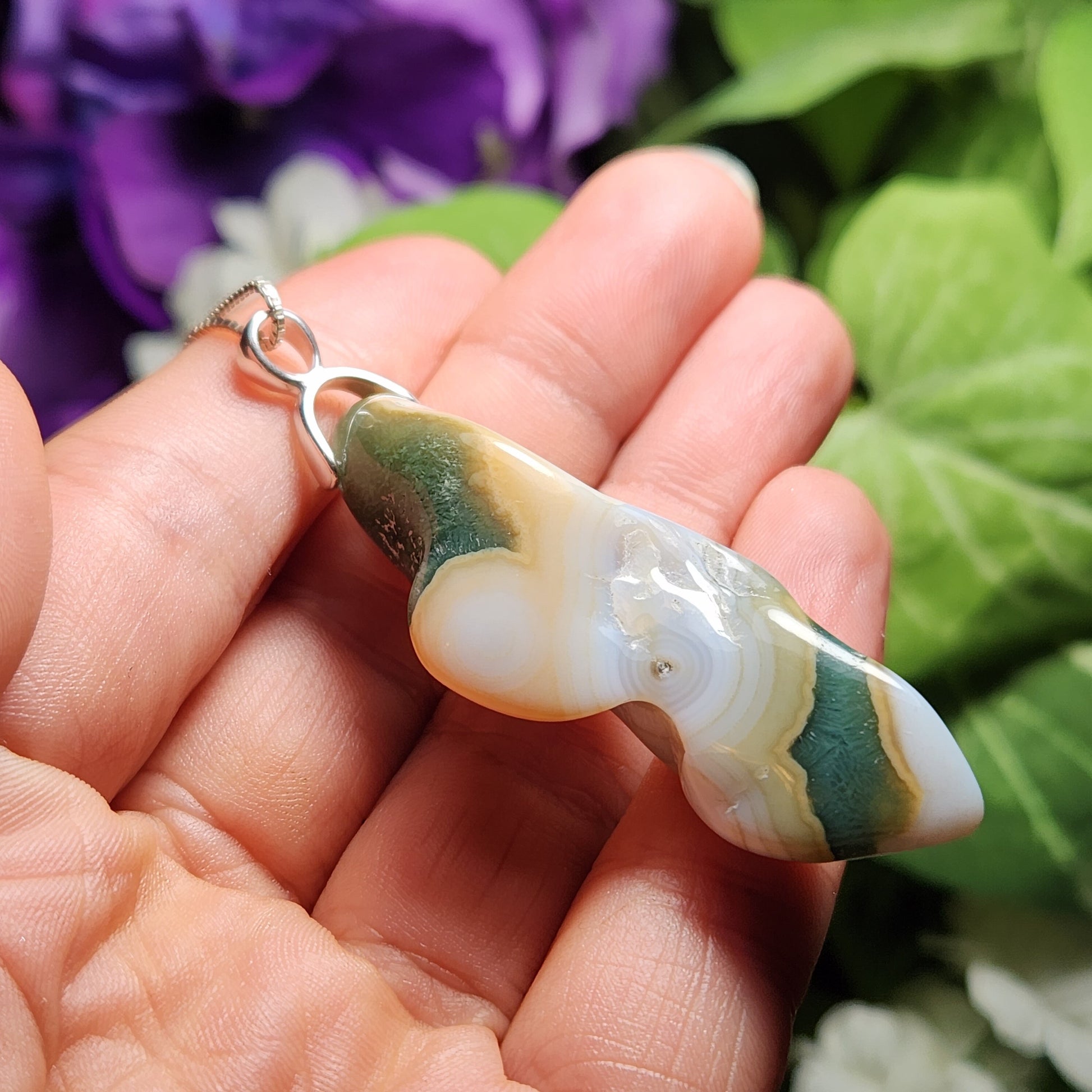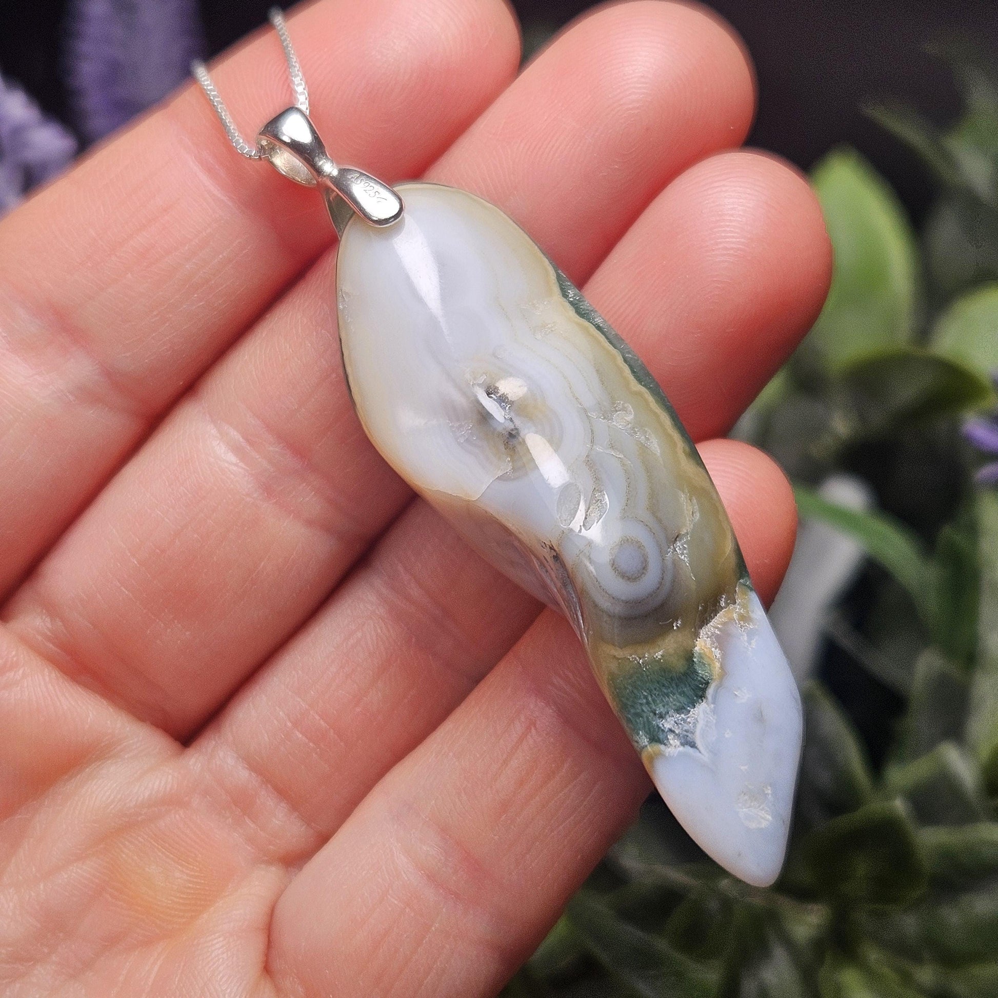 This now mined out vein (Vein 8) of Ocean Jasper contains a beautiful array of colors and breathtaking orbicular patterns! This polished stone has a unique shape and showcased dark green mixed with taupe and creamy white. This crystal has been handpicked and processed into an intentional piece of jewelry using .925 Sterling Silver. This pendant measures approximately 55mm by 15mm. The silver chain used in the photos is to help envision how this pendant will look while adorned but is not included in the listing.