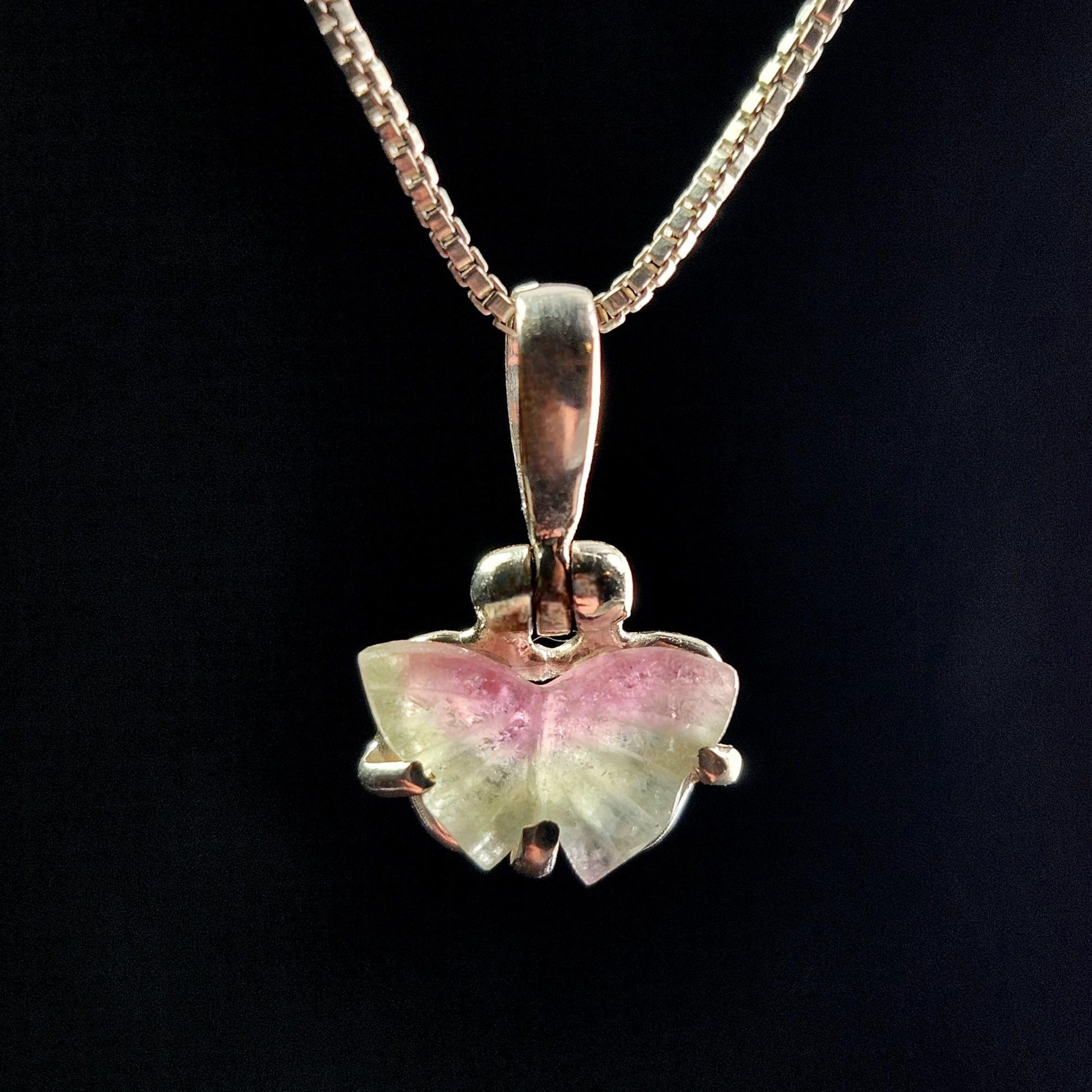 This Watermelon Tourmaline gemstone displays pastel green with pink and has been carved into a petite butterfly shape. This crystal has been custom created into sturdy piece of jewelry using .925 Sterling Silver. This pendant measures approximately 15mm by 10mm. The silver chain used in the photos is to help envision how this pendant will look while adorned but is not included in the listing.