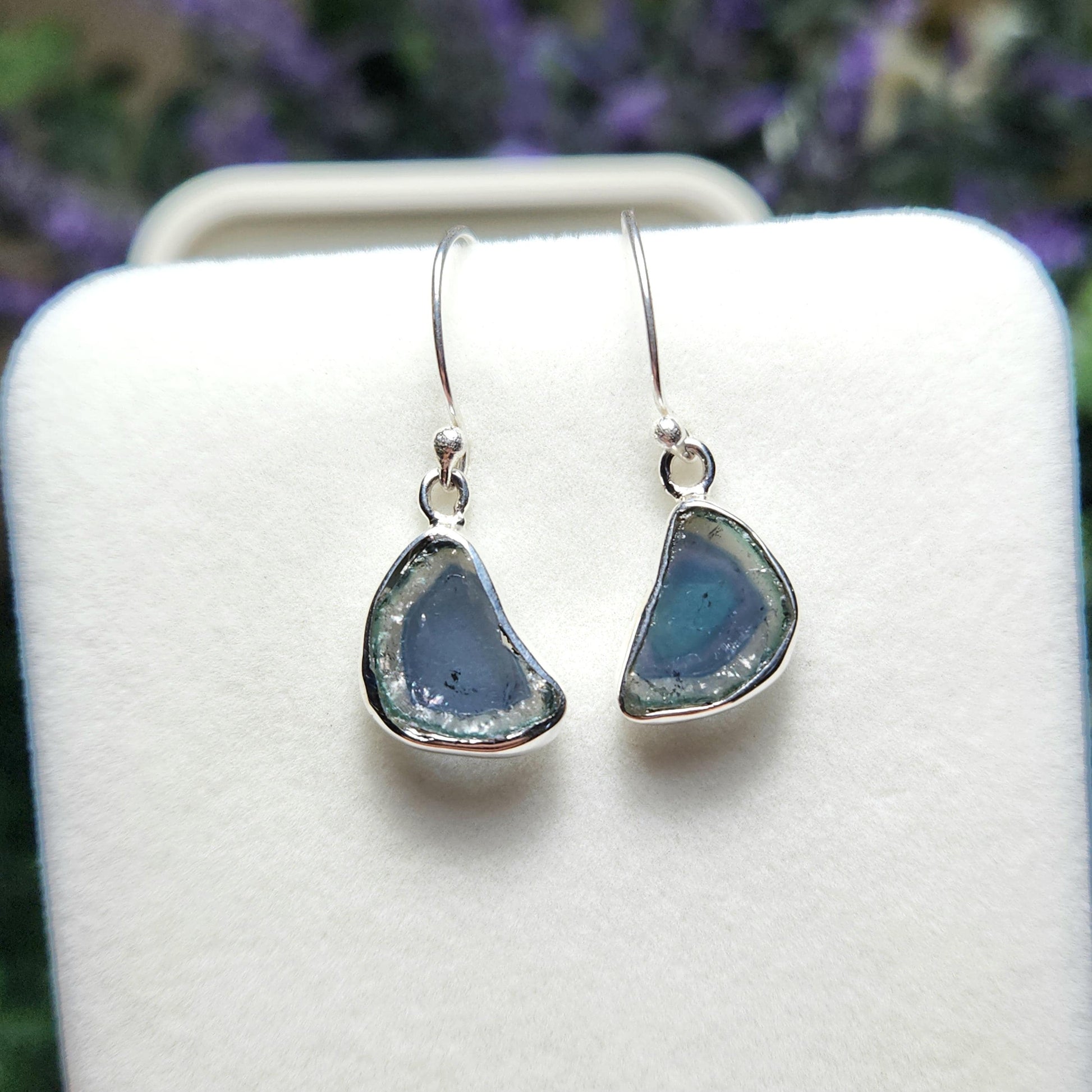 These polished Watermelon Tourmaline slices exhibit an excellent, gemmy translucence with pale hues of pink, blue, and green. These crystals have been custom created into bezel set dangle earrings using .925 Sterling Silver. These gemstone slices each measure approximately 14mm by 10mm - this measurement does not include the fishhook findings. The white jewelry box pictured is to help present these earrings and is not included in this listing.
