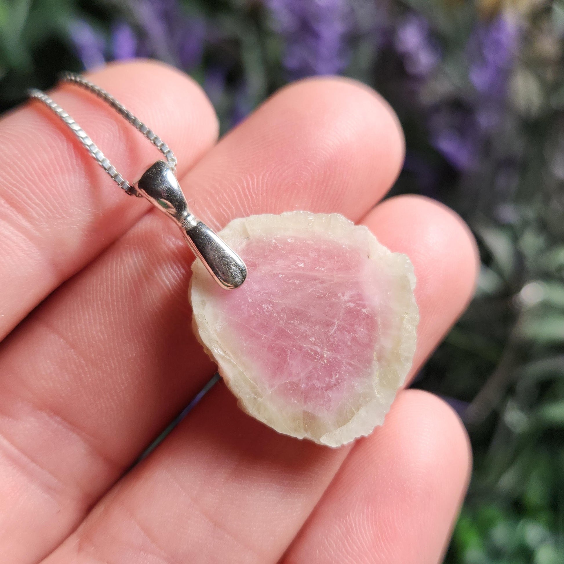 This Watermelon Tourmaline gemstone slice displays light, pastel green bordering a pink center and has shining striations on its raw sides. It reveals a slight translucence when backlit. This crystal has been custom created into a sturdy piece of jewelry using .925 Sterling Silver. This pendant measures approximately 29mm by 20mm. The silver chain used in the photos is to help envision how this pendant will look while adorned but is not included in the listing.
