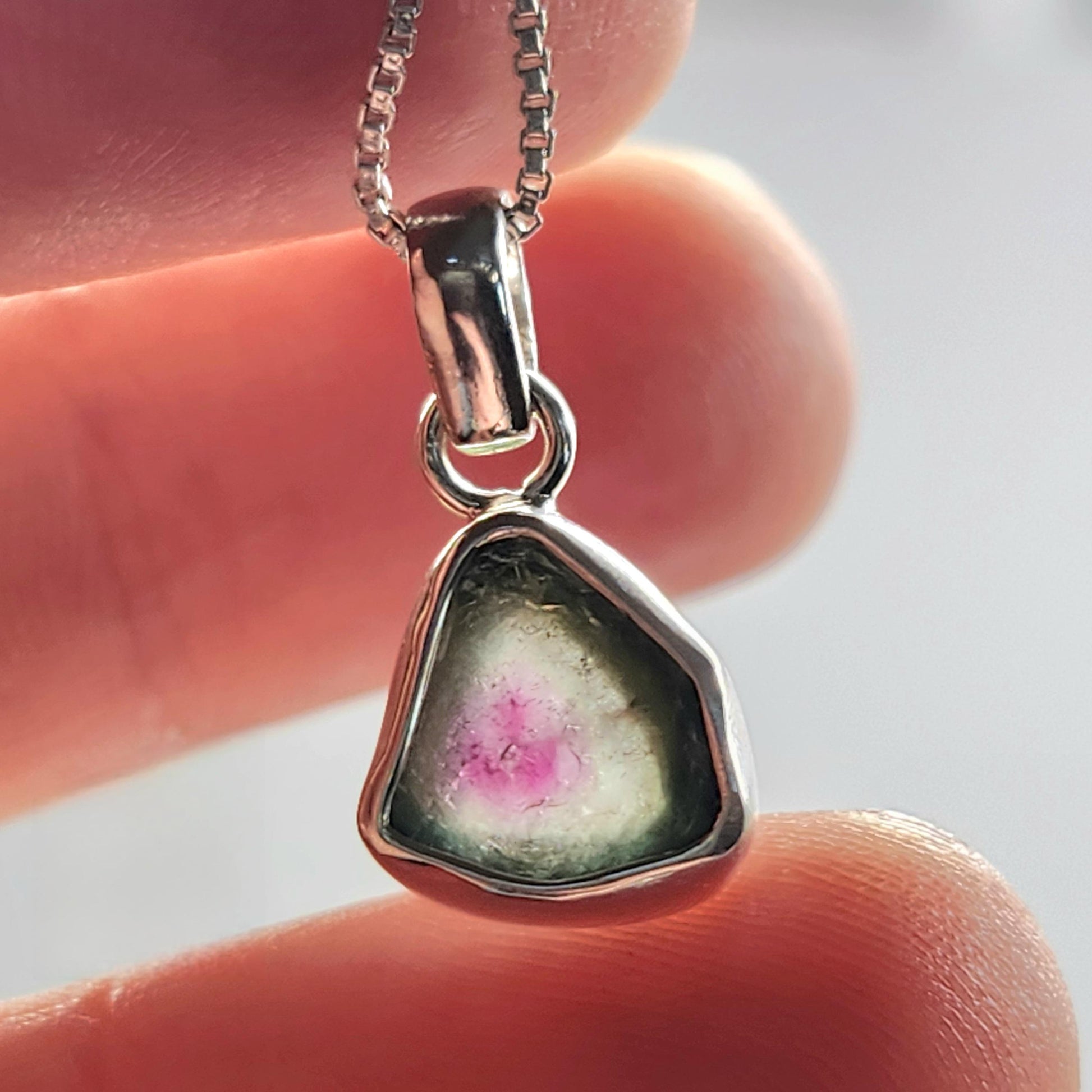 This Watermelon Tourmaline gemstone slice displays juicy pink centered in the middle of a green border. This crystal has been custom created into a sturdy piece of jewelry using .925 Sterling Silver. This pendant measures approximately 19mm by 9mm. The silver chain used in the photos is to help envision how this pendant will look while adorned but is not included in the listing.