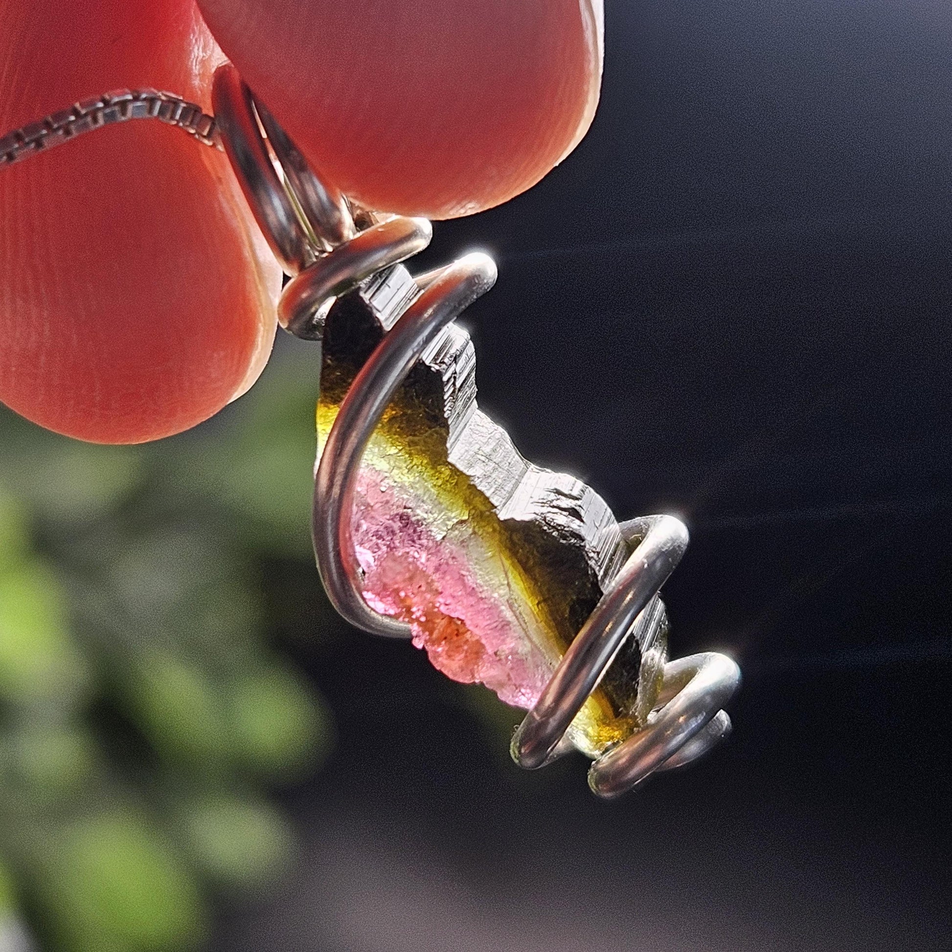 This raw Watermelon Tourmaline gemstone displays juicy pink centered in the middle of a green border. It contains rough natural faces and exhibits striations on one side. This crystal has been custom created into a sturdy piece of jewelry using .925 Sterling Silver. This handmade pendant measures approximately 27mm by 10mm. The silver chain used in the photos is to help envision how this pendant will look while adorned but is not included in the listing.