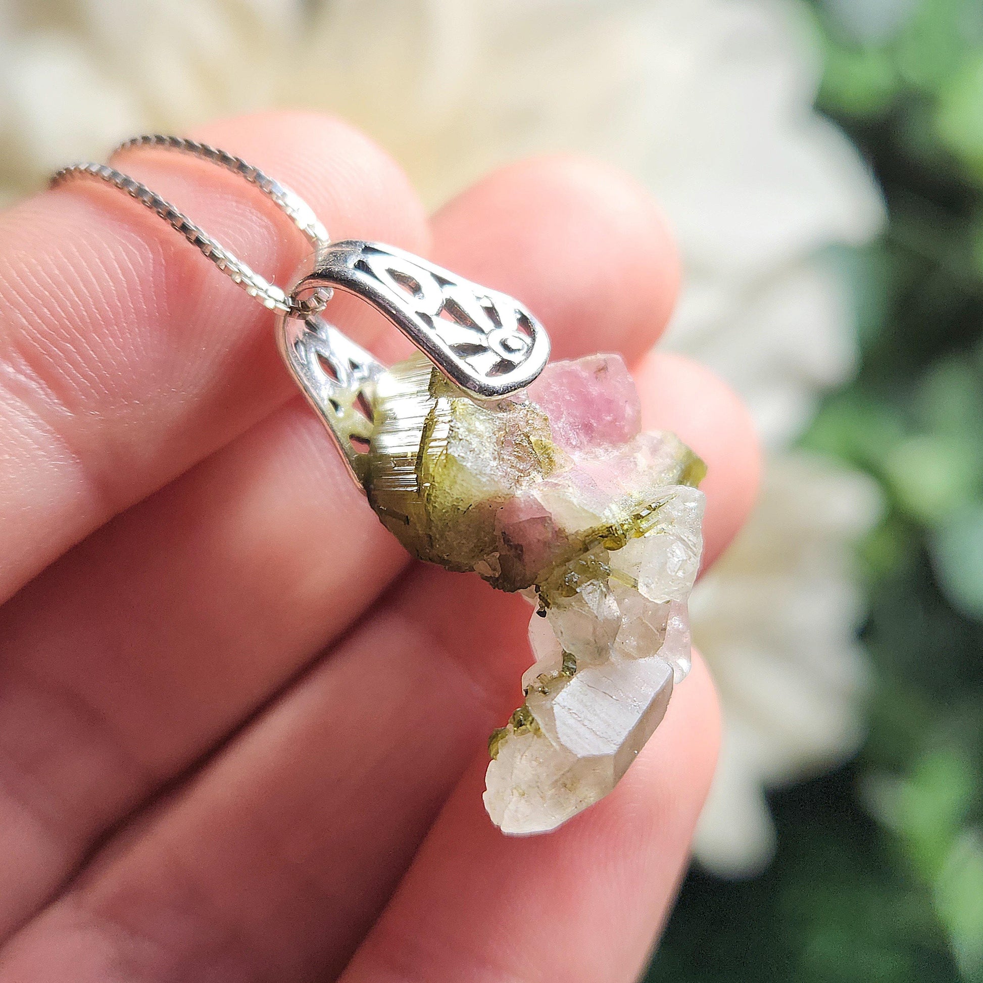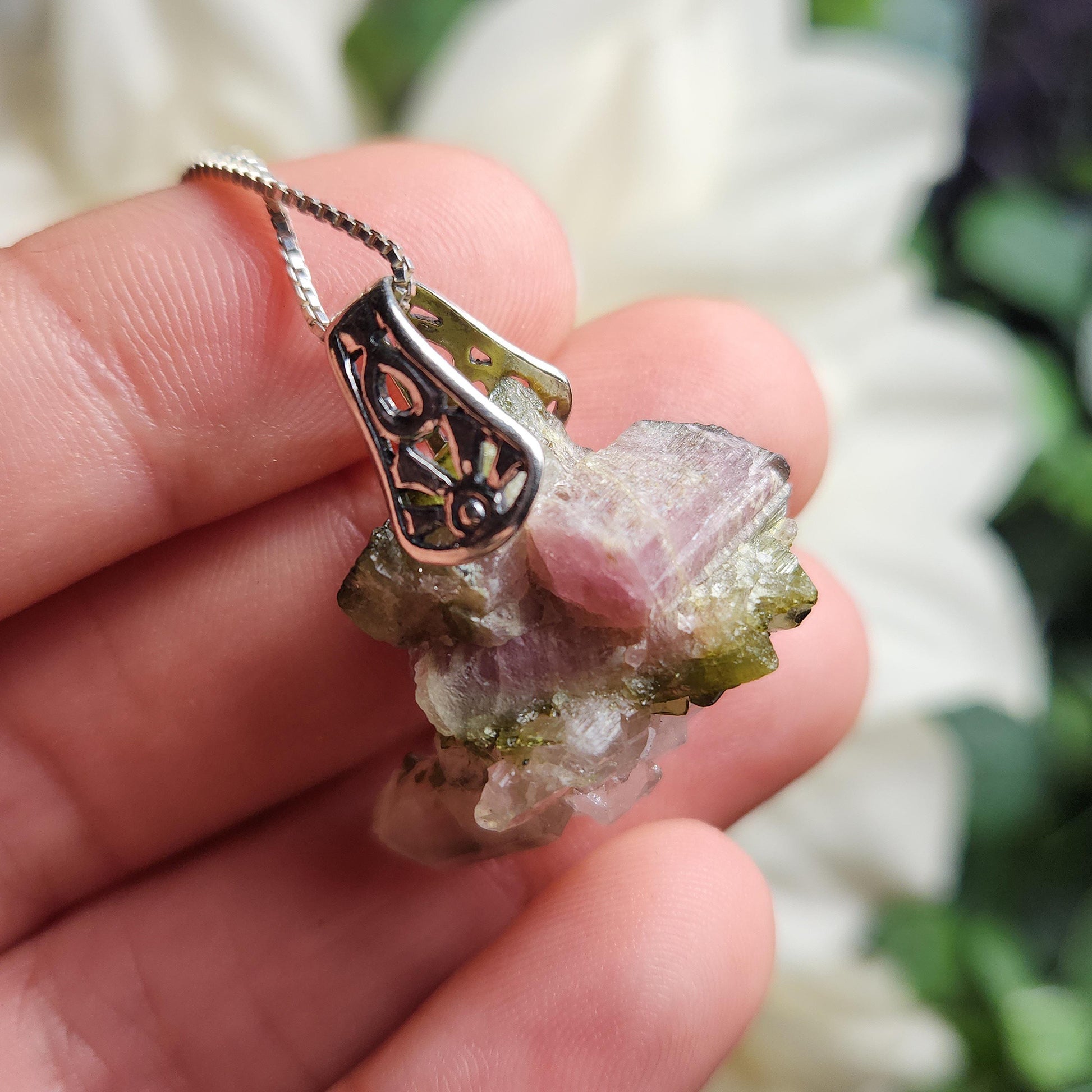 This cluster of Quartz and Watermelon Tourmaline exhibits a variety of natural characteristics including a terminated point and shining striations. The dark green wraps around the soft pink Tourmaline, and the Quartz glows with a crisp clarity. This crystal was custom created into a sturdy piece of jewelry using .925 Sterling Silver. This pendant measures approximately 29mm by 27mm. The silver chain used in the photos is to help envision how this pendant will look while adorned but is not included in the listing.